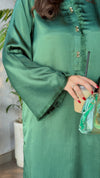 A green co-ord set tailored from premium silk, with gold buttons and fringe on all over the shirt and pants. The outfit is completed with palazzo pants with fringe detail.