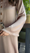 straight shirt with palazzo pants, wooden buttons on neckline and fringe on sleeves, daman and pants.