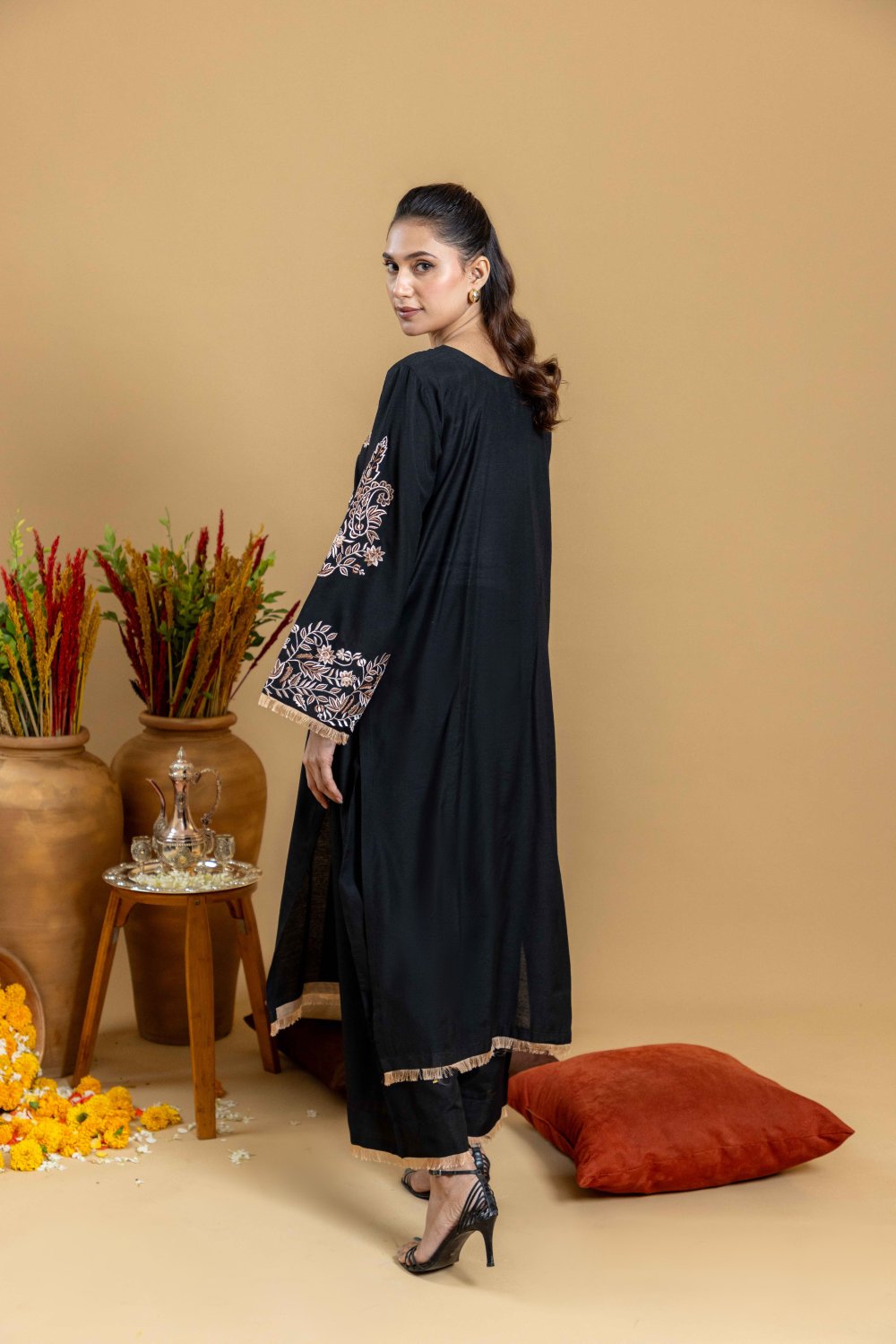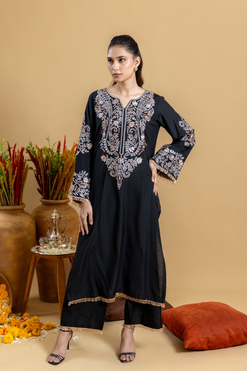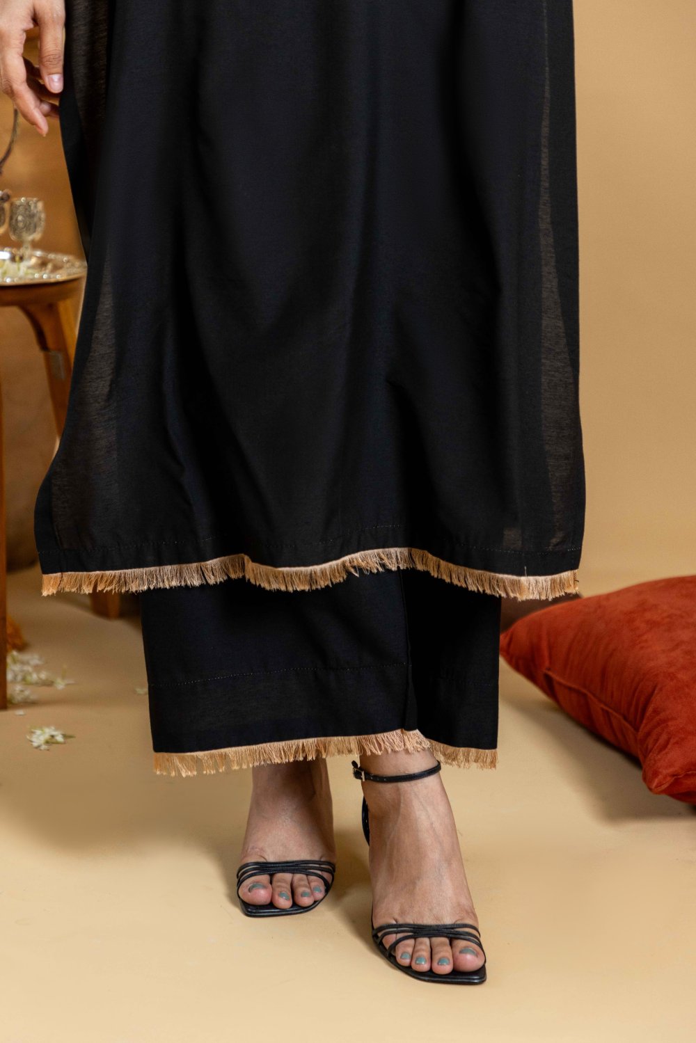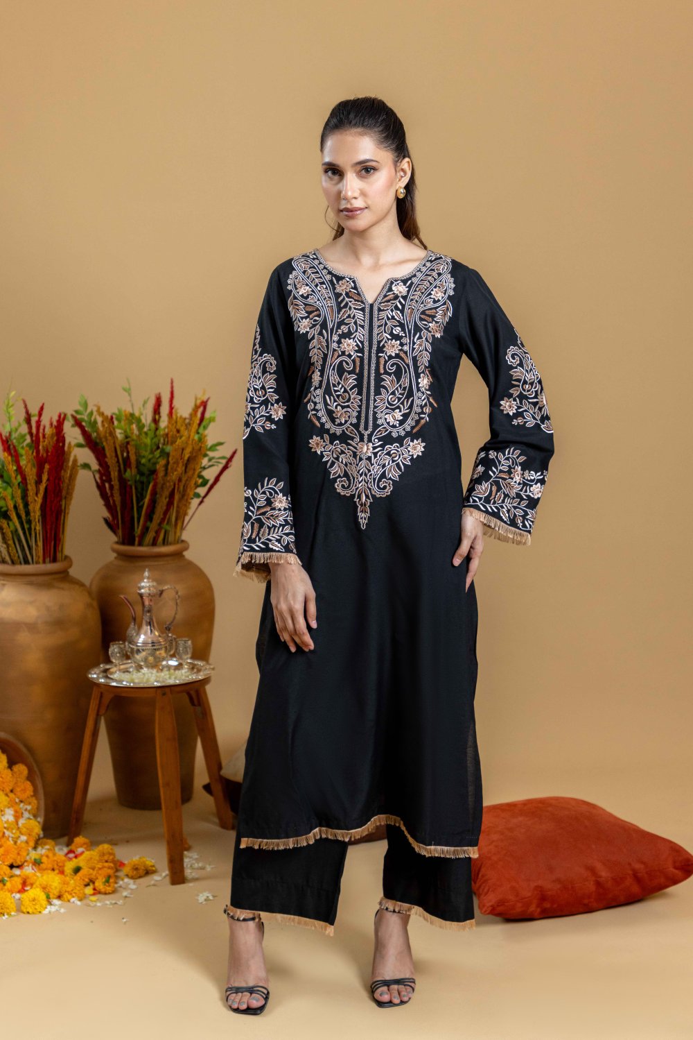 This black soft viscose silk 2-piece blends light fabric with bold elegance. Heavy embroidery highlights the gala and sleeves, while contrast thread detailing adds a refined touch to the plazo set.