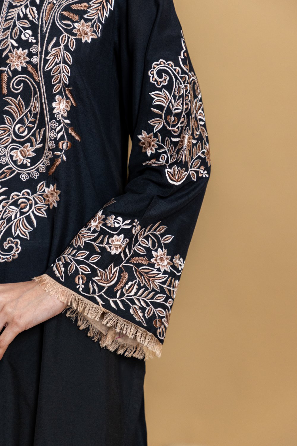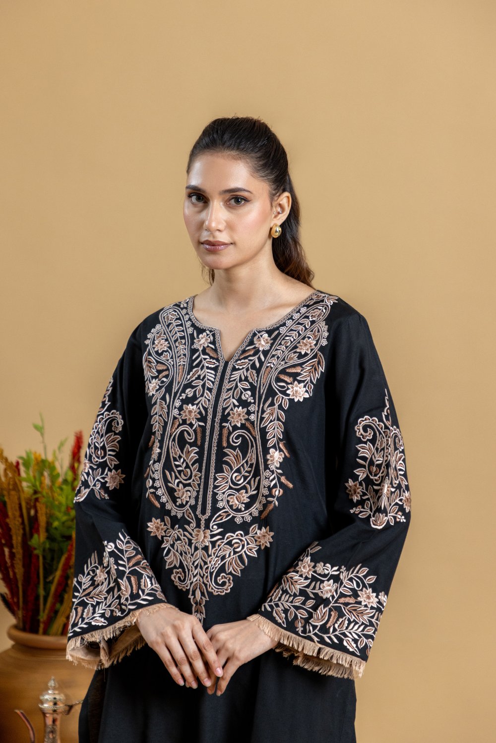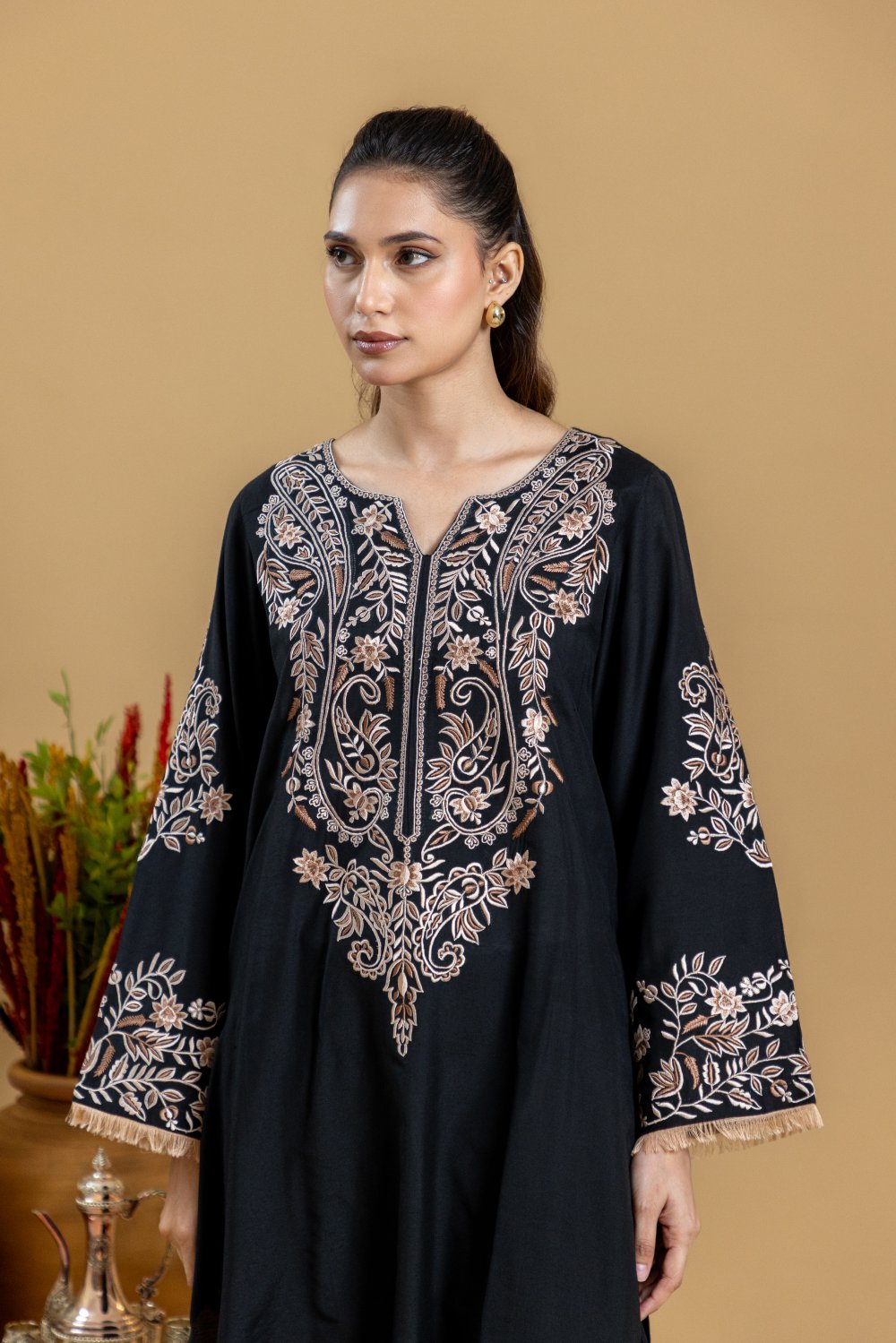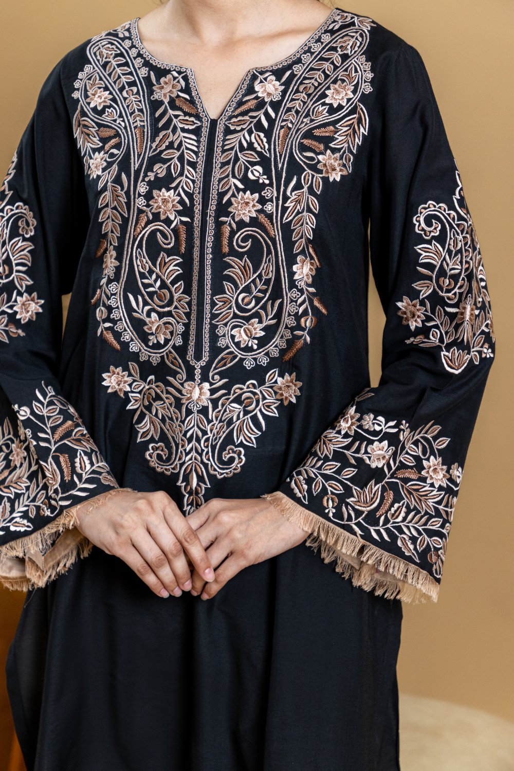 This black soft viscose silk 2-piece blends light fabric with bold elegance. Heavy embroidery highlights the gala and sleeves, while contrast thread detailing adds a refined touch to the plazo set.