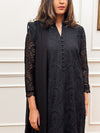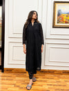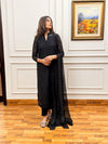 This black long shirt with straight trousers is stitched in embroidered chiffon fabric, giving it a light and graceful feel. The colllar neckline adds subtle sophistication, while the matching chiffon dupatta completes the look.