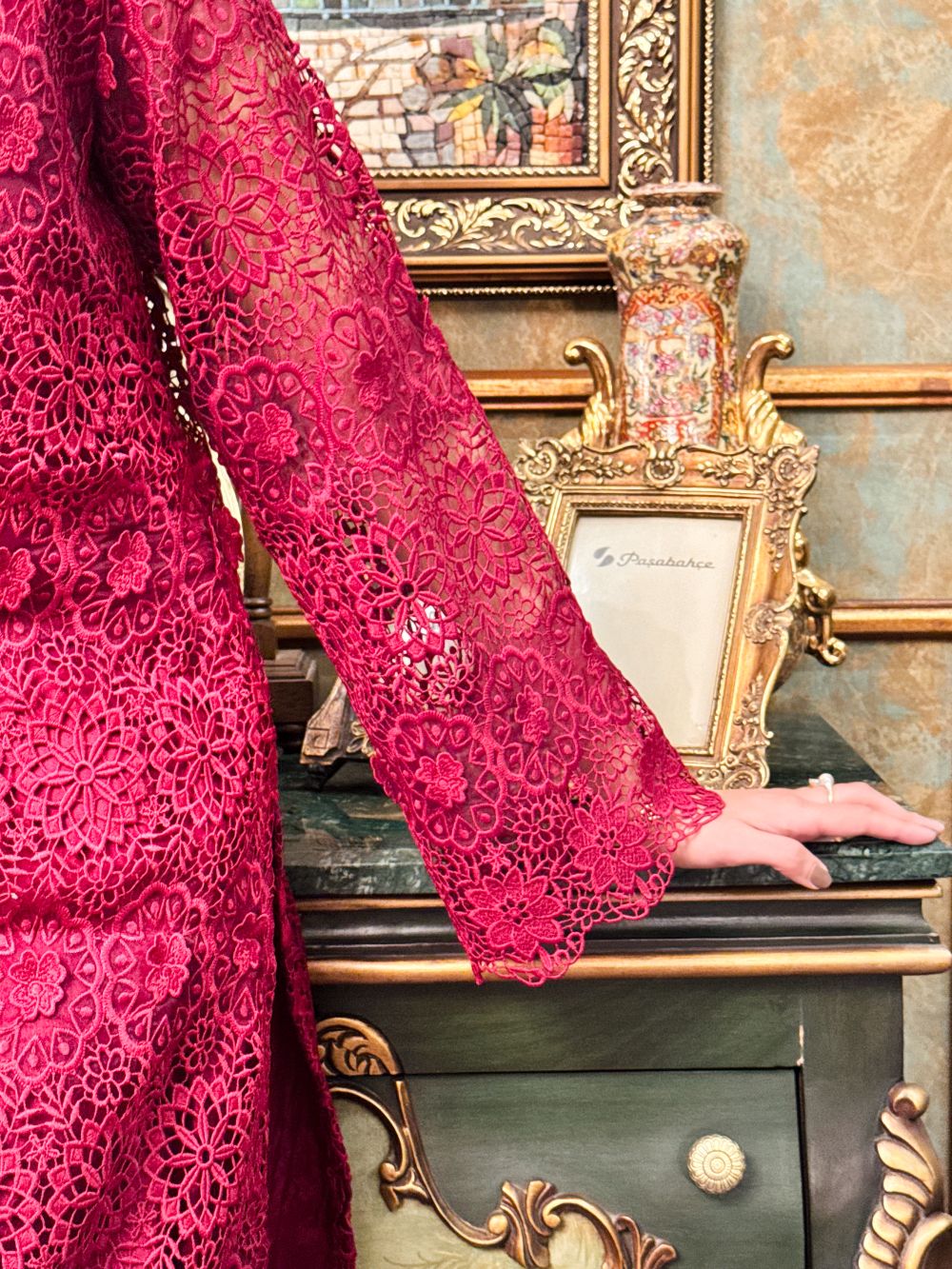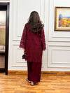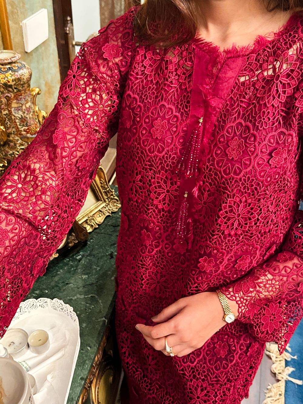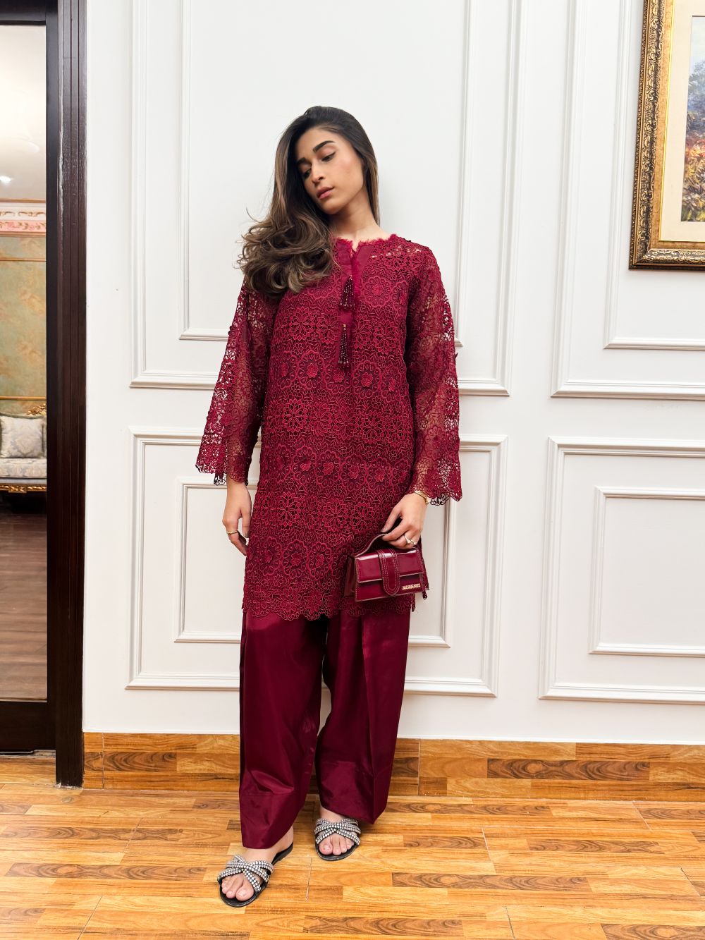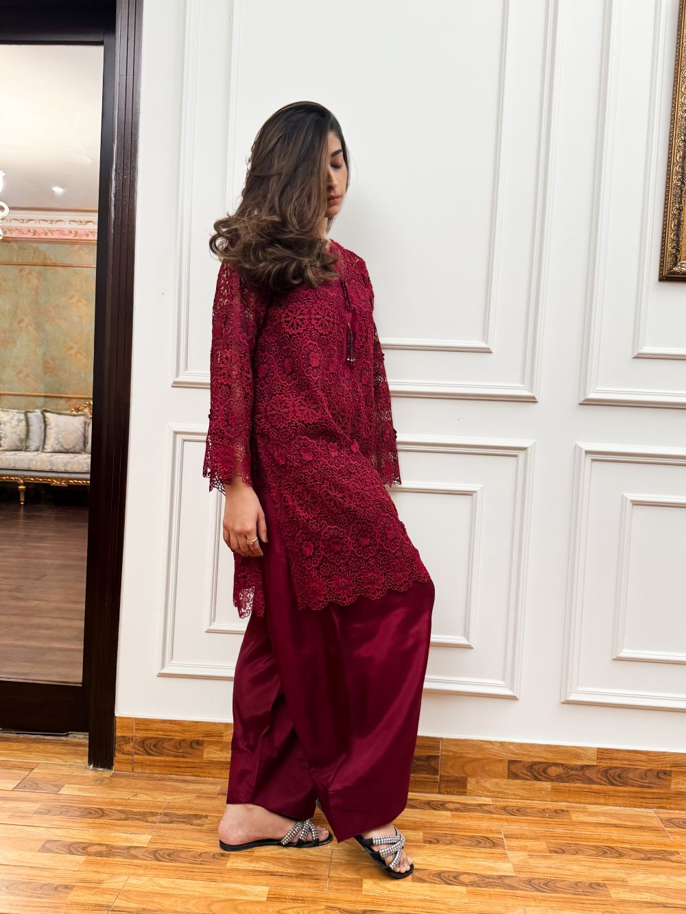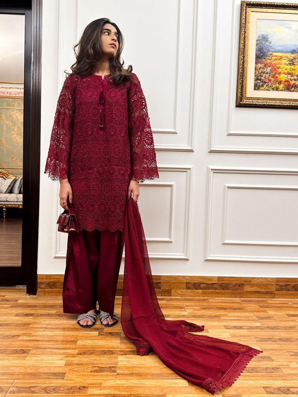 Glow in festive red with this short shirt and farshi shalwar set in delicate chickankari fabric. The standard neckline with thread detailing and playful tassels adds charm, while the chiffon dupatta flows gracefully. Perfect for celebrations, this ensemble blends traditional elegance with a modern, show-stopping look.