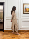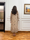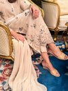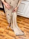 This beige long shirt with straight trousers is stitched in embroidered chiffon fabric, giving it a light and graceful feel. The pleated neckline adds subtle sophistication, while the matching chiffon dupatta completes the look.