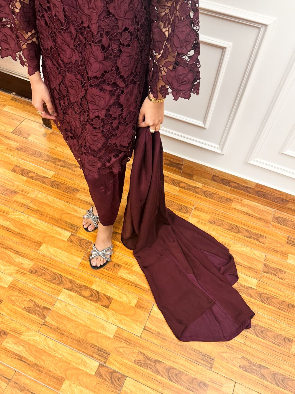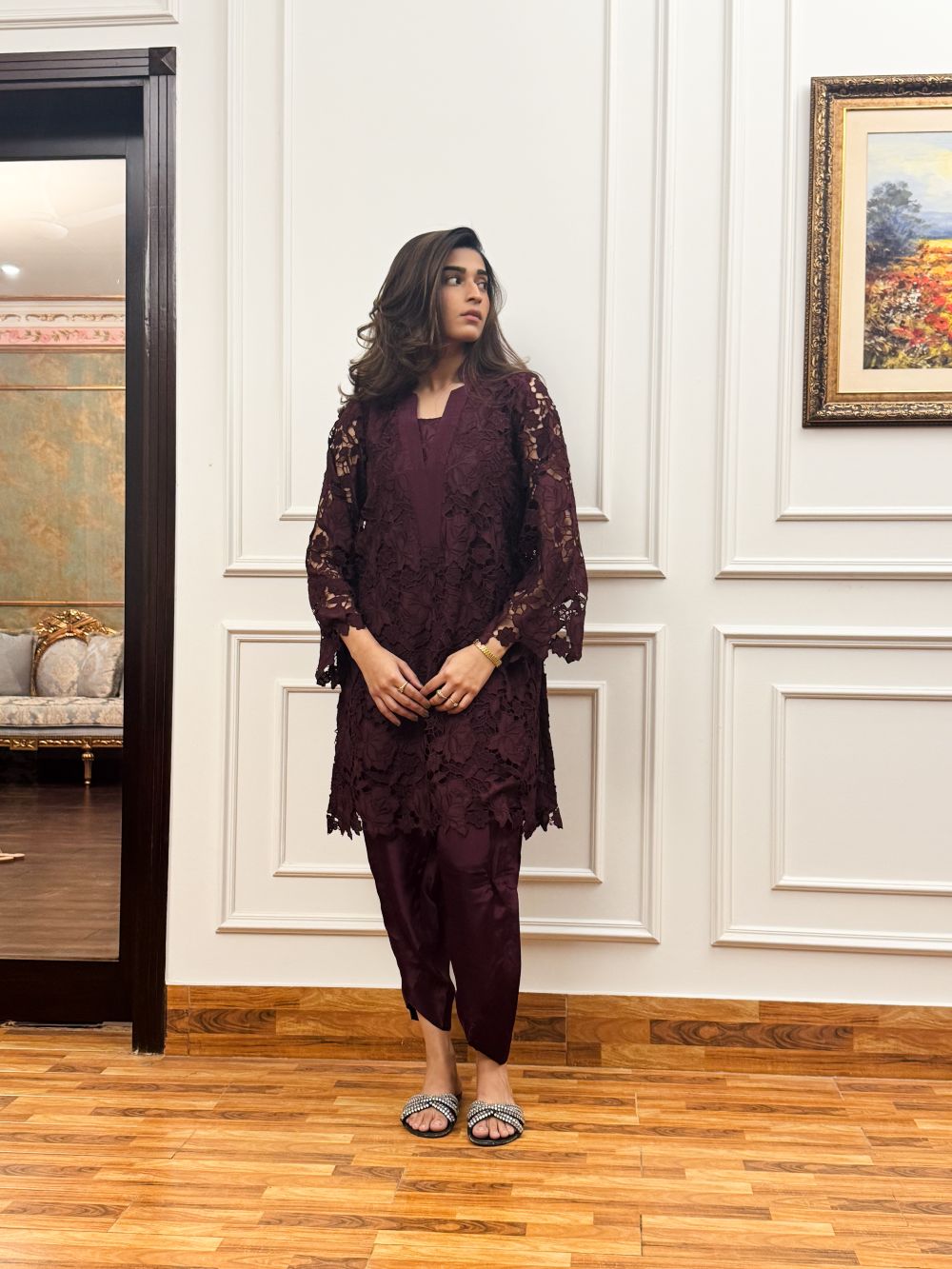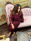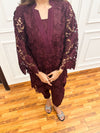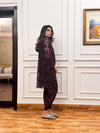 This chic short shirt and shalwar ensemble is crafted from soft chickankari fabric, offering comfort with refined elegance. The V-collar neckline adds a modern touch, enhancing the graceful silhouette with medium silk dupatta. Designed in a deep plum hue, the outfit stands out with its subtle embroidery and timeless charm.