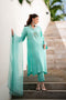 A vibrant hotpink hued shirt cut from sheesha silk is adorned with zardozi, sequence and resham addawork in bold multi-tones. Featuring a modern cut neckline, the shirt is paired with culottes and a pure silk chiffon dupatta with details of sequence at edges.