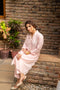 showcasing exquisite cutwork details on its sleeves and daman. It is complemented by a pair of straight pants adorned with matching cutwork designs.