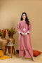 Straight shirt with fringe details on neckline, sleeves, and daman, straight full sleeves, plain back and palazzo pants with fringe details.