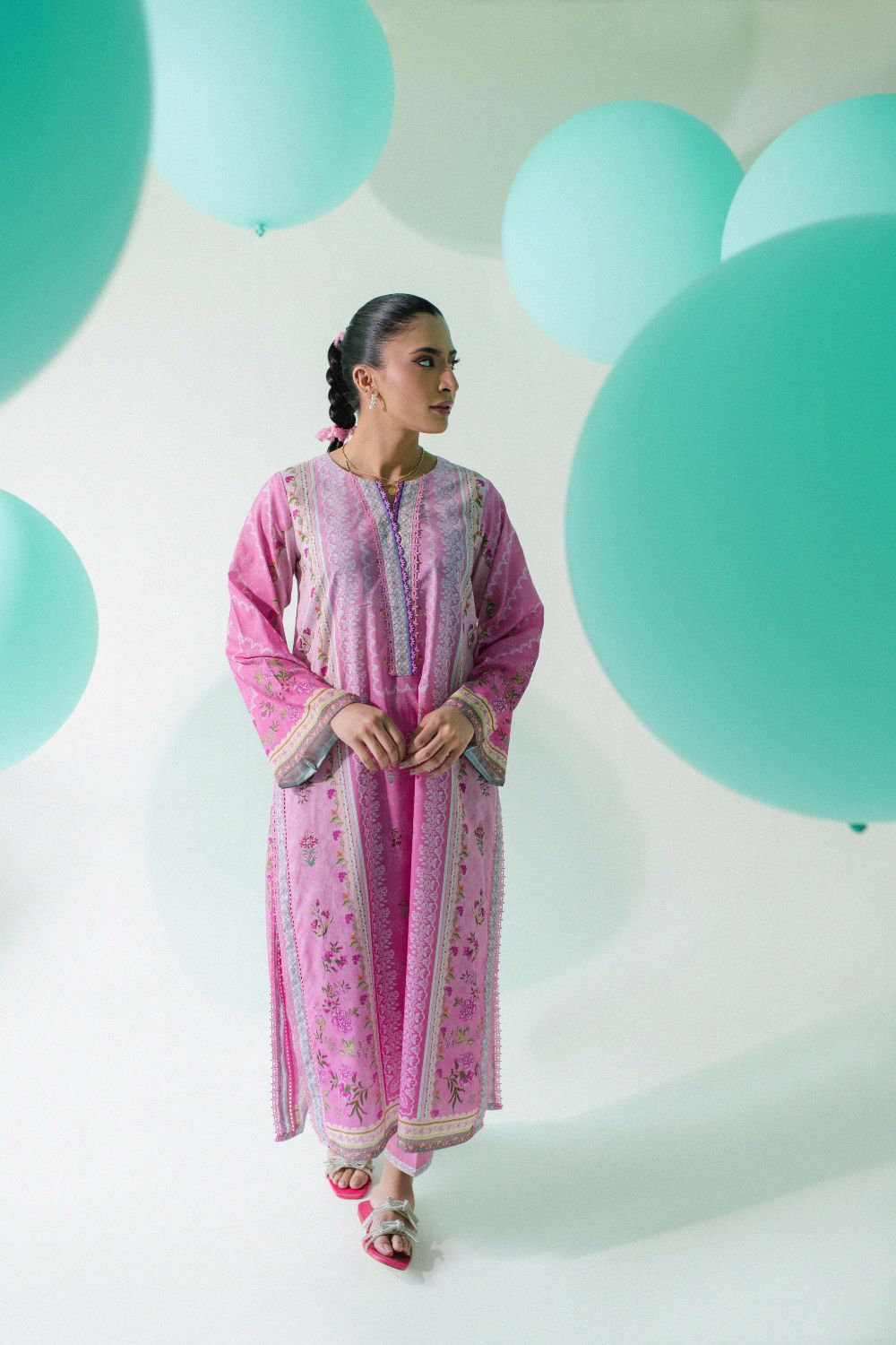 Ombre bloom, is a straight column shirt edged with playful laces along its long length, boat neckline with lace and scallop detailing is complementing it beautifully. Paired with straight trousers which have beautiful printed border on bottom. A beautiful summer lawn outfit.