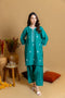 A stylish pink 2-piece set with bright pink and gold block print shirt paired with pant and finished with dark pink thread detailing perfect for adding a vibrant and sophisticated touch to any festive celebration.