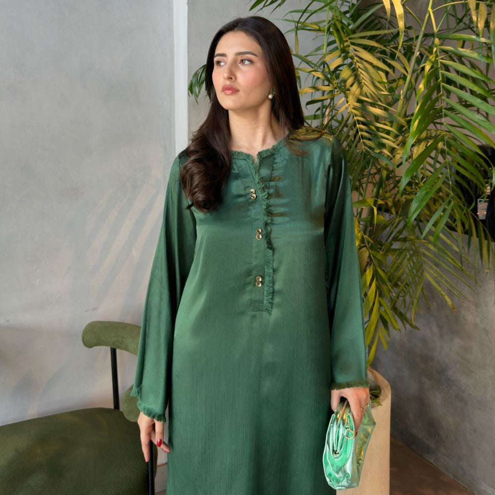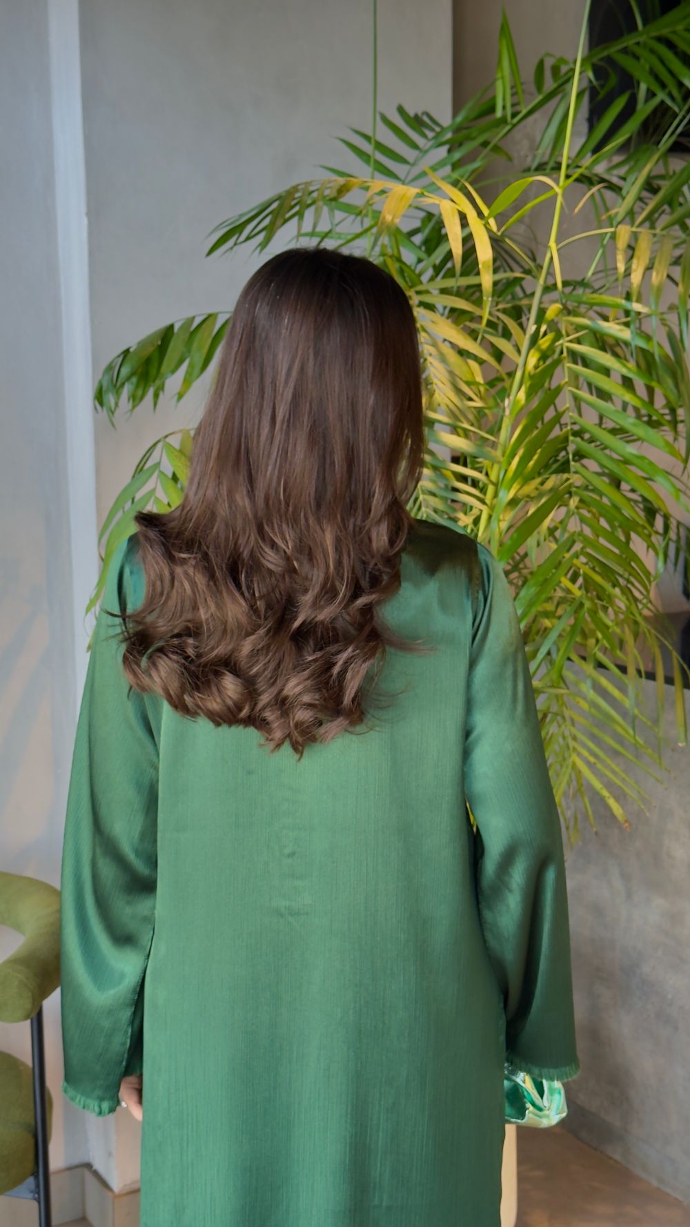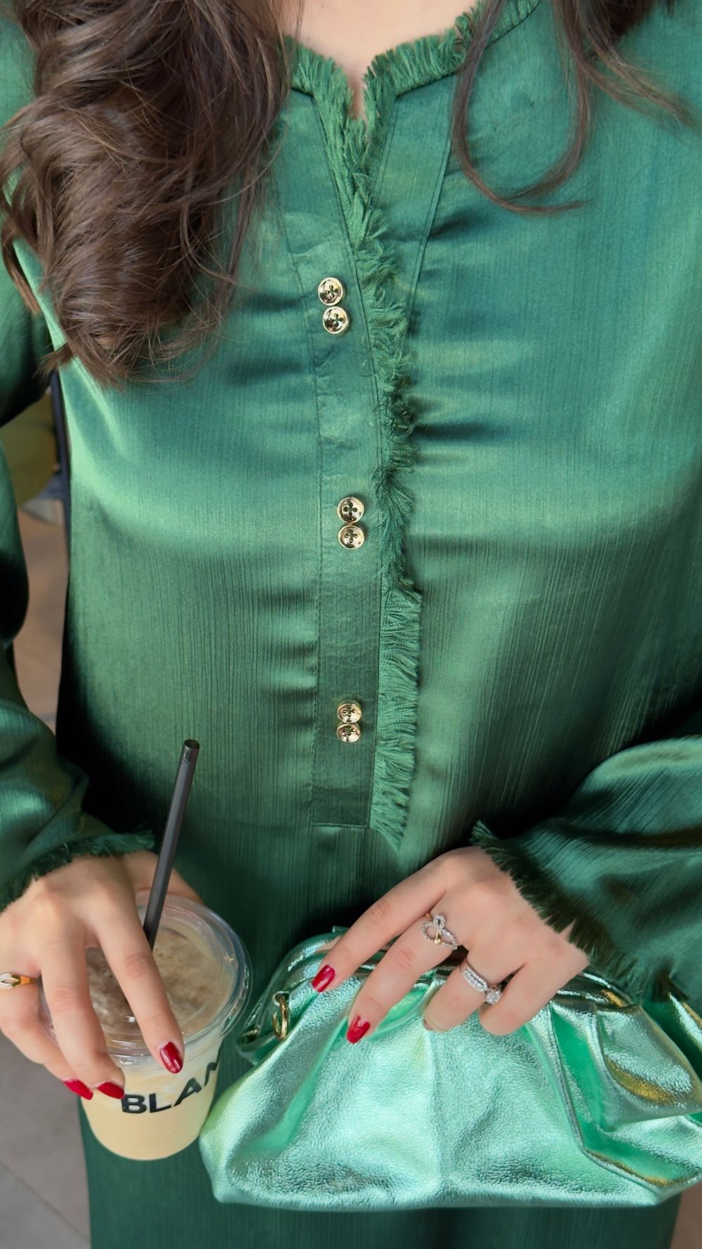 A green co-ord set tailored from premium silk, with gold buttons and fringe on all over the shirt and pants. The outfit is completed with palazzo pants with fringe detail.