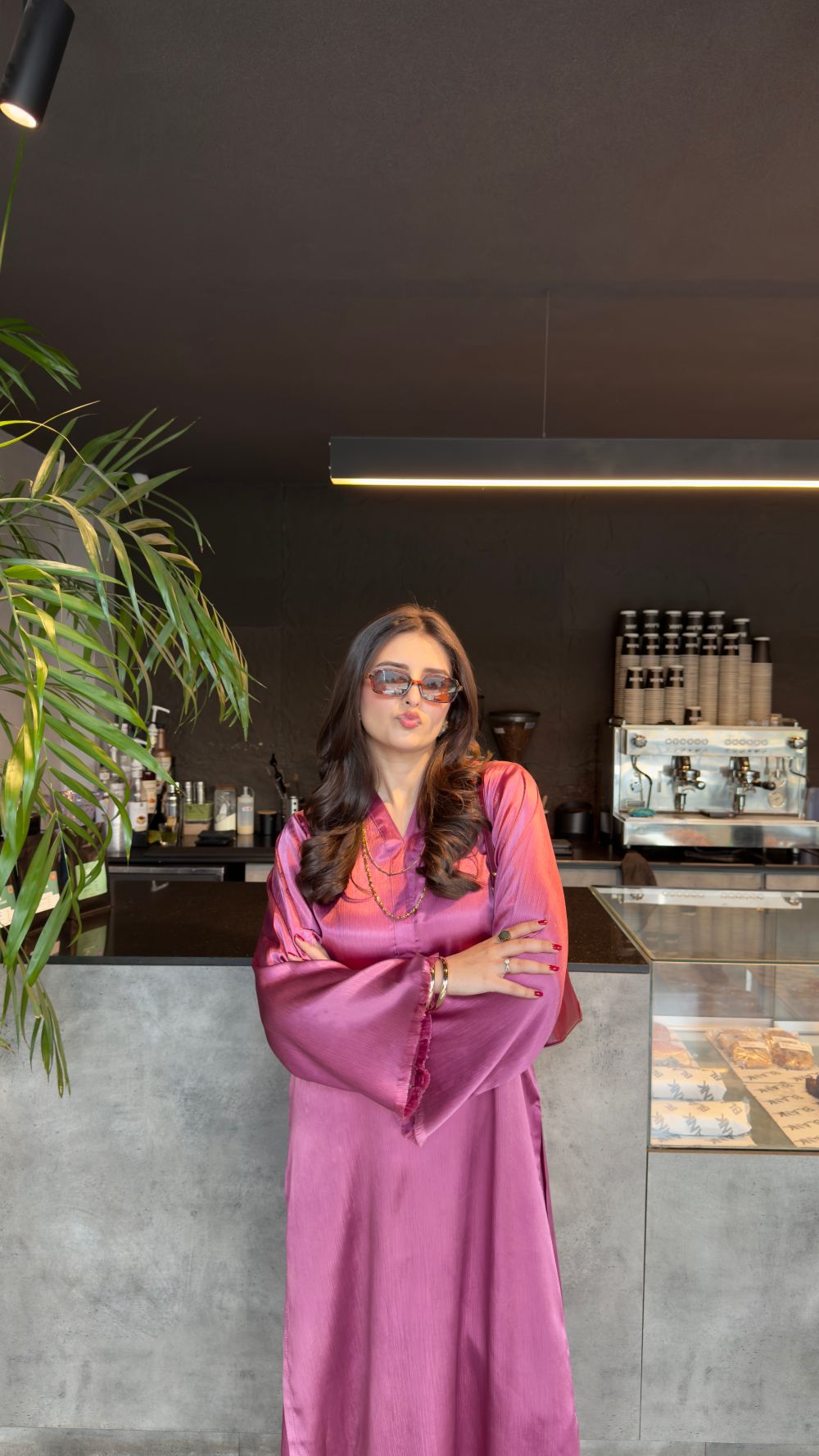 A mauve co-ord set tailored from premium silk, with fringe on all over the shirt and pants. The outfit is completed with palazzo pants with fringe detail.