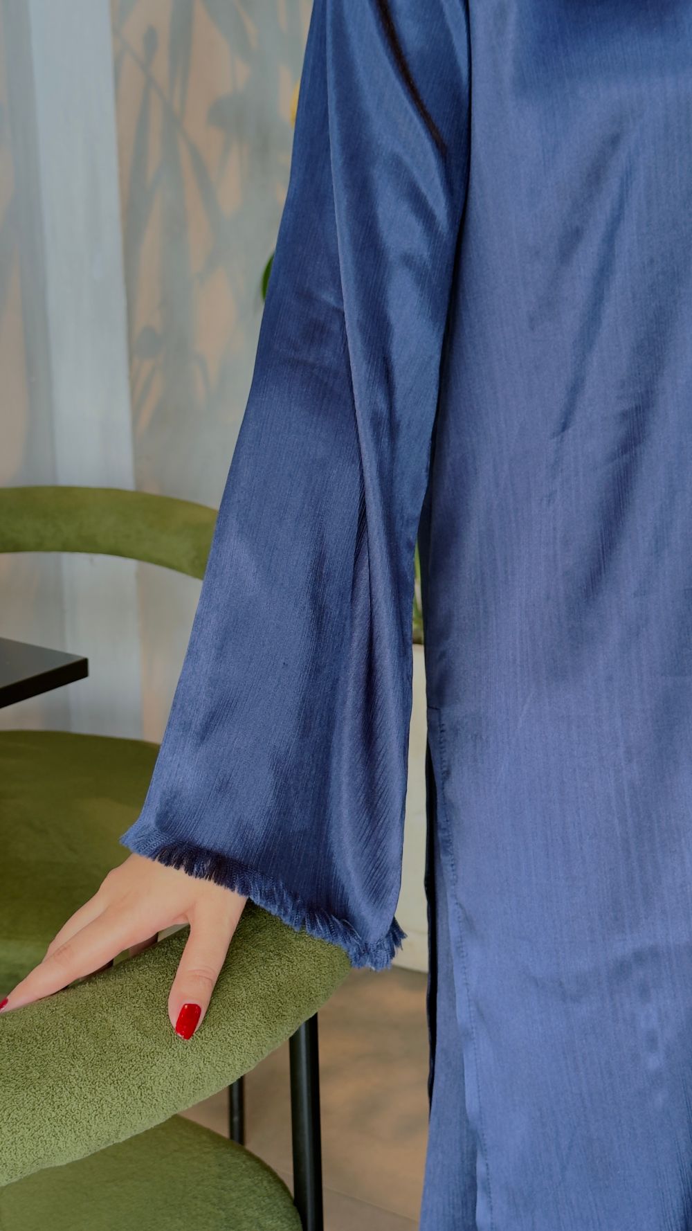 A Navy blue co-ord set tailored from premium silk, with gold buttons and fringe on all over the shirt and pants. The outfit is completed with palazzo pants with fringe detail.