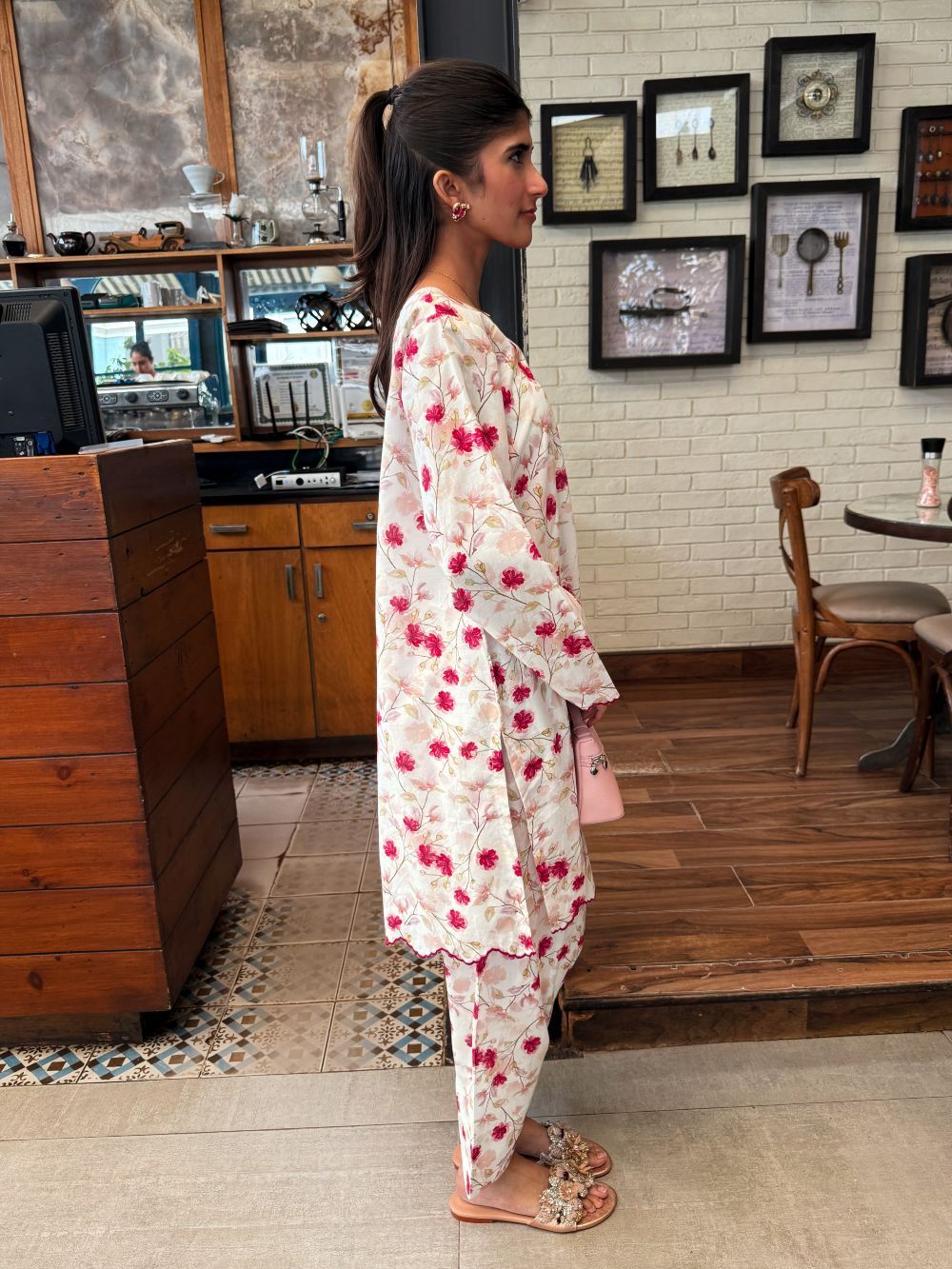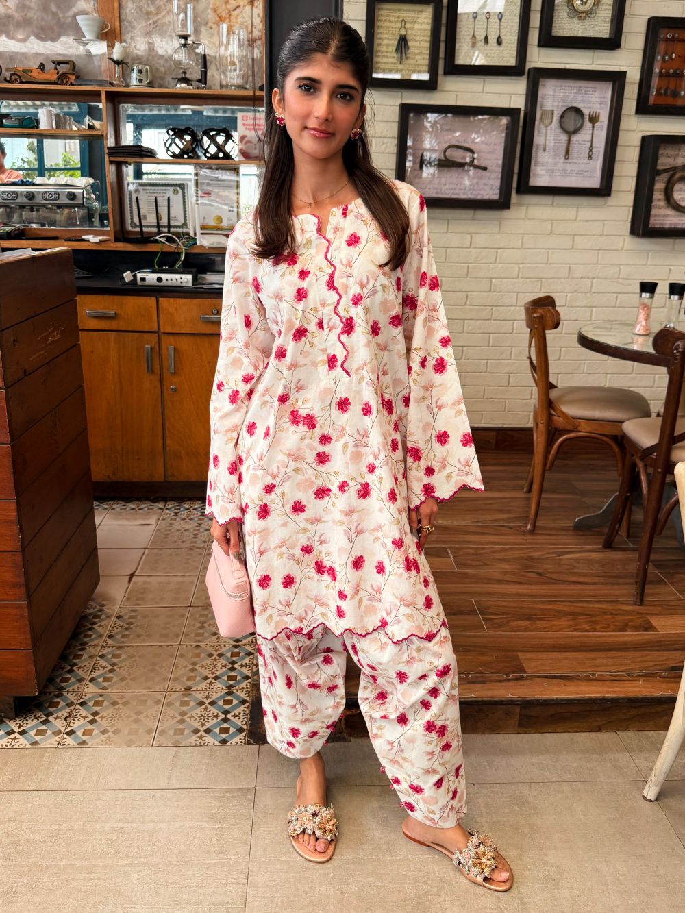 This printed 2pc blends comfort with elegance, featuring a short shirt and shalwar. Beautiful scallop detailing on sleeves and daman, along with a classic neckline, complete the look.