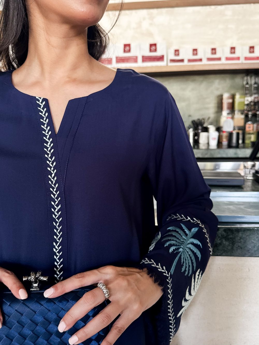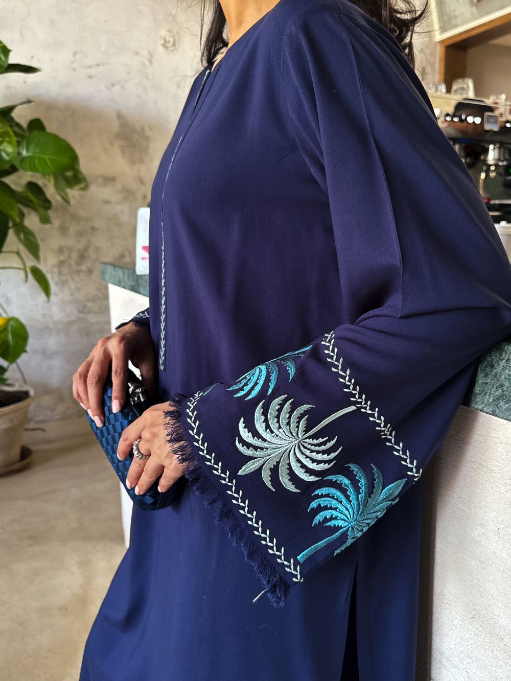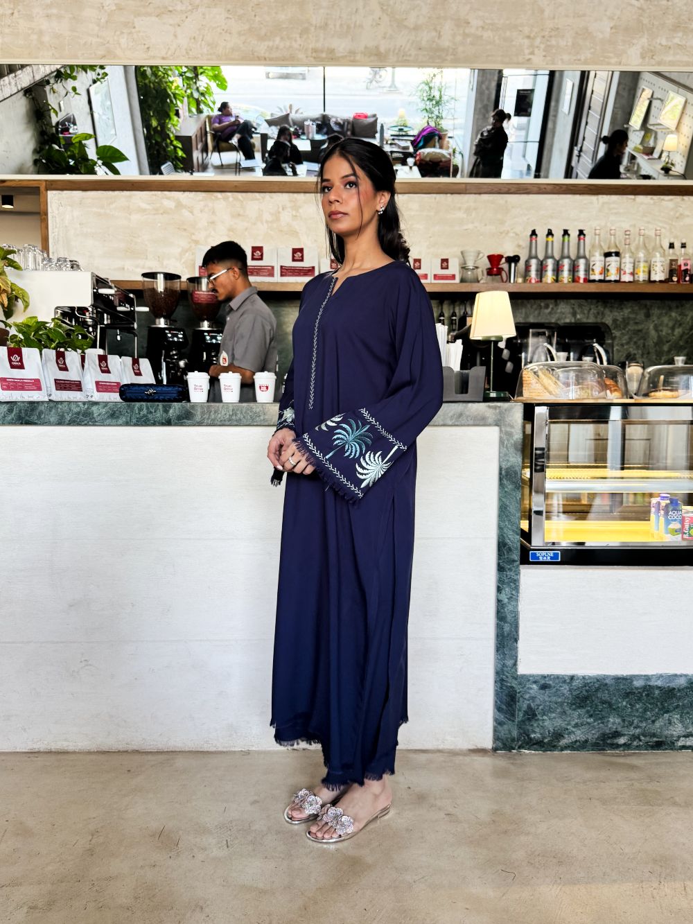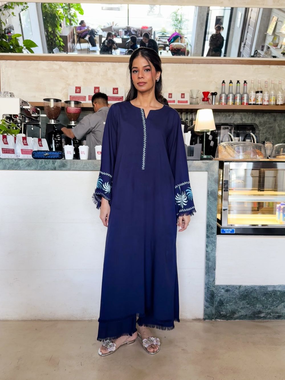 Plain shirt featuring light colored palm tree embroidery on the sleeves, enhanced with subtle thread detailing on the shirt and plazo. The neckline is adorned with delicate embroidery and pleated detailing, adding a graceful finish. Paired with a matching pajama, this ensemble offers a chic yet comfortable look for casual and semi-formal wear