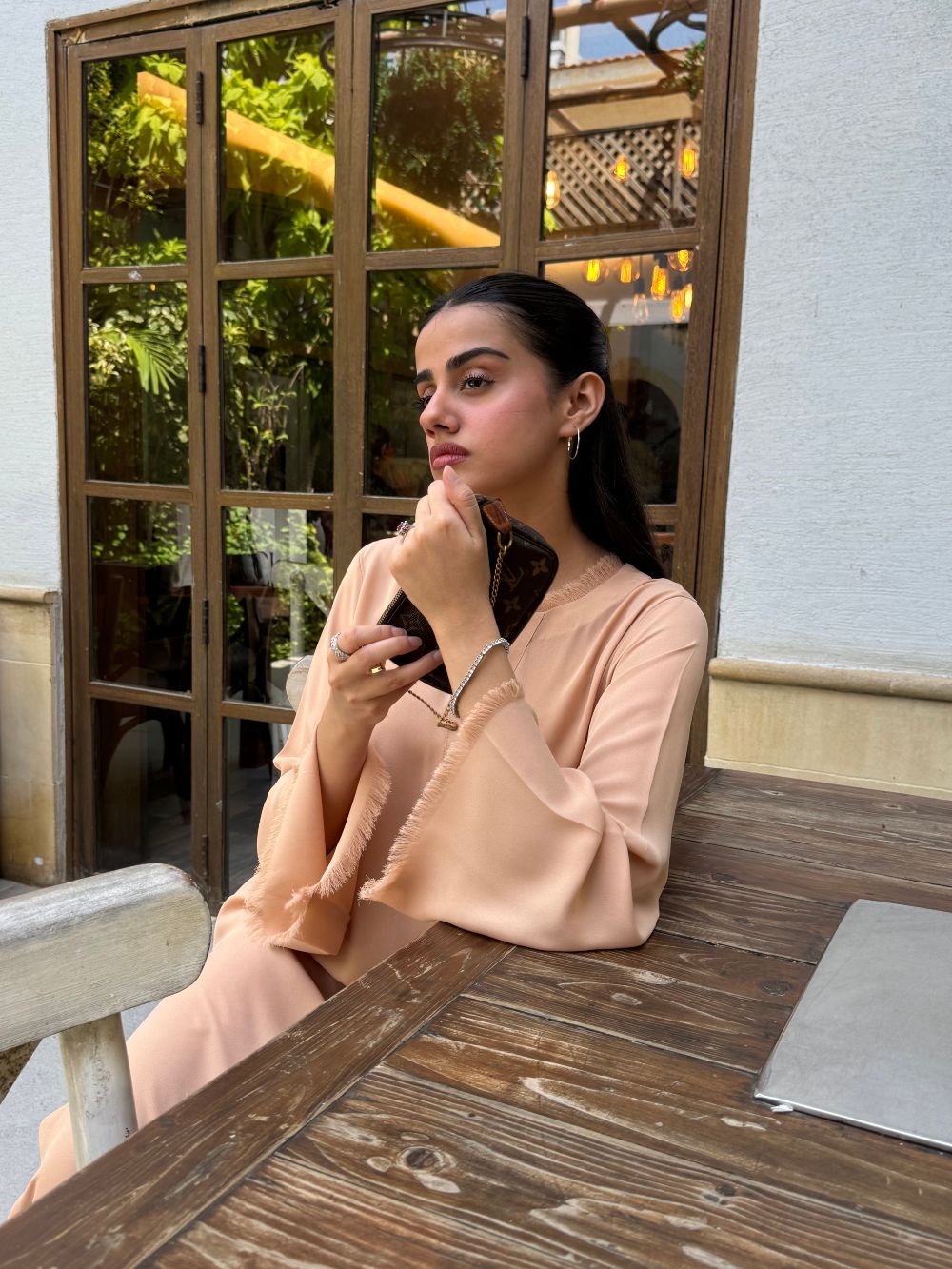 Straight shirt with fringe details on neckline, sleeves, and daman, straight full sleeves, plain back and palazzo pants with fringe details.