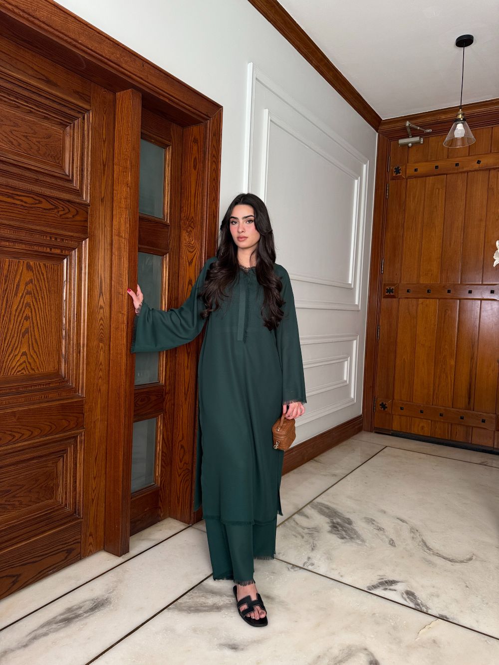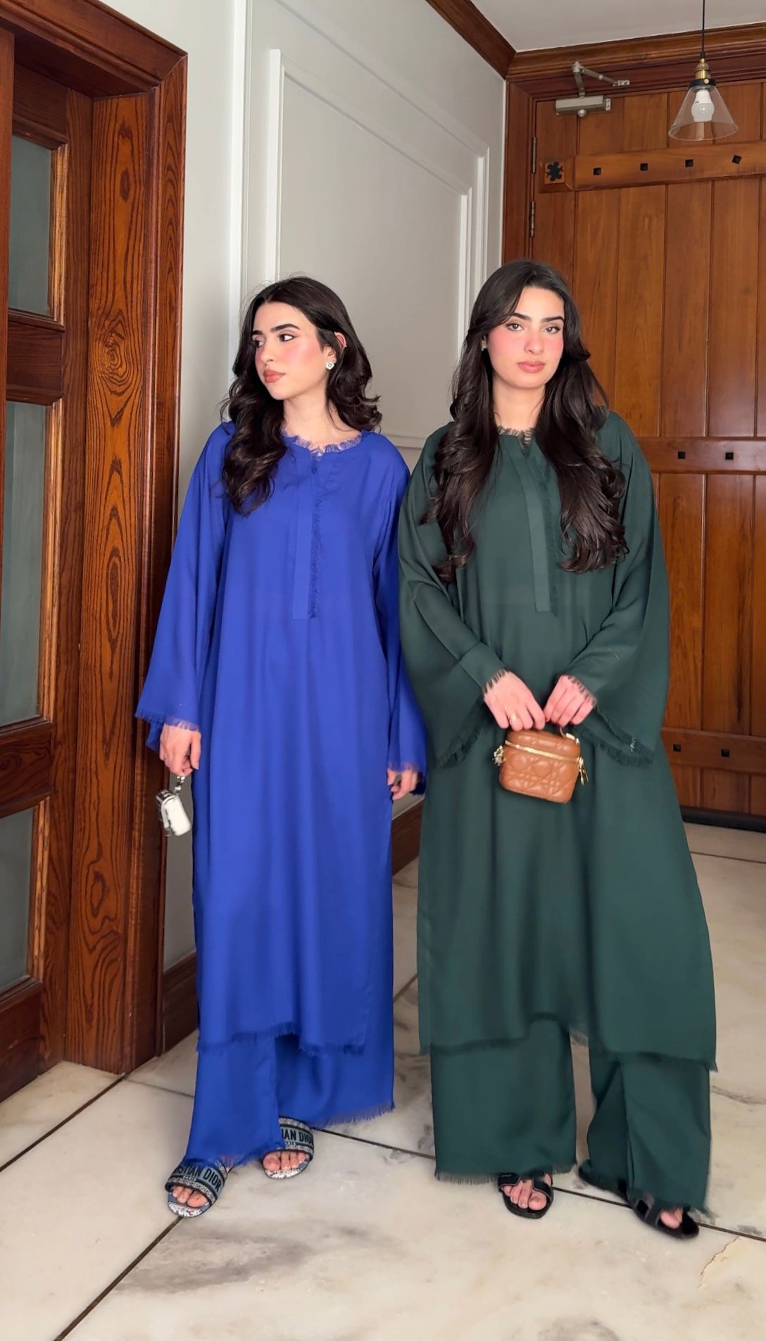 Straight shirt with fringe details on neckline, sleeves, and daman, straight full sleeves, plain back and palazzo pants with fringe details.
