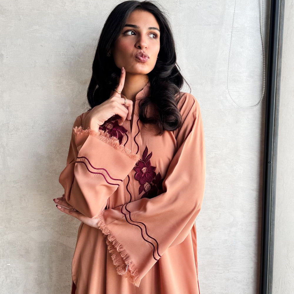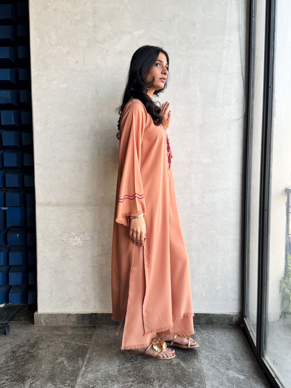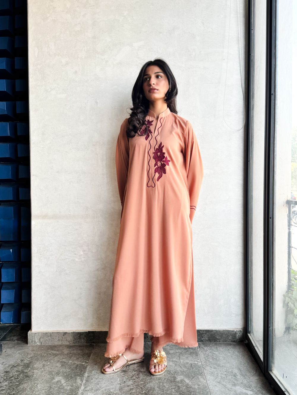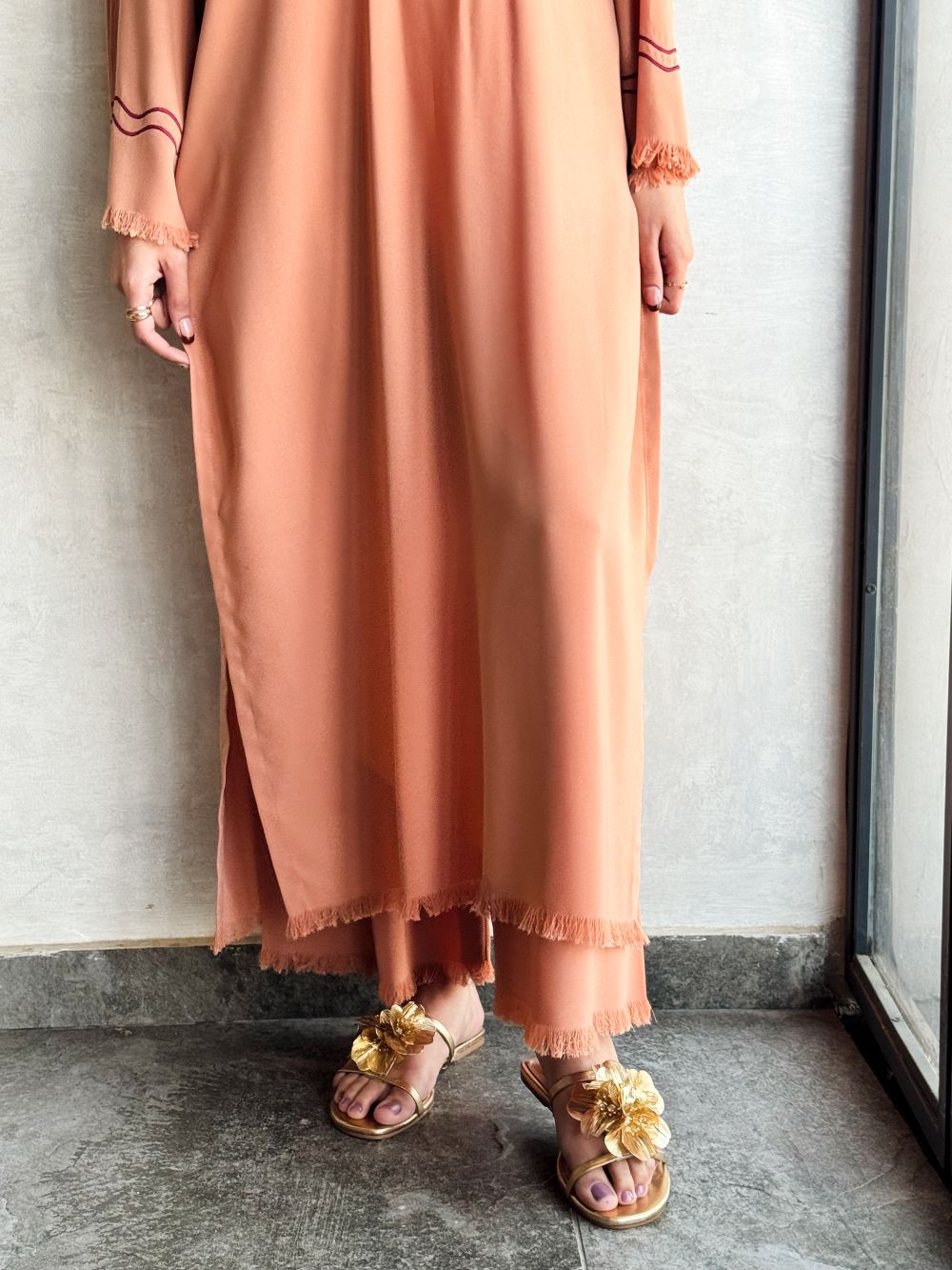 Step out in style with this On-The-Go Viscose Blended set in Sand, featuring 3D maroon embroidery on the neckline and line embroidery on the sleeves and plazo with thread detailing. The long shirt paired with a plazo offers a comfortable yet elegant silhouette, perfect for daily wear or casual wear.