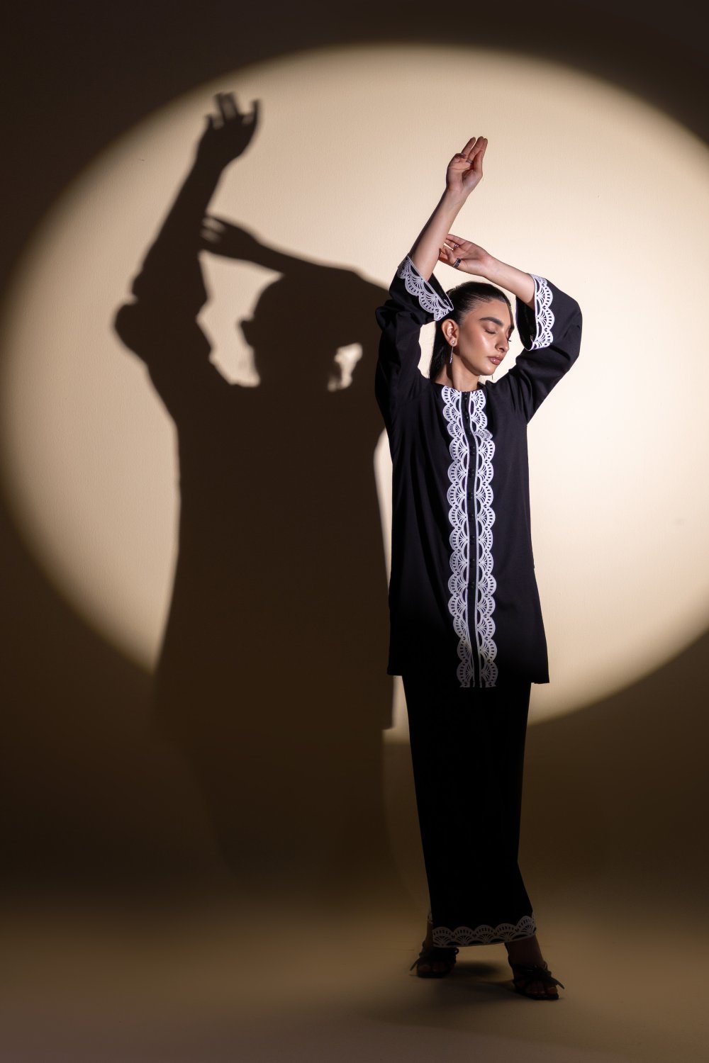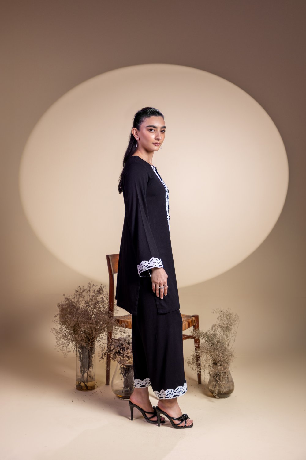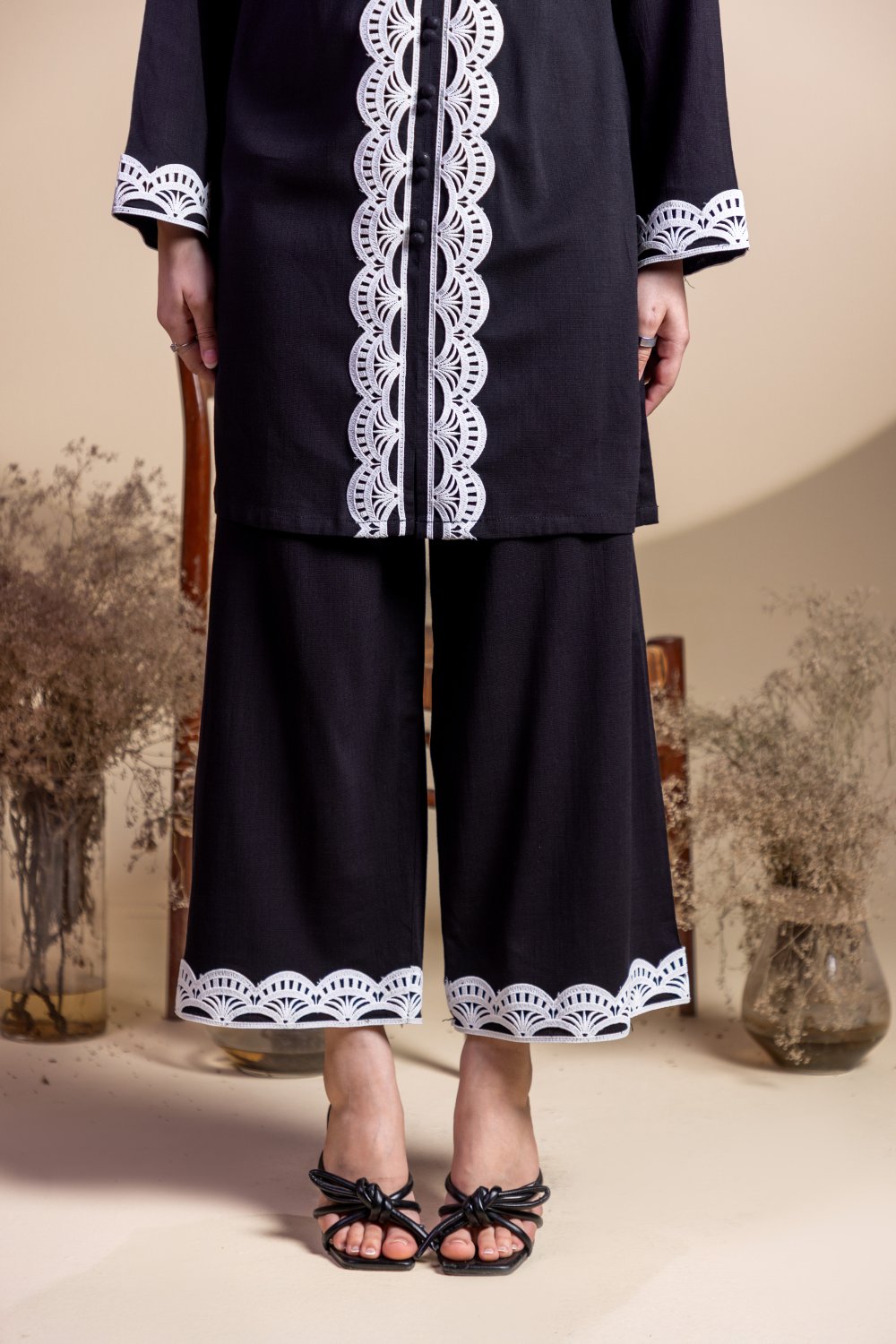 A stylish black coord set in summer linen fabric features delicate lace work, paired with a short shirt and wide-legged plazo for a chic seasonal look !!