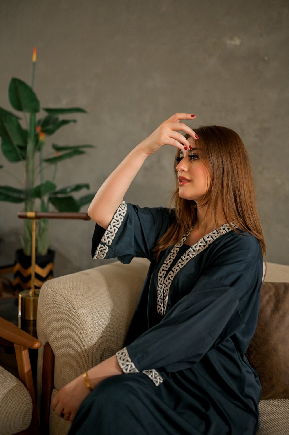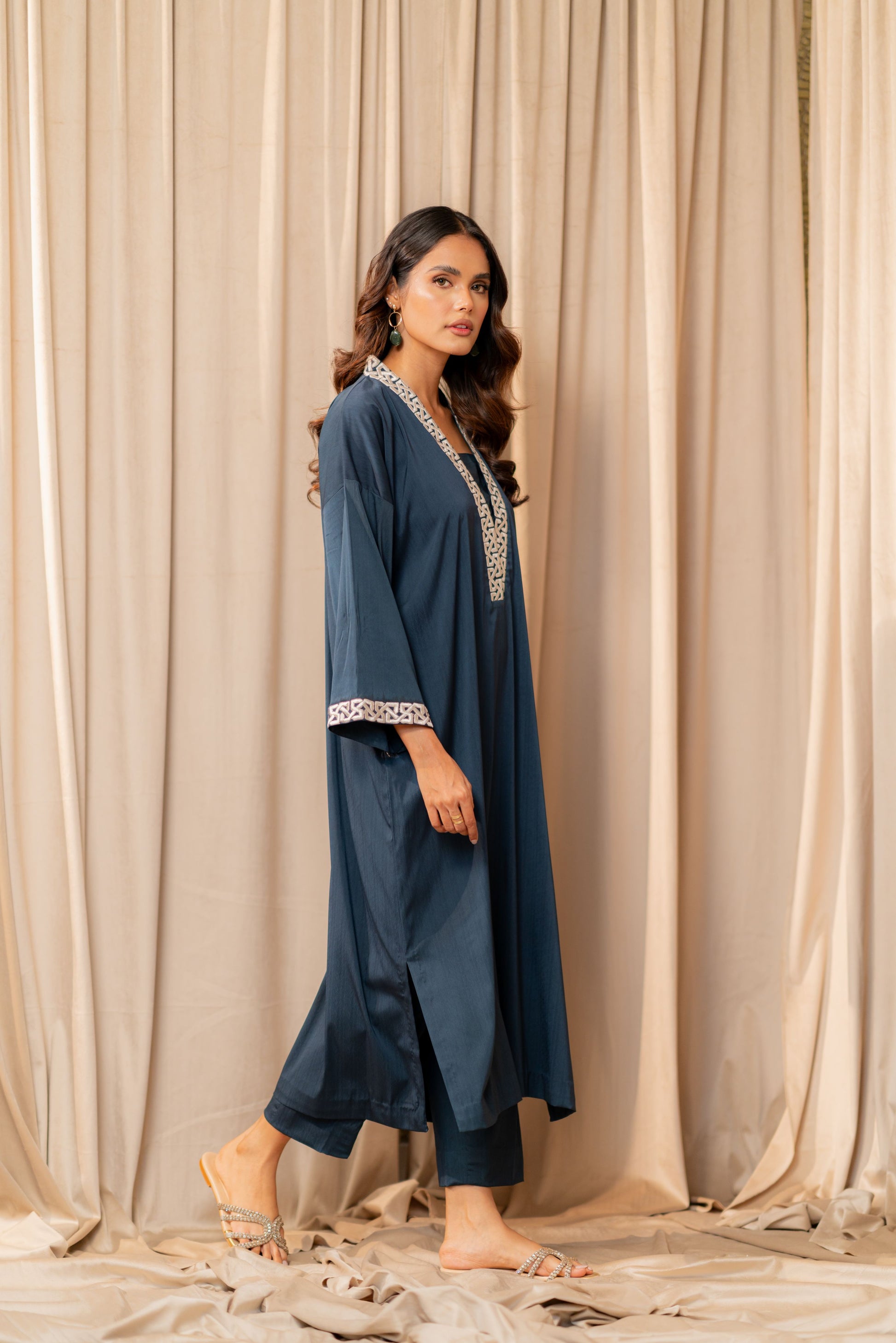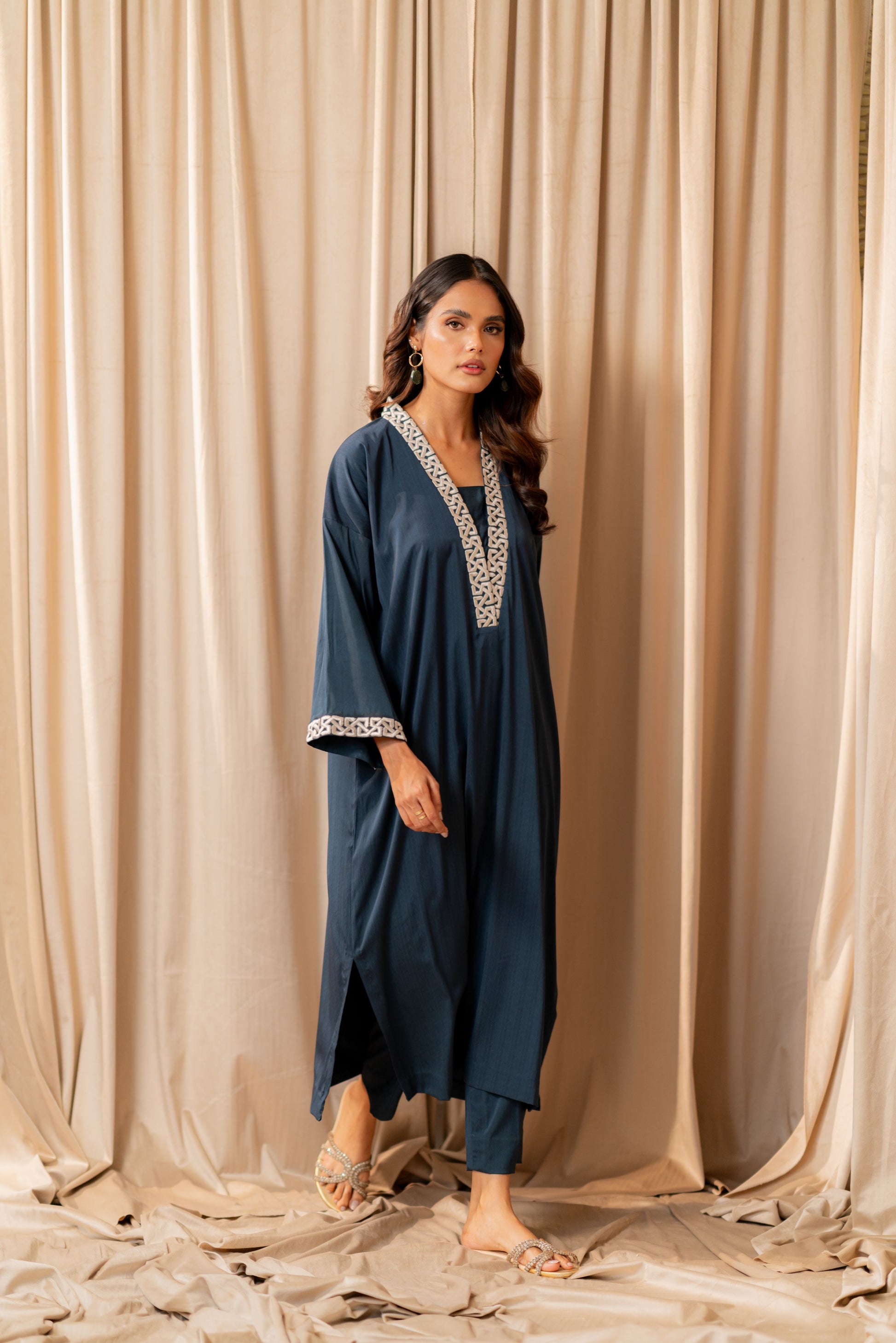 A relaxed fit kaftan made with sheesha pure blended viscous with a Y-shaped embroidered neckline and embroidered full sleeves. Paired with basic straight pants.