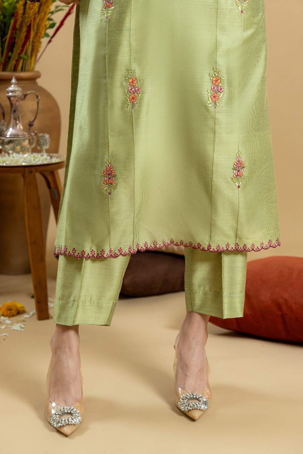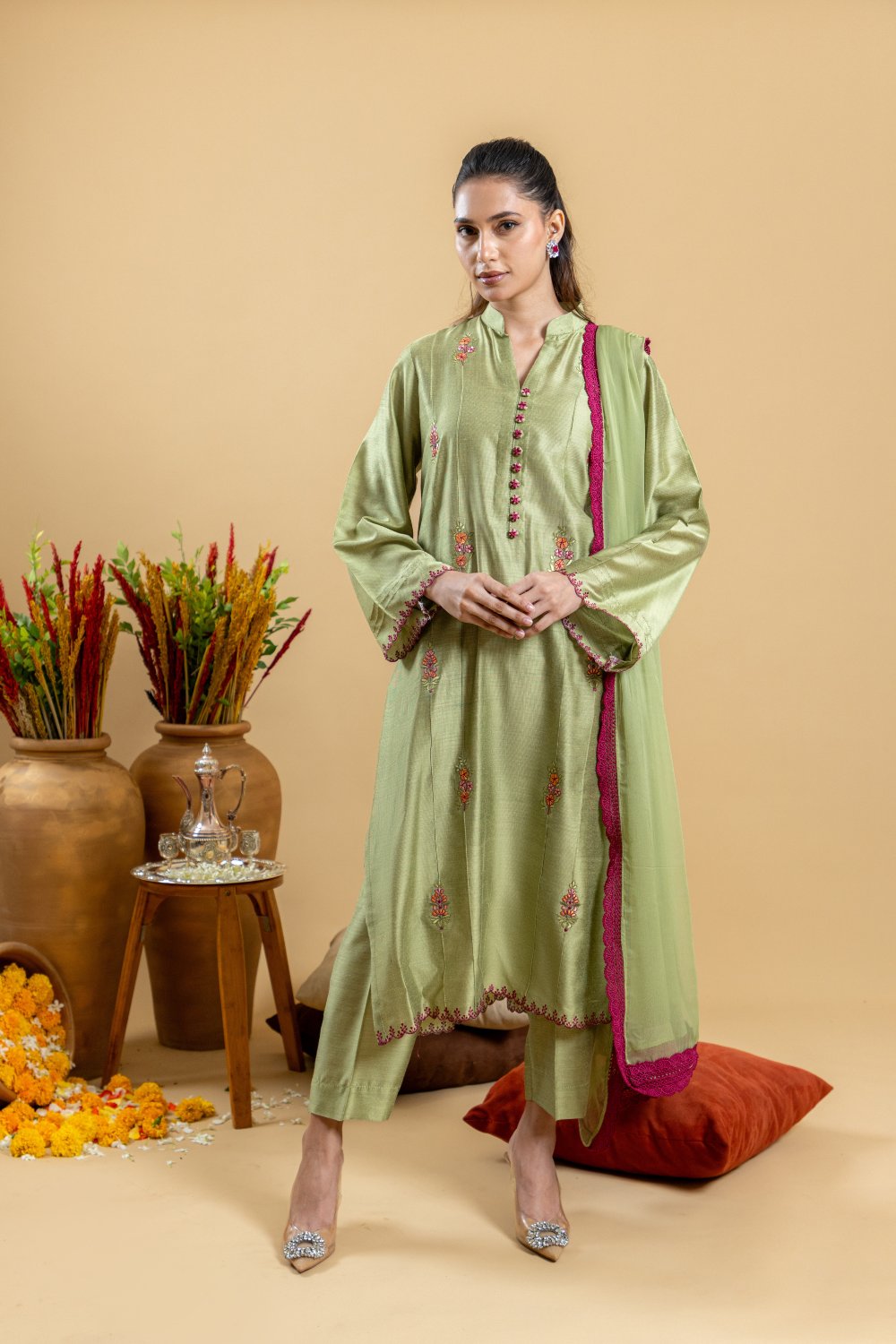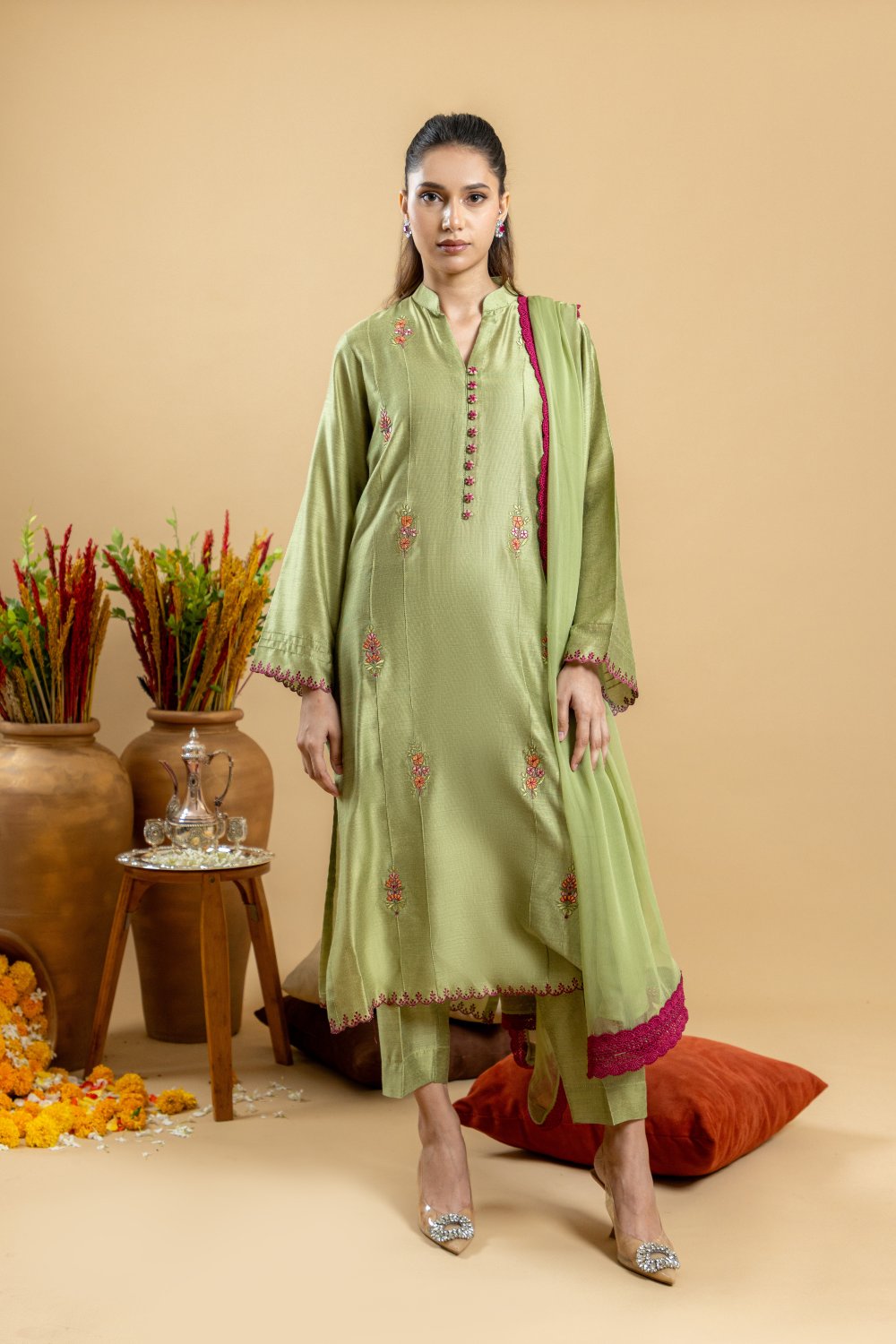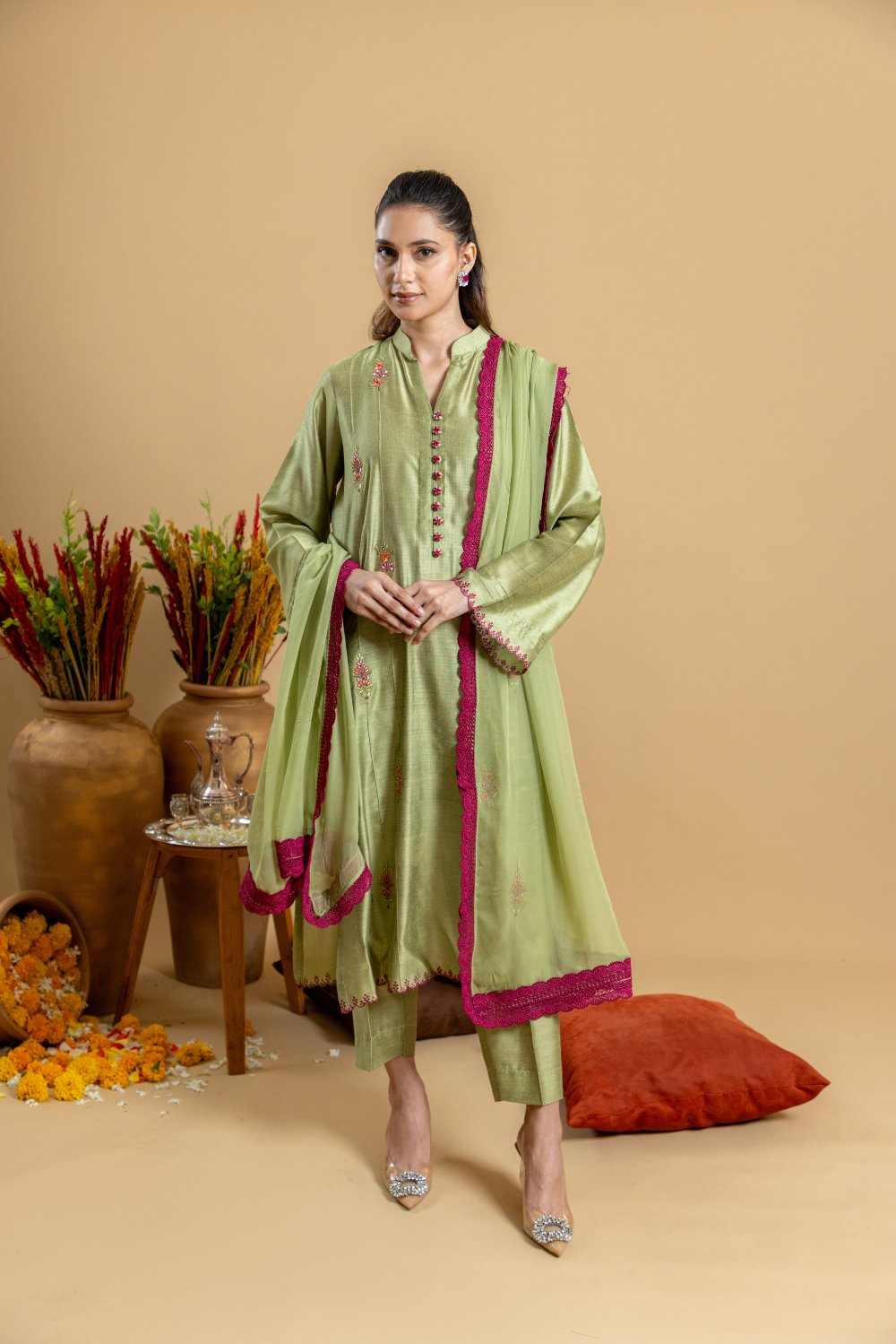 This light green 3-piece outfit is made from soft viscose silk featuring a beautifully embroidered shirt with bright colorful detailing, paired with a matching trouser and dupatta. A breezy, elegant pick for summer days.