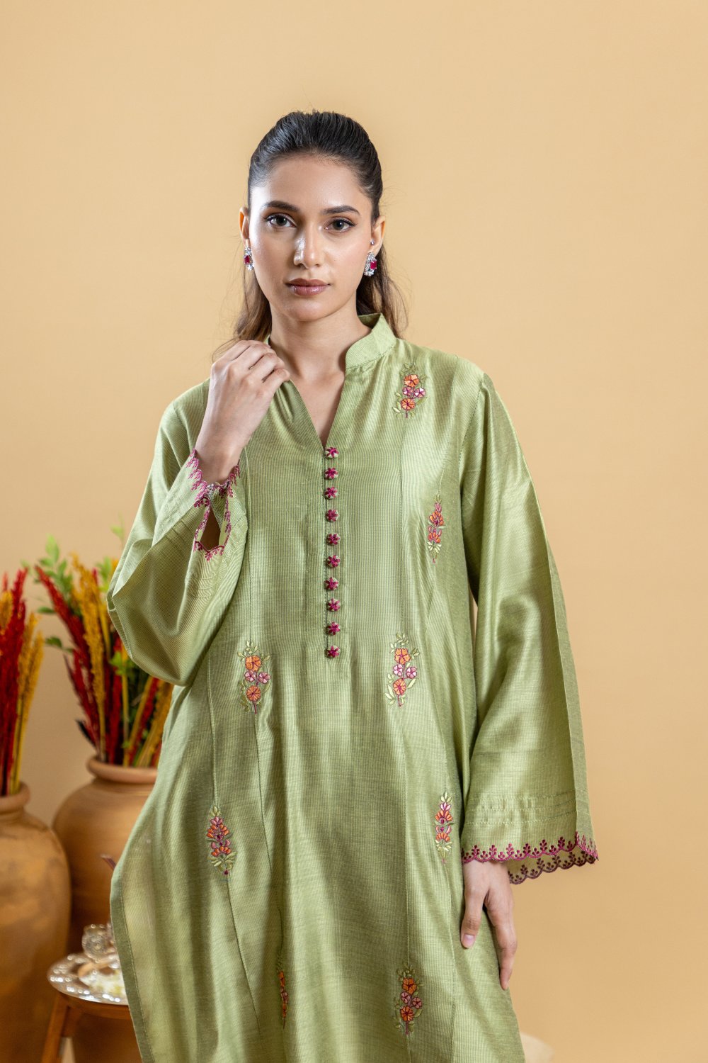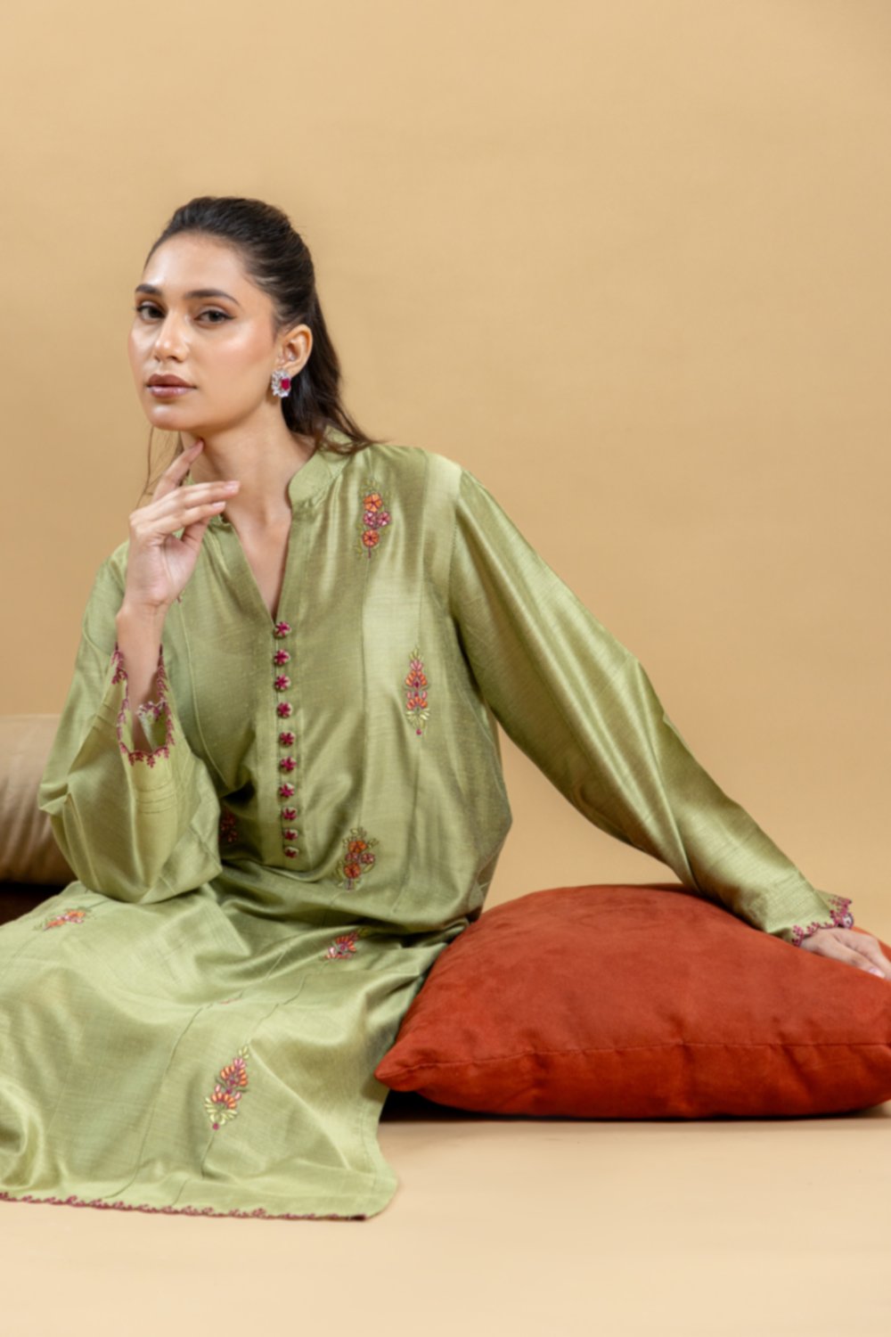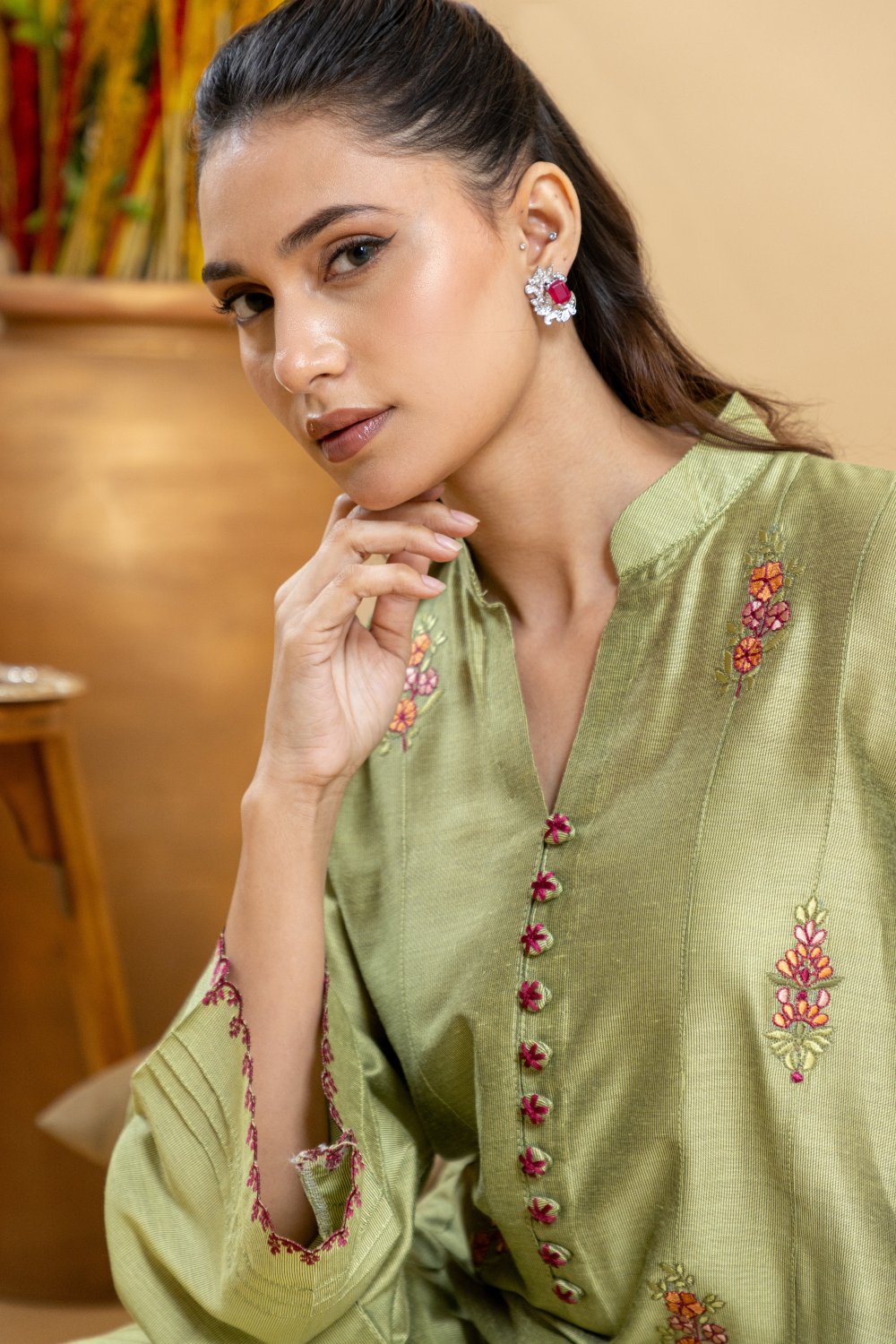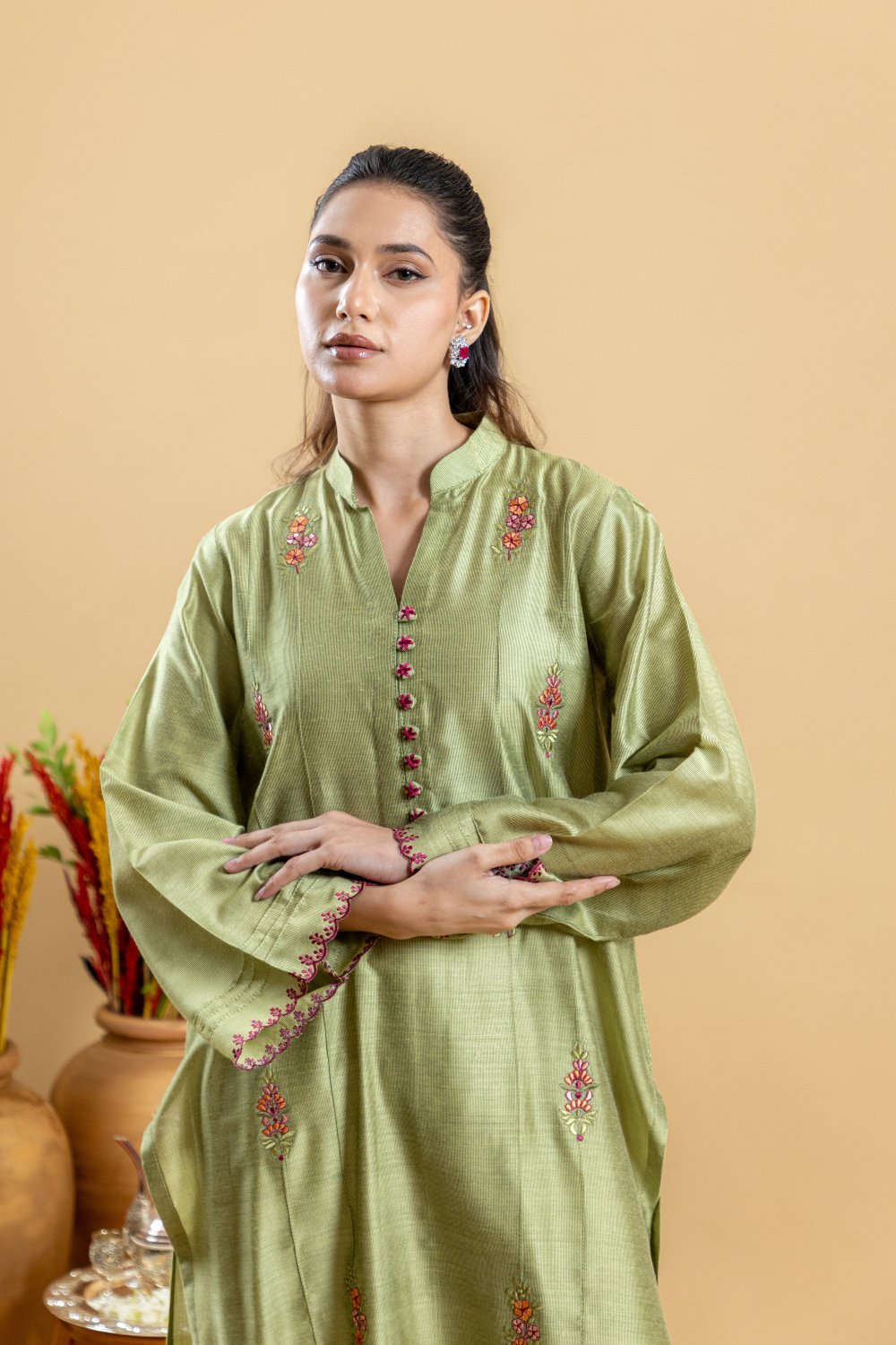 This light green 3-piece outfit is made from soft viscose silk featuring a beautifully embroidered shirt with bright colorful detailing, paired with a matching trouser and dupatta. A breezy, elegant pick for summer days.