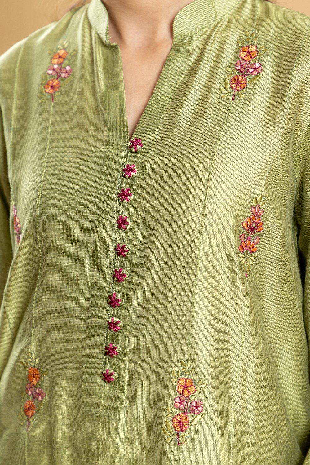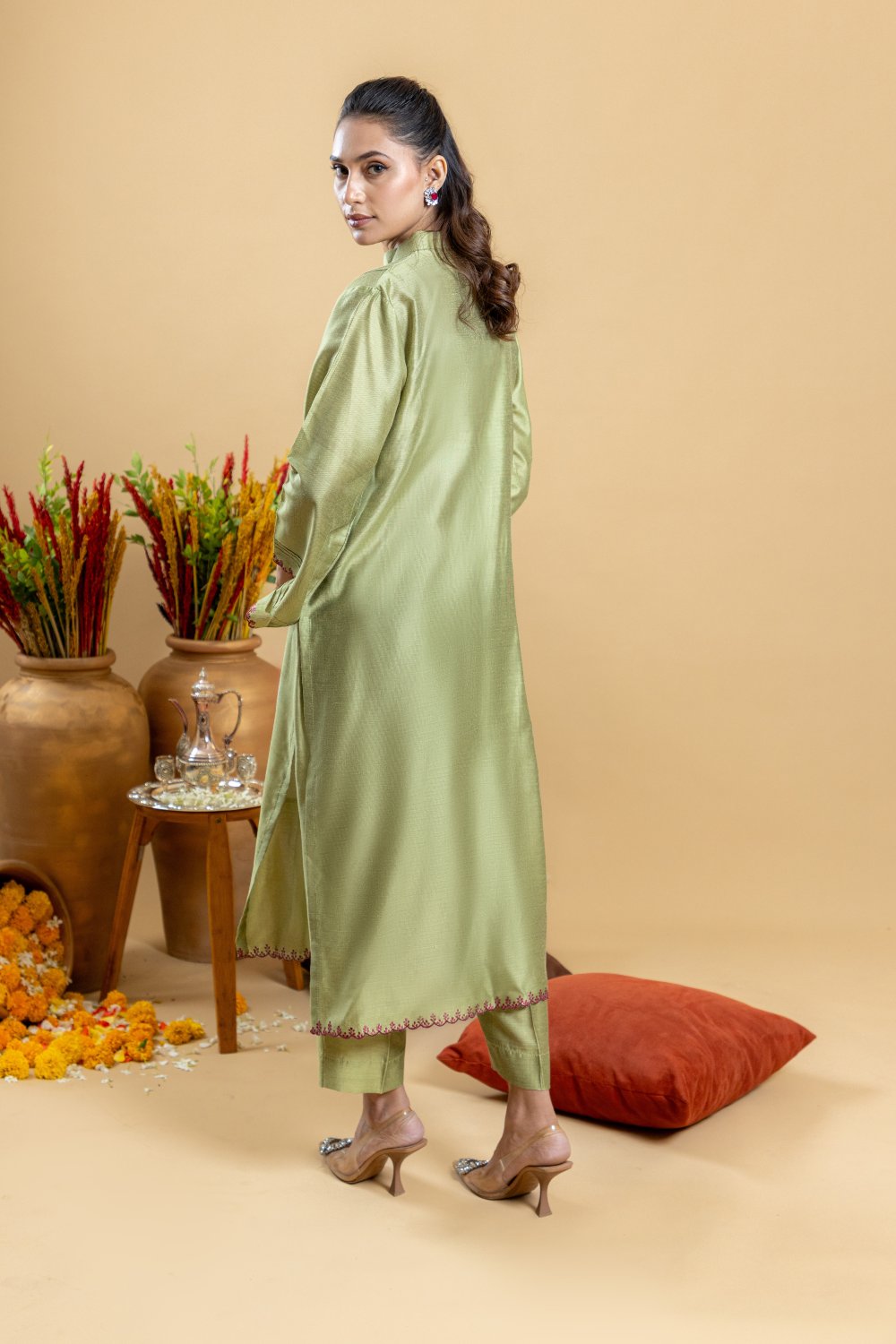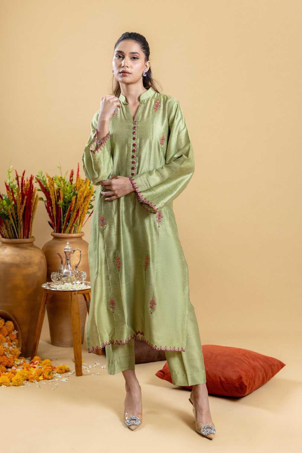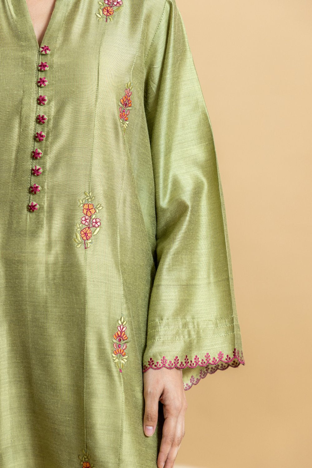 This light green 3-piece outfit is made from soft viscose silk featuring a beautifully embroidered shirt with bright colorful detailing, paired with a matching trouser and dupatta. A breezy, elegant pick for summer days.
