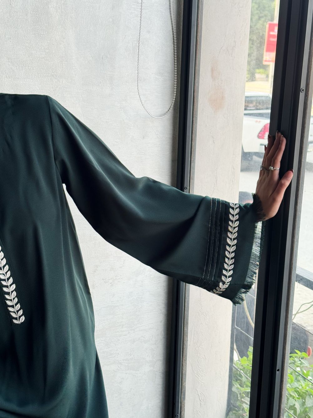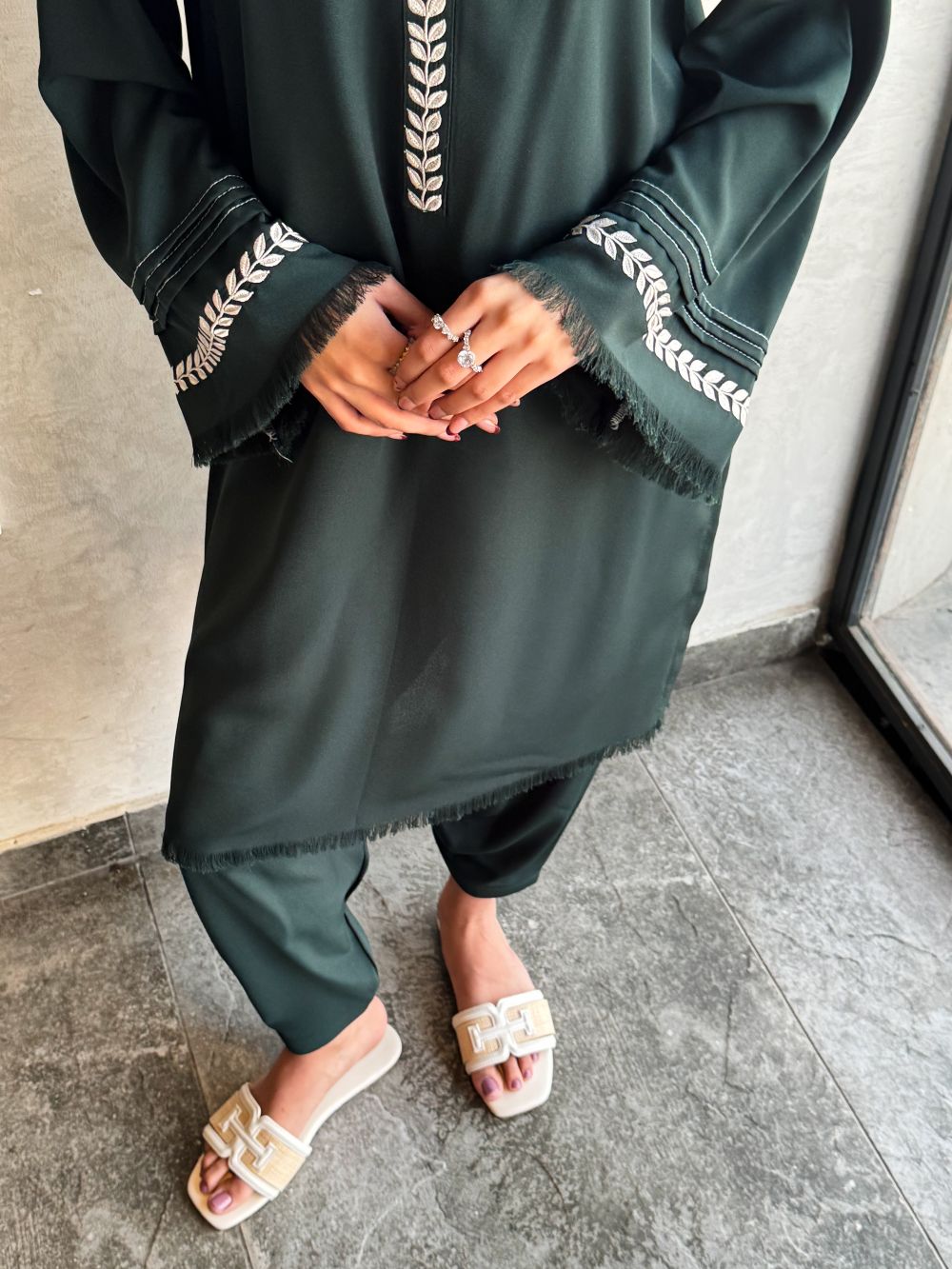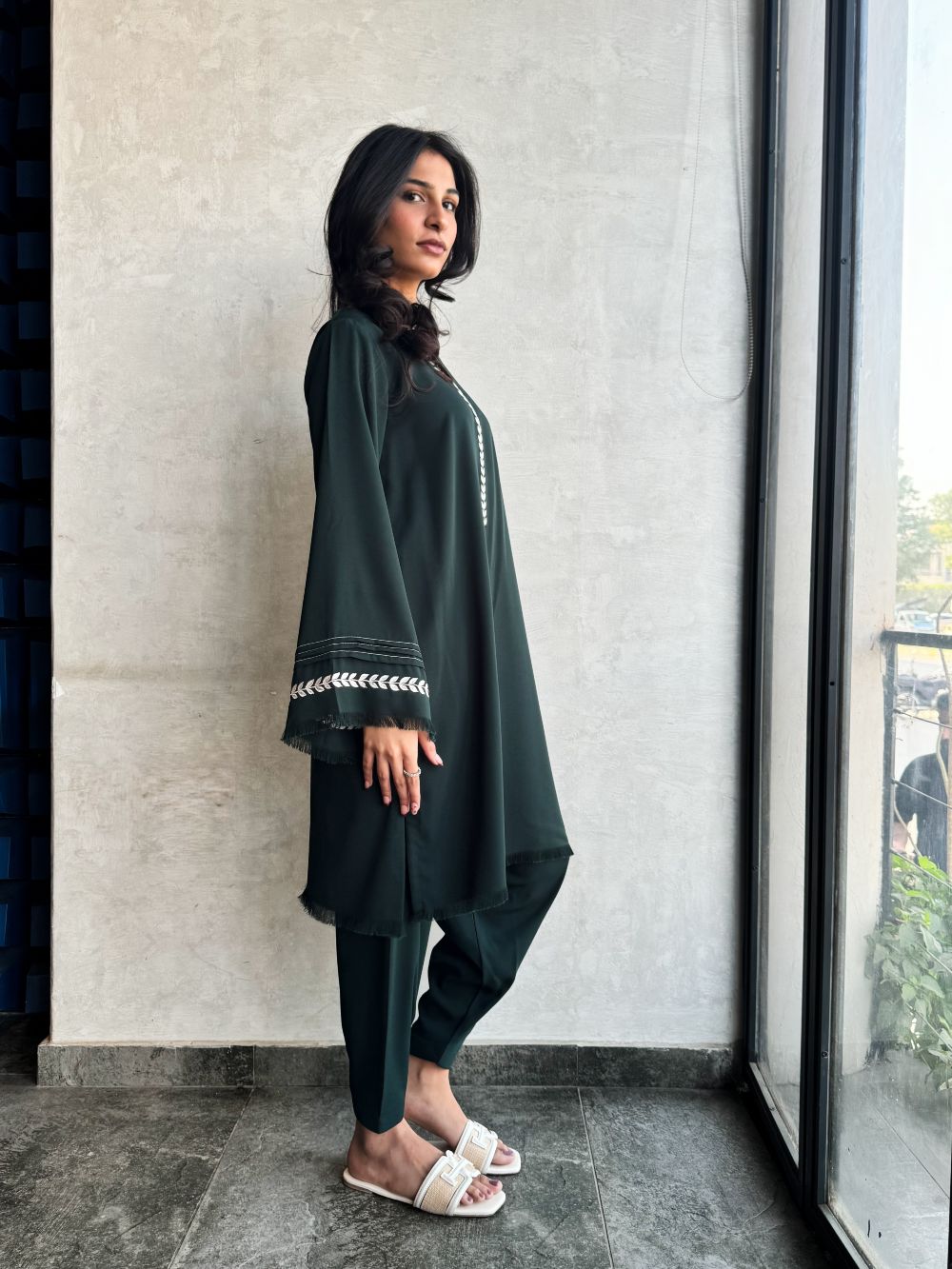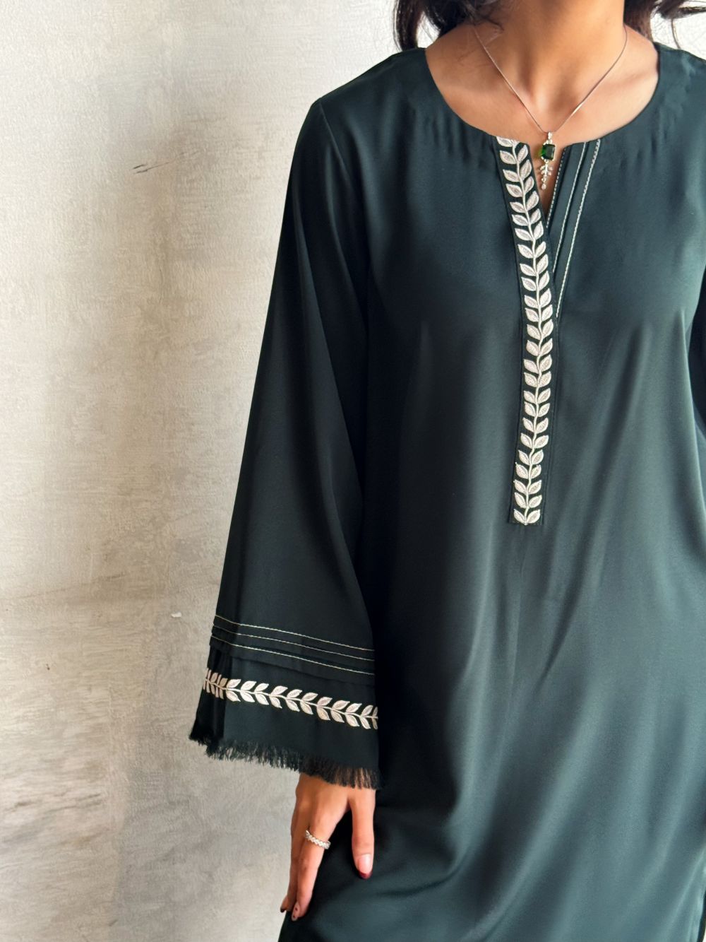 Elegant Deep Green short shirt with skinny shalwar, featuring embroidery on the neckline and sleeves. Subtle thread detailing enhances this chic and minimal ensemble, perfect for daily wear