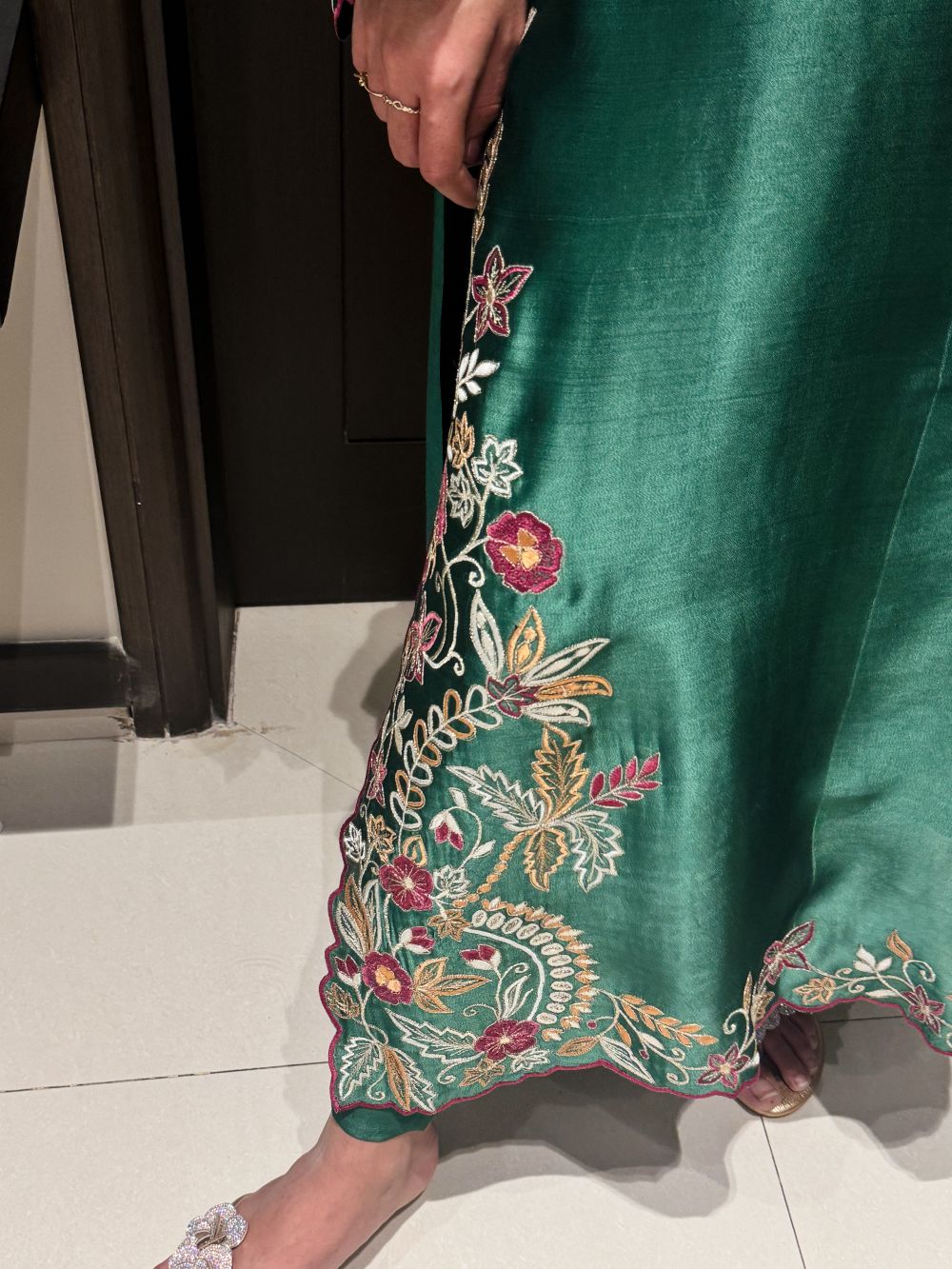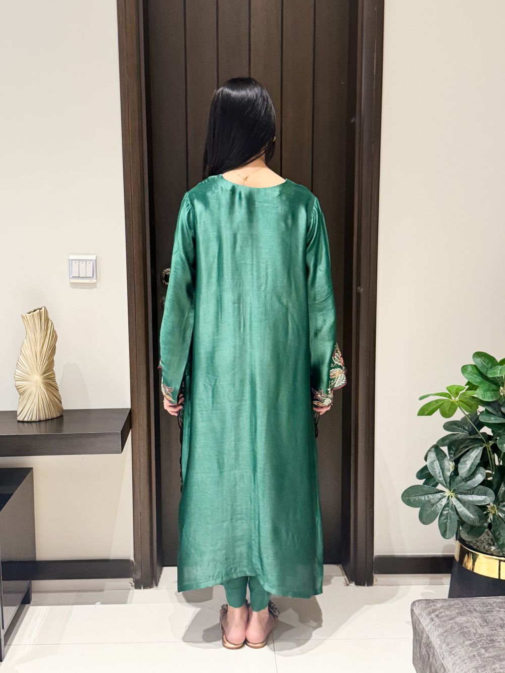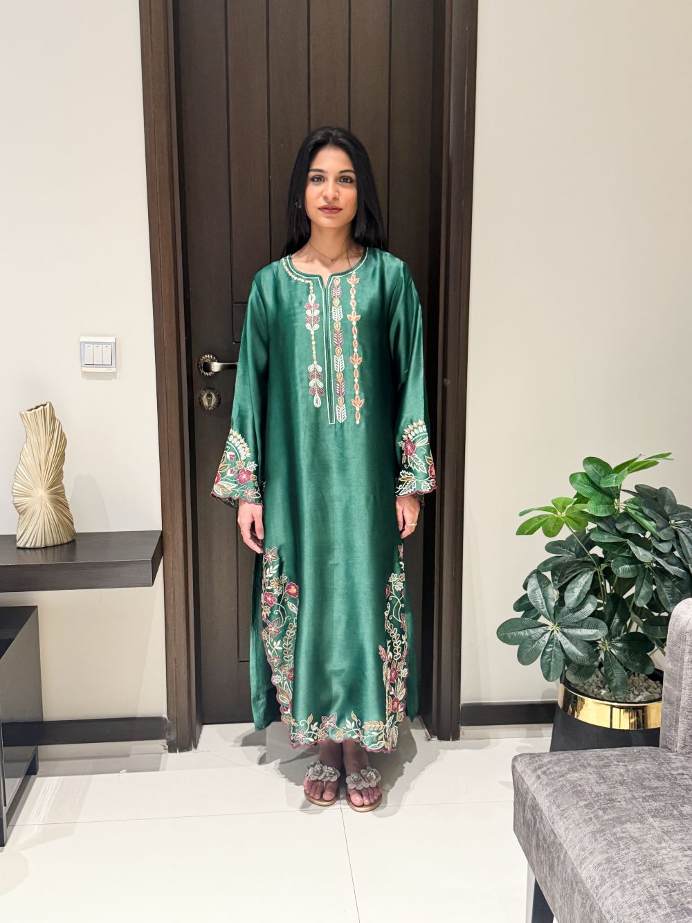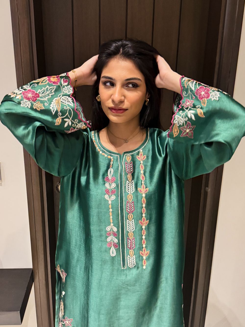 A vibrant green ensemble adorned with bright-colored embroidery on the neckline and daman, creating a lively and festive look. The intricate detailing adds depth and sophistication, making this outfit a perfect choice for Eid celebrations or special occasions. Combining traditional craftsmanship with contemporary elegance, it offers a cheerful yet refined statement for your wardrobe.