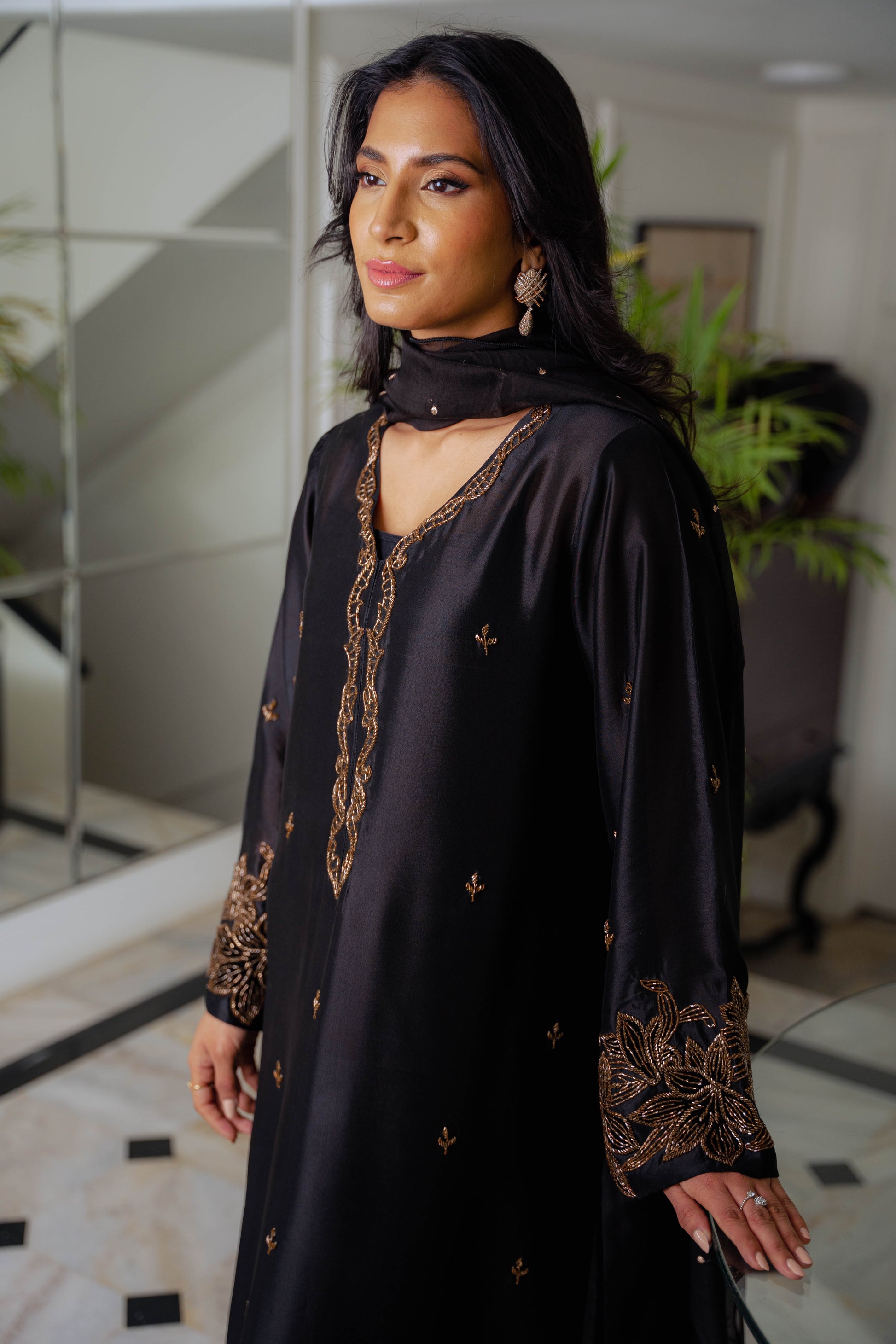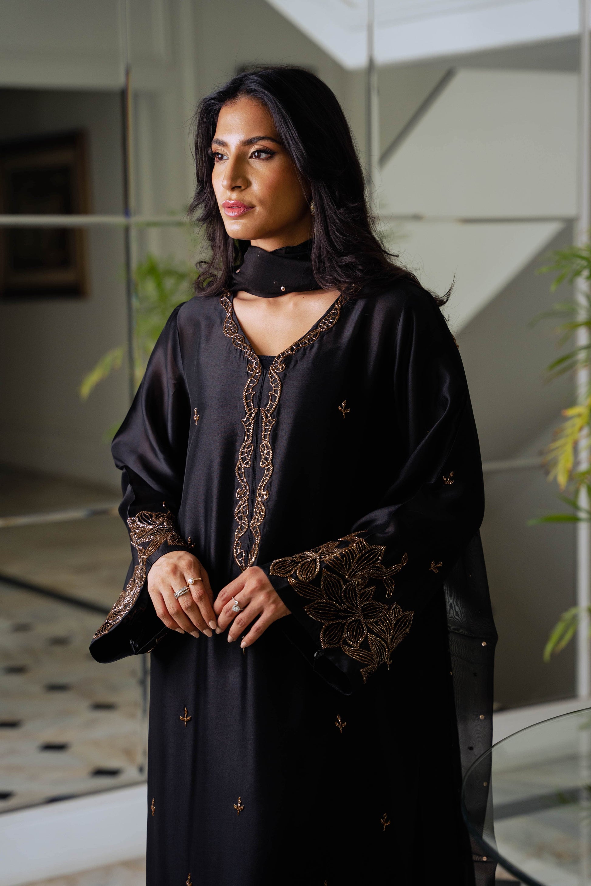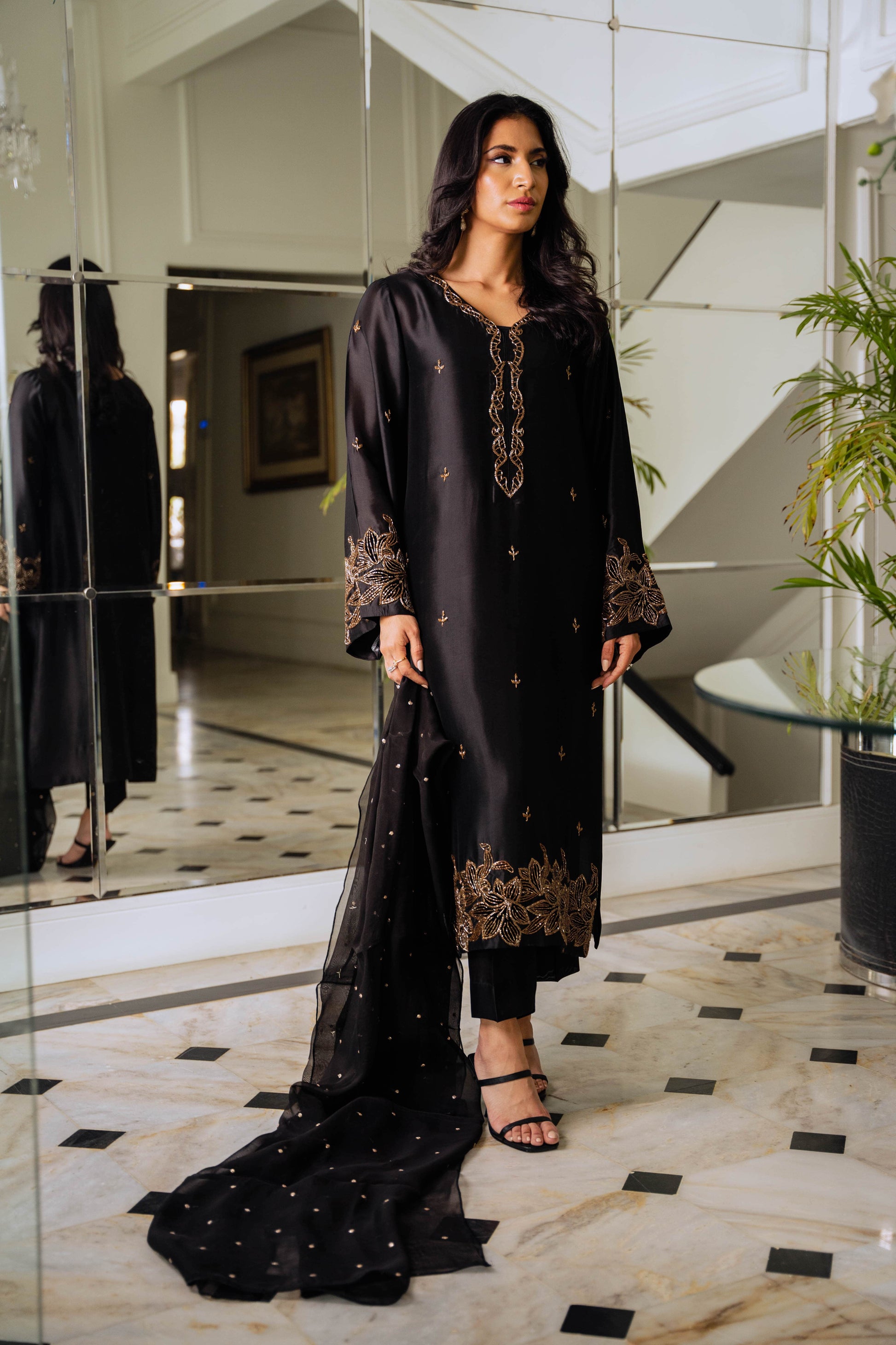 The Luna 3-piece dress showcases intricate velvet applique work with cutdana, a pure organza dupatta with floral cut work, and pure sheesha silk fabric for the shirt and pants make this Luna 3-piece dress a luxurious and timeless ensemble.