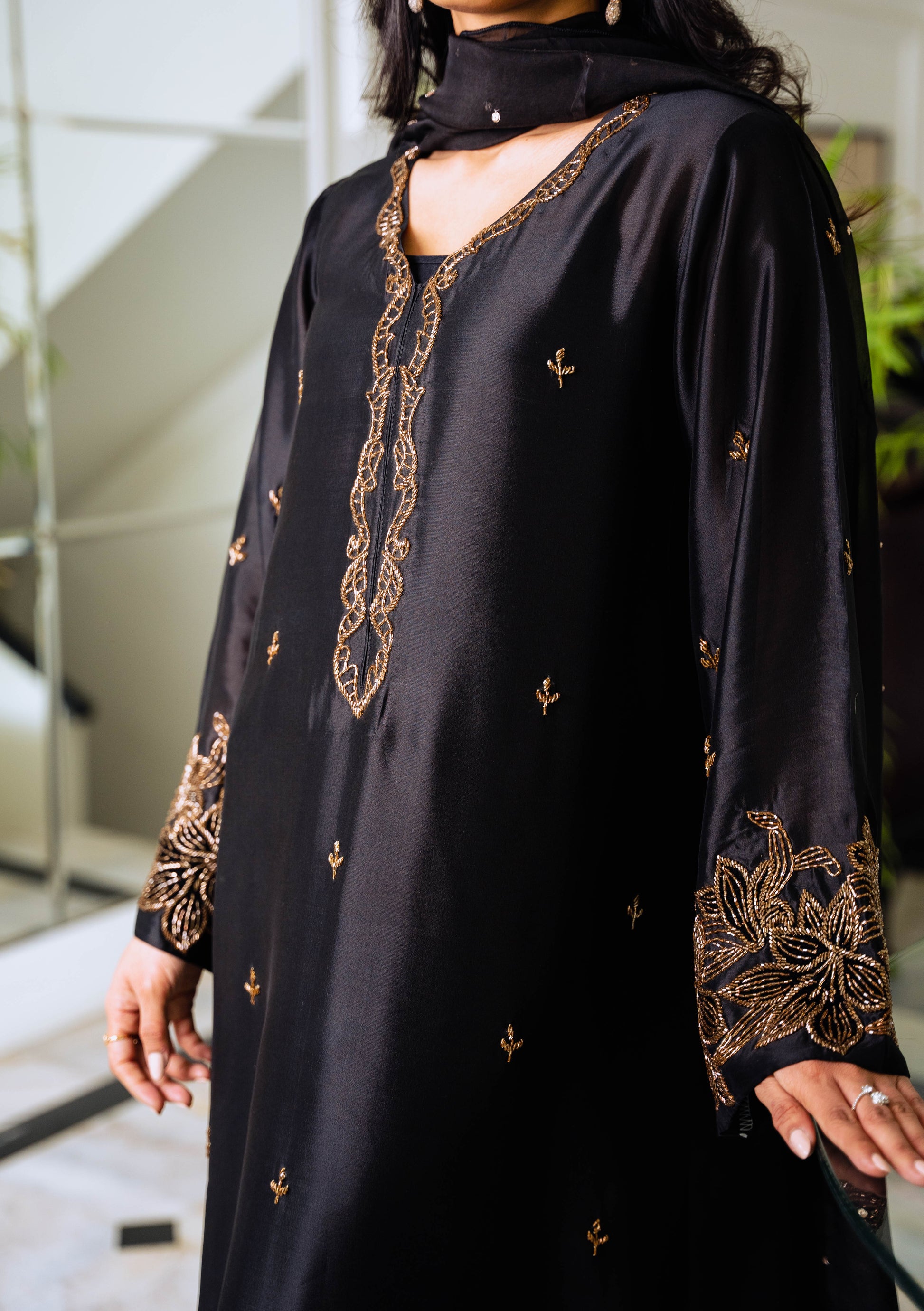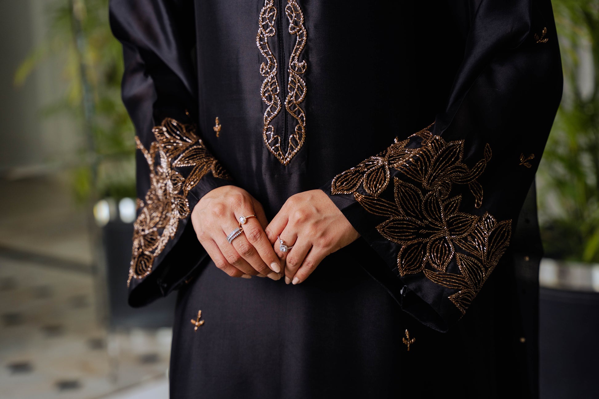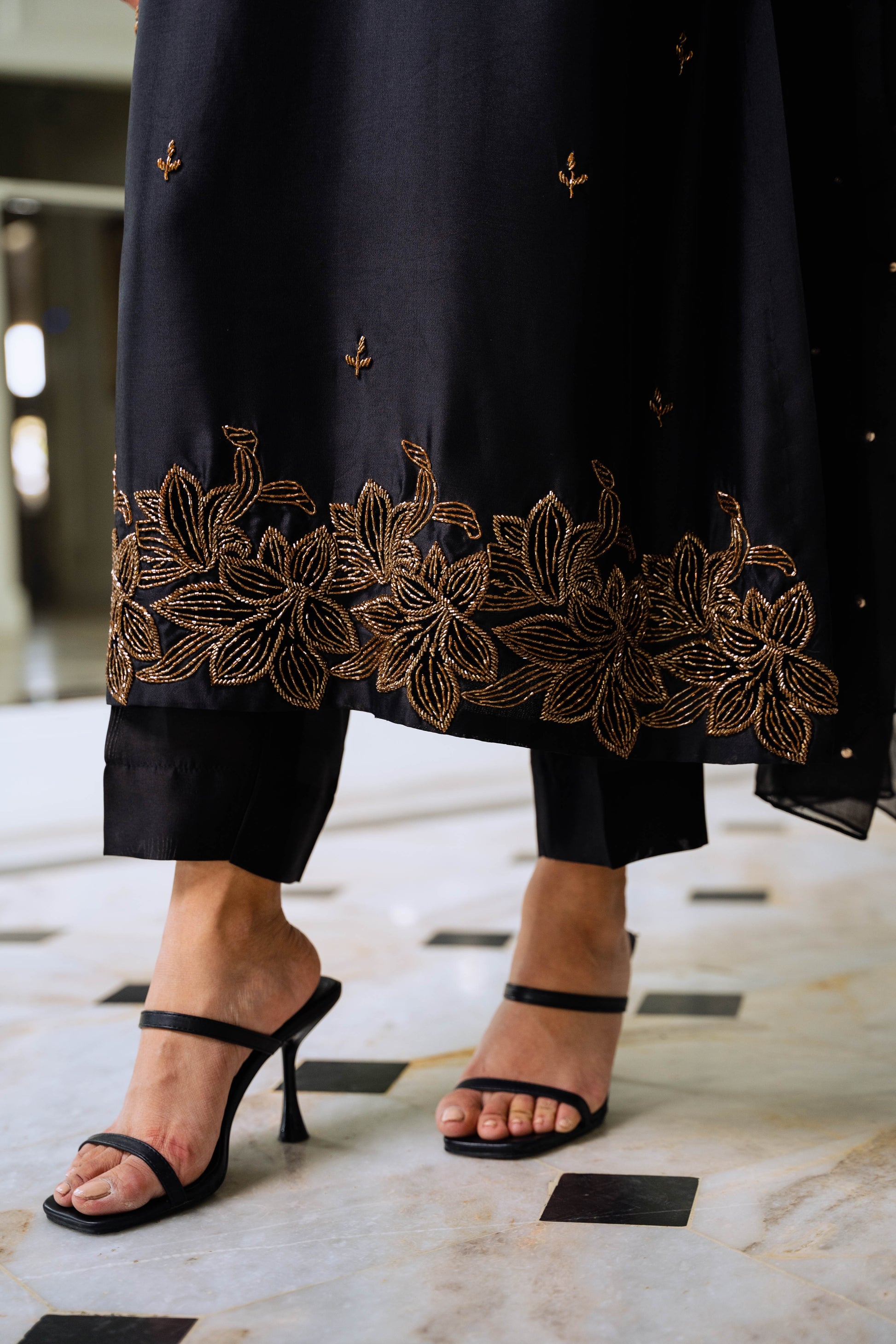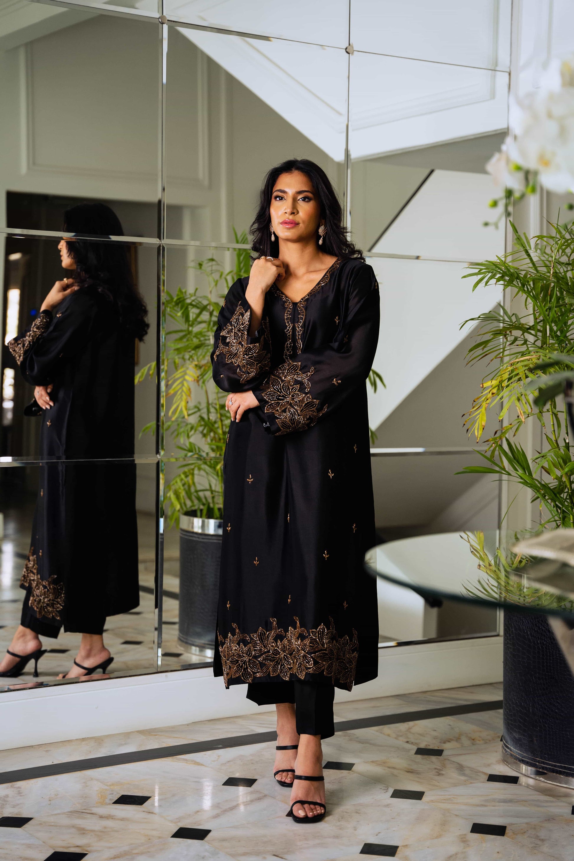 The Luna 3-piece dress showcases intricate velvet applique work with cutdana, a pure organza dupatta with floral cut work, and pure sheesha silk fabric for the shirt and pants make this Luna 3-piece dress a luxurious and timeless ensemble.