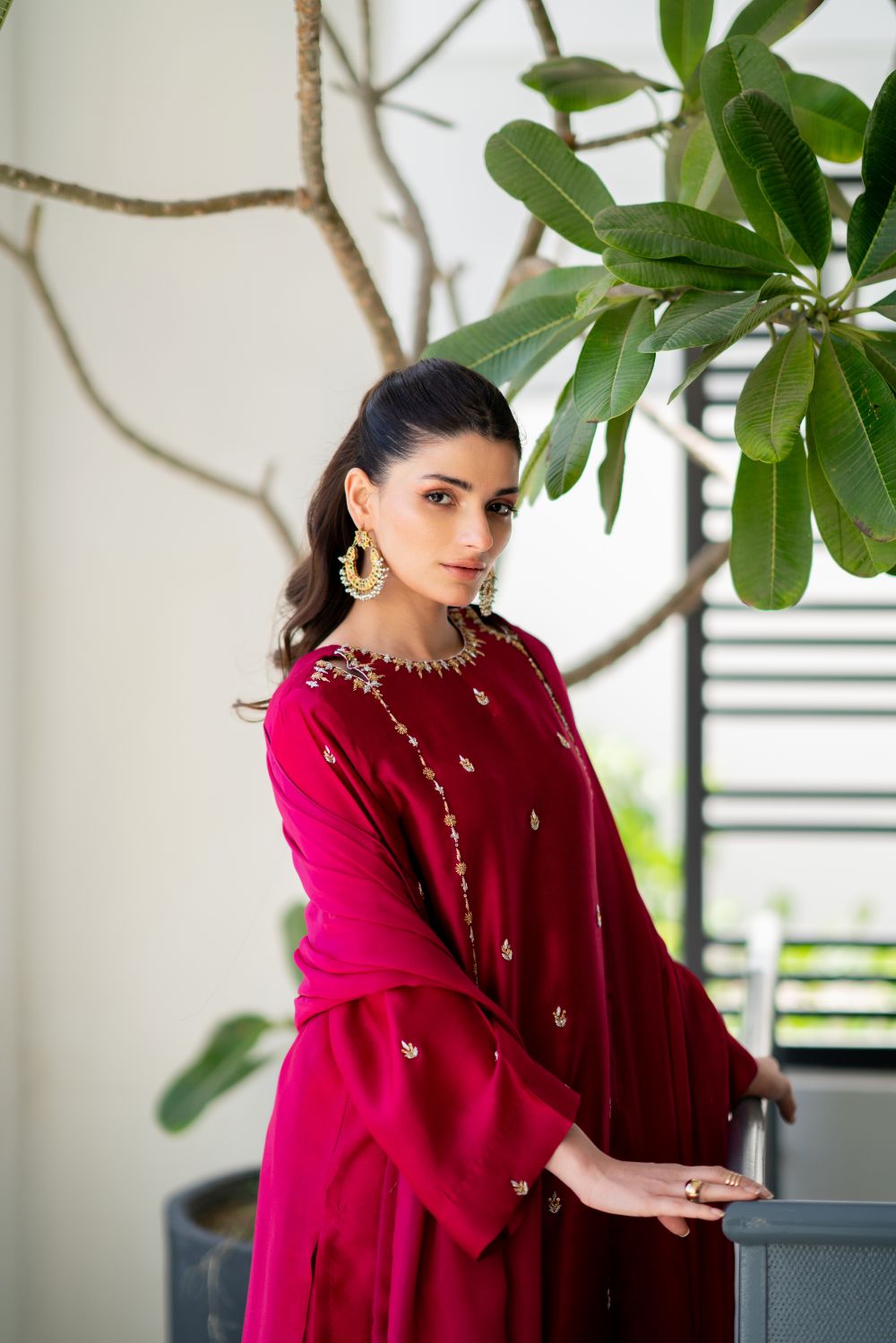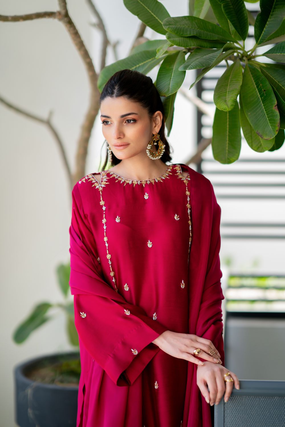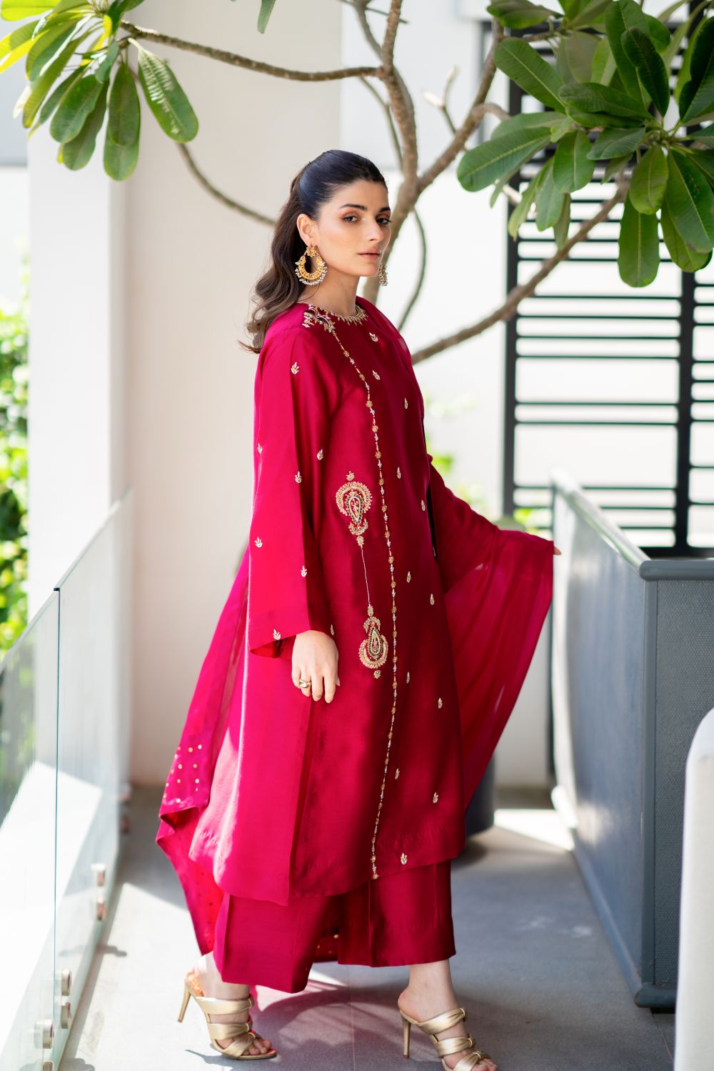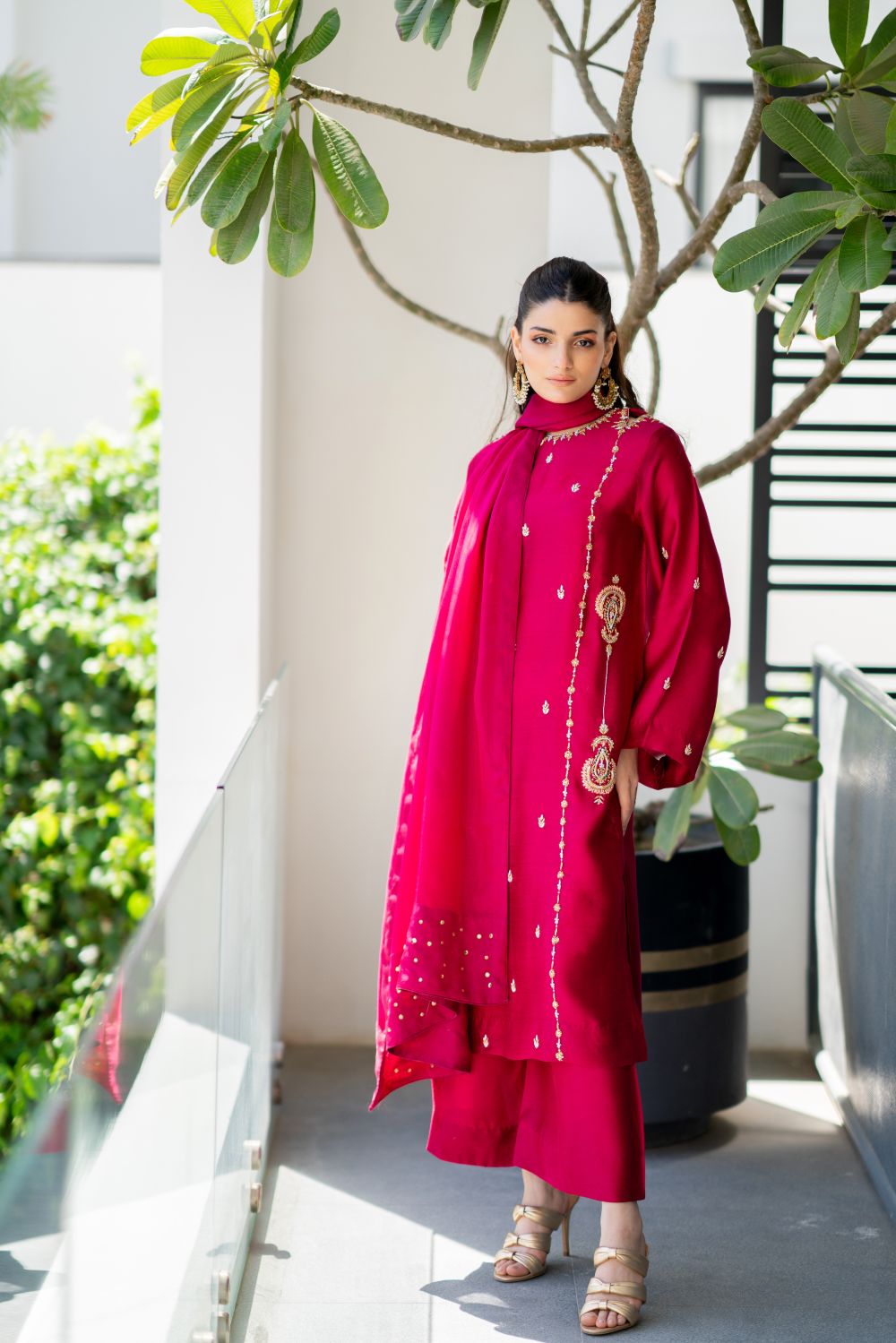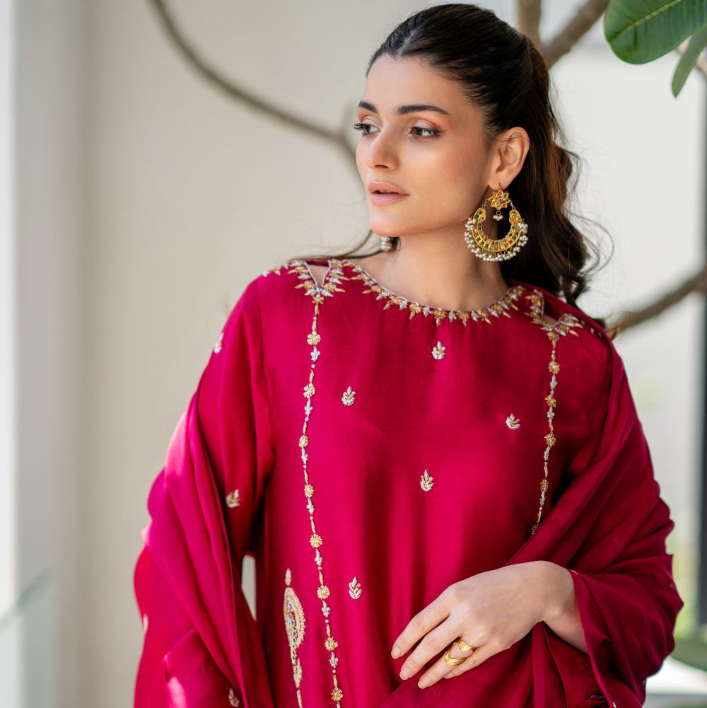 A vibrant hotpink hued shirt cut from sheesha silk is adorned with zardozi, sequence and resham addawork in bold multi-tones. Featuring a modern cut neckline, the shirt is paired with culottes and a pure silk chiffon dupatta with details of sequence at edges.