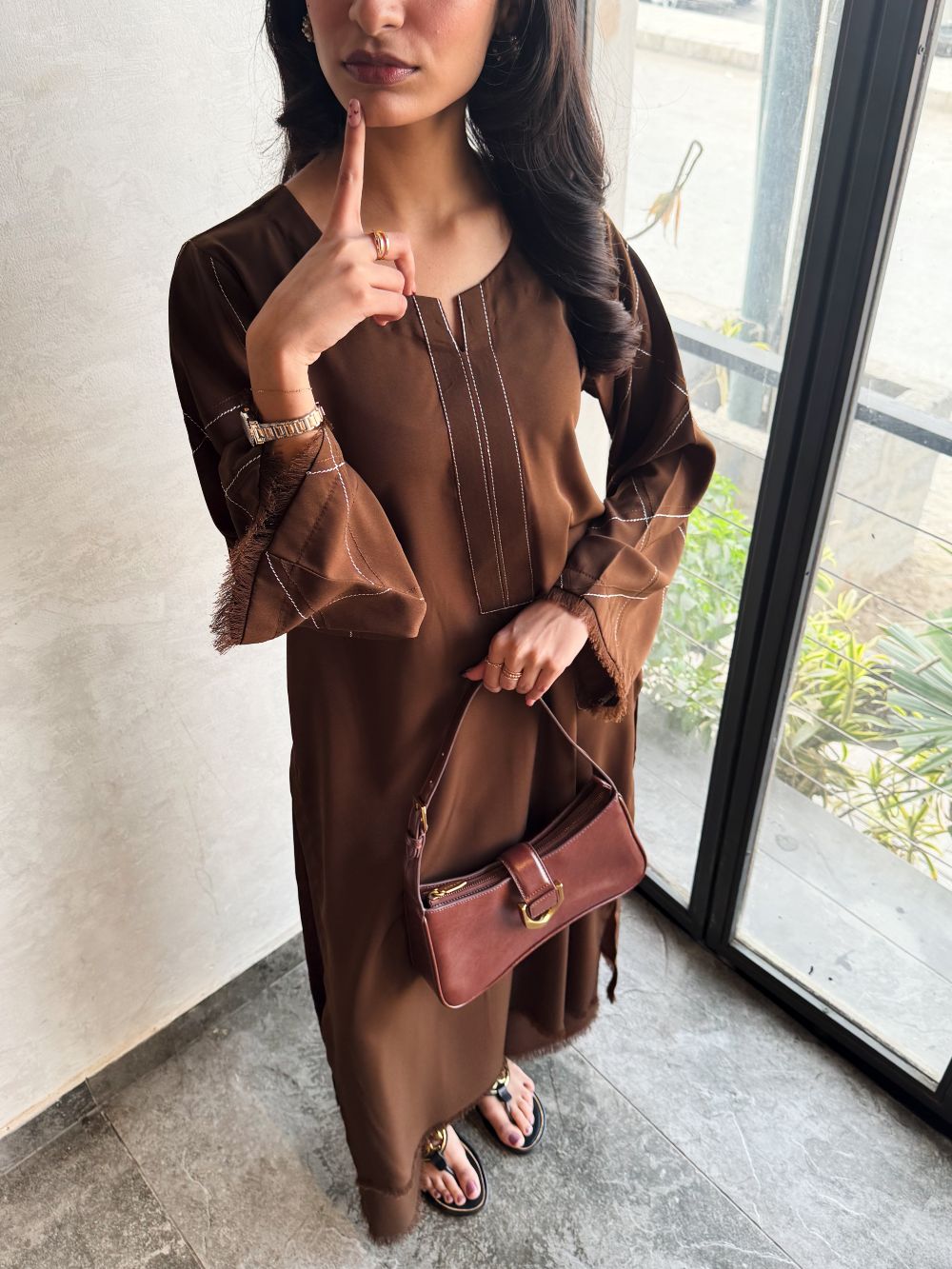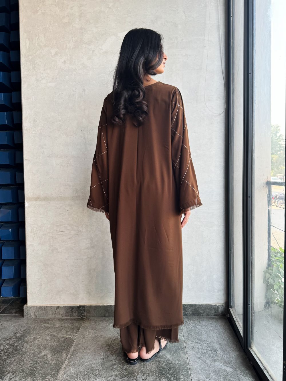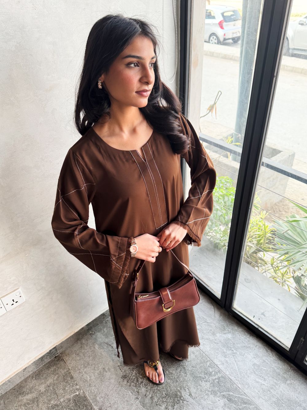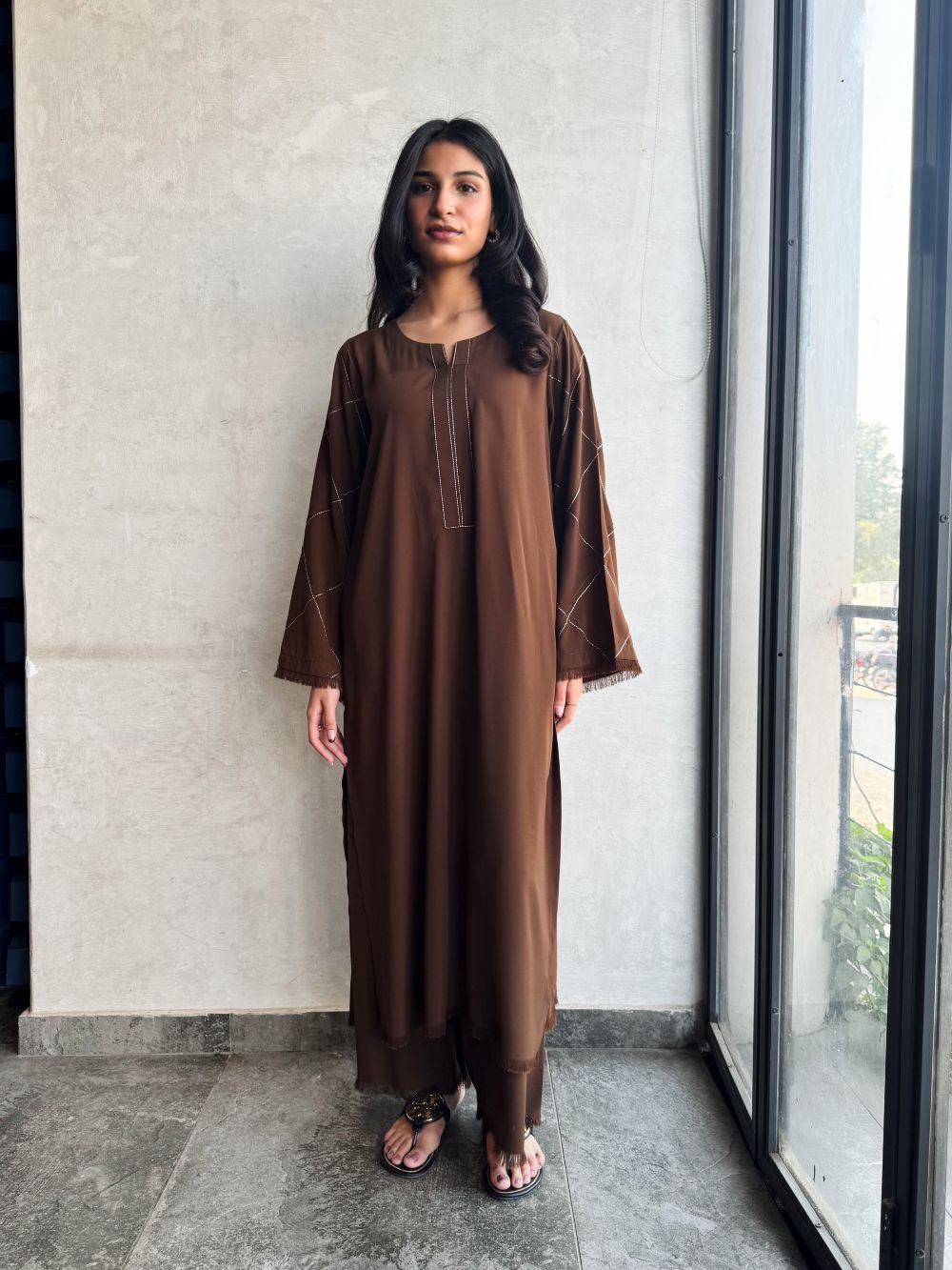 Elegant Chocolate brown long shirt with plazo, featuring a plain front with delicate line embroidery on the neckline and pintex detailing on the sleeves enhanced with fine embroidery. A minimal yet refined ensemble, ideal for daily wear.