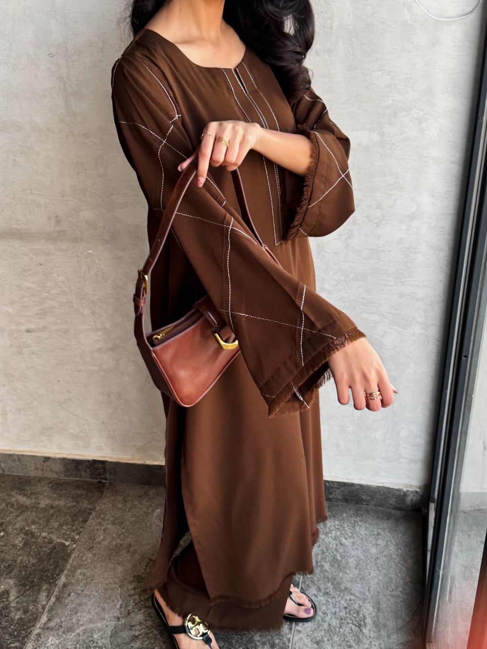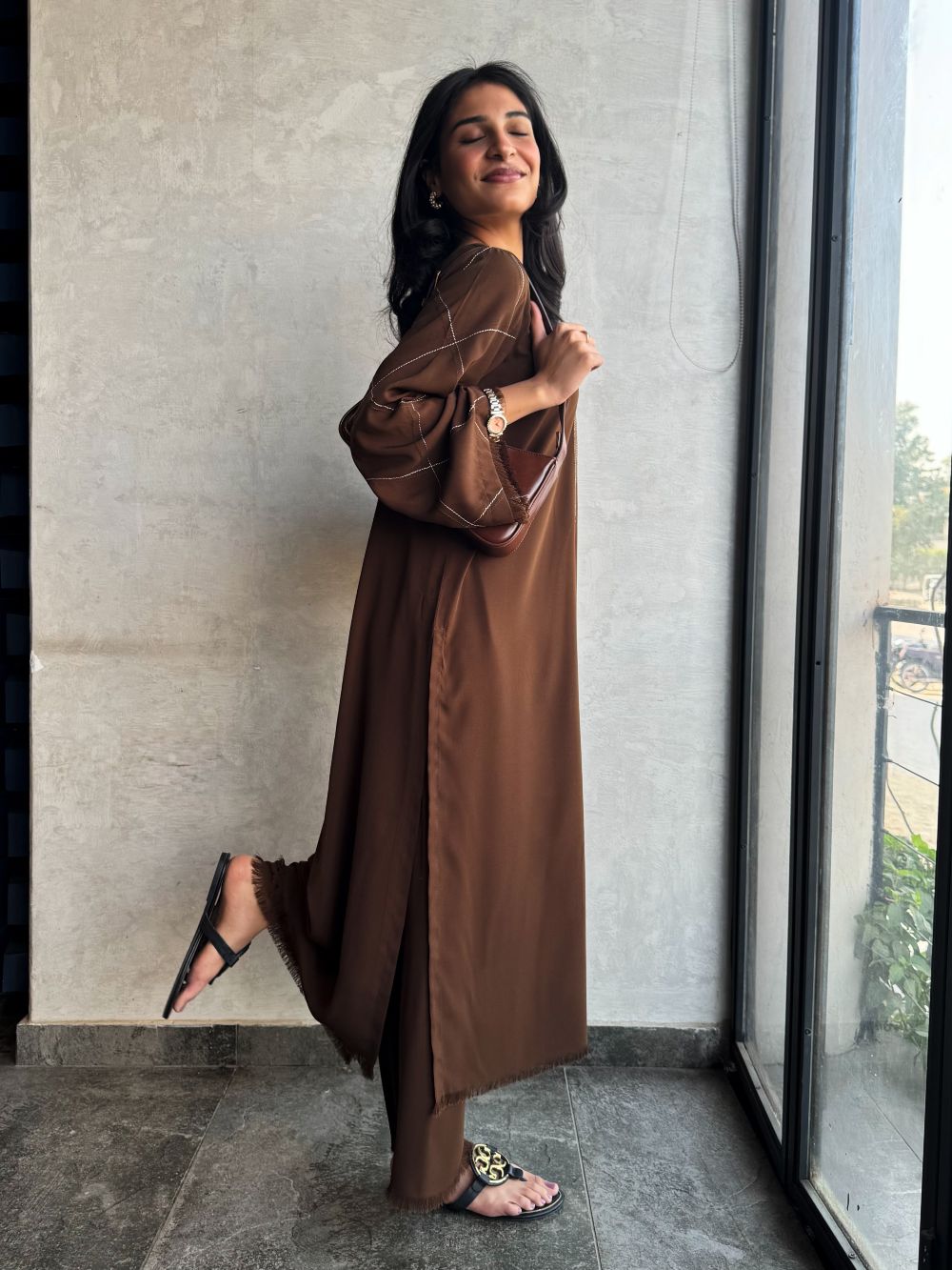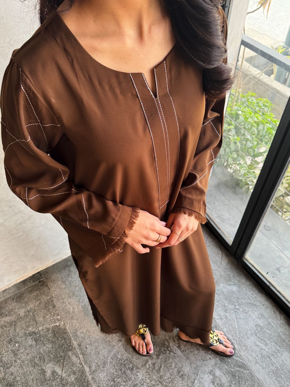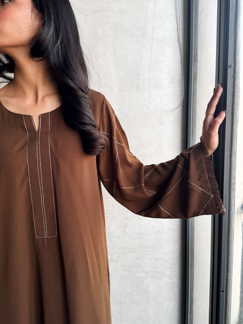 Elegant Chocolate brown long shirt with plazo, featuring a plain front with delicate line embroidery on the neckline and pintex detailing on the sleeves enhanced with fine embroidery. A minimal yet refined ensemble, ideal for daily wear.