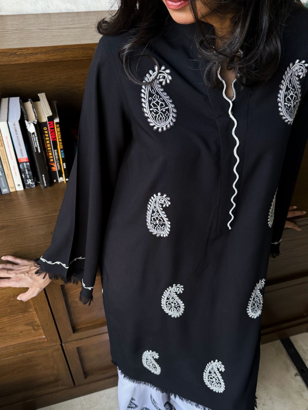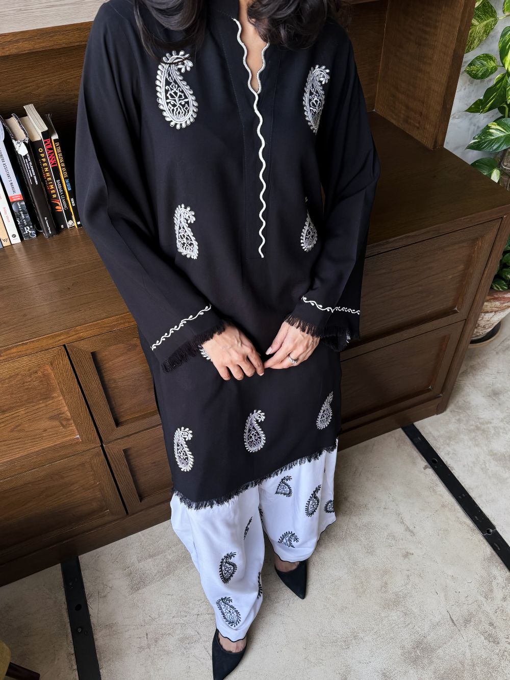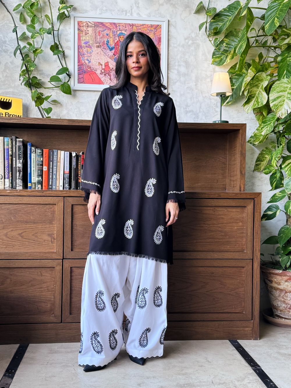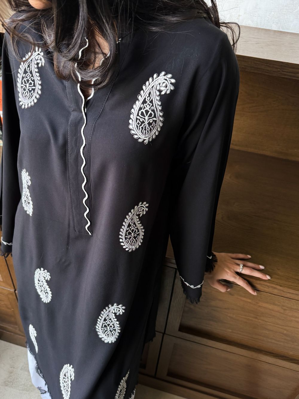 Black short shirt adorned with white paisley embroidery, featuring scalloped detailing on the neckline. The sleeves showcase delicate thread work and embroidery. Paired with a white farshi shalwar highlighted with black embroidery and scalloped detailing at the hem, this ensemble offers a striking contrast, perfect for daytime wear and casual festive.