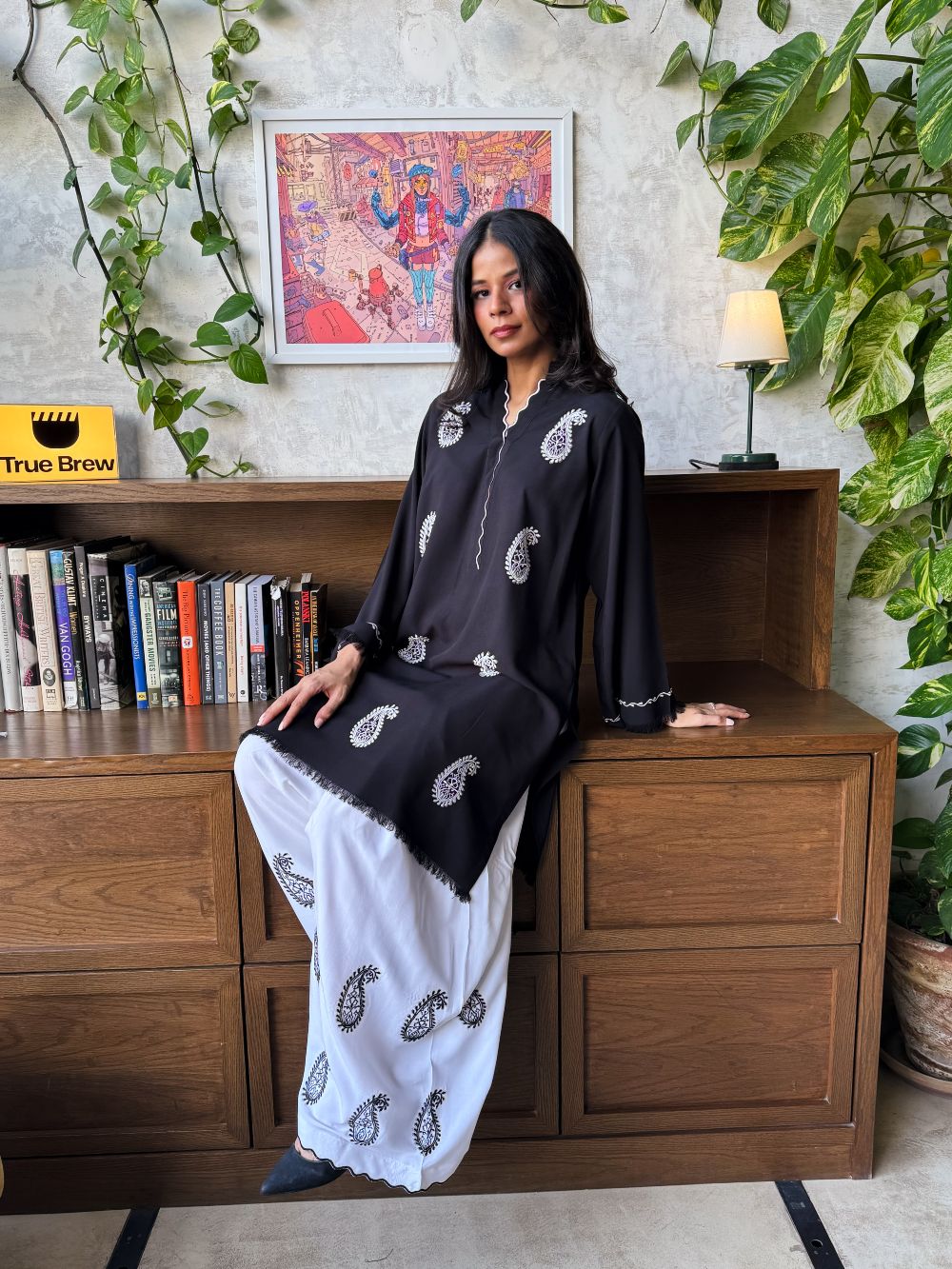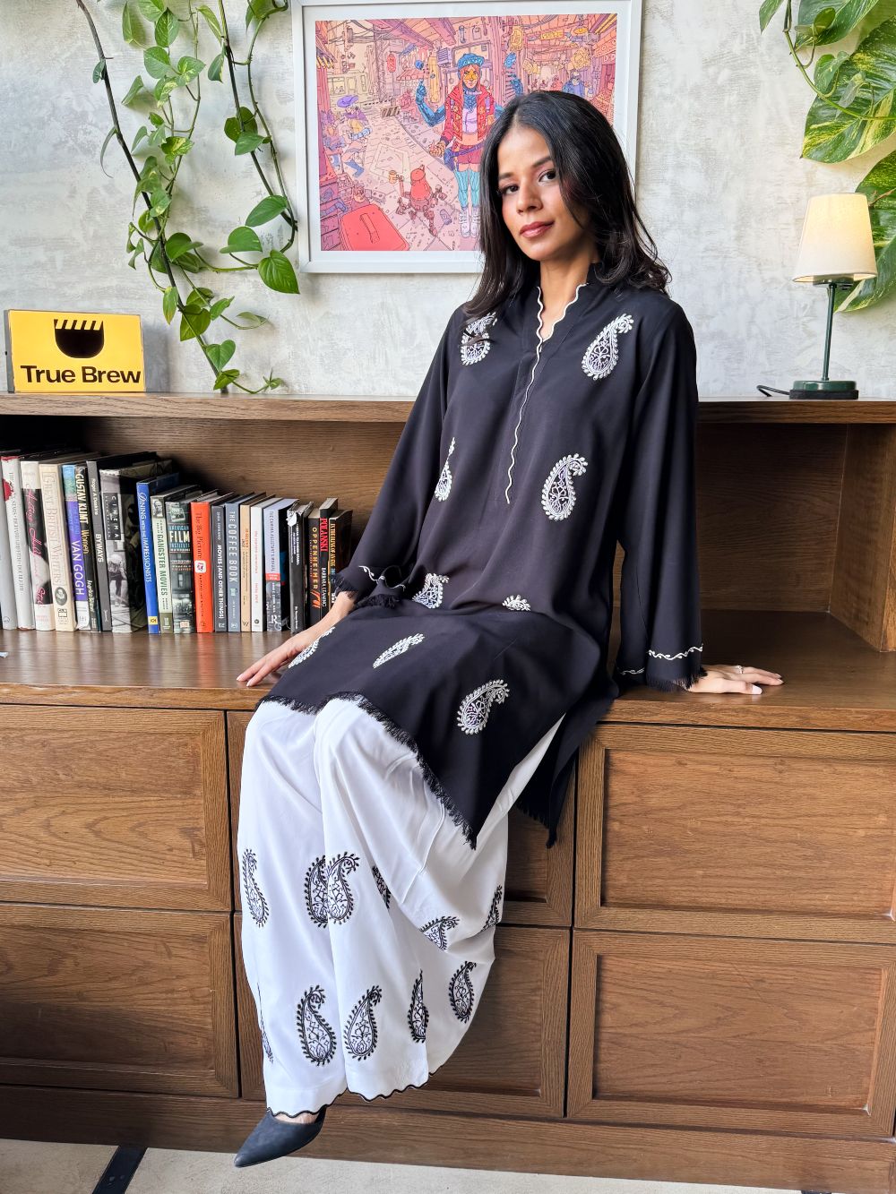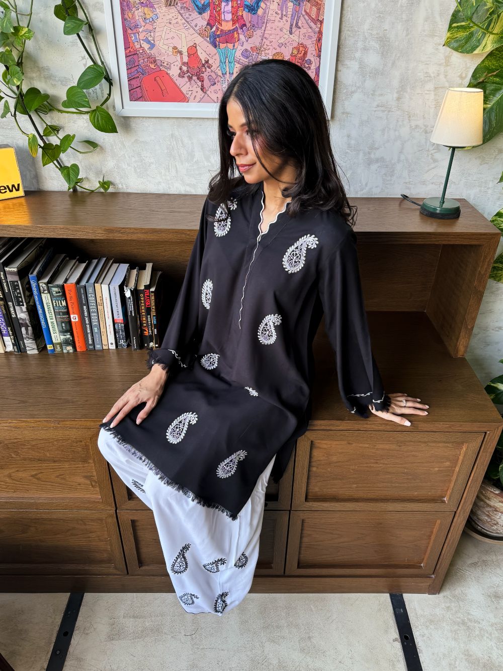 Black short shirt adorned with white paisley embroidery, featuring scalloped detailing on the neckline. The sleeves showcase delicate thread work and embroidery. Paired with a white farshi shalwar highlighted with black embroidery and scalloped detailing at the hem, this ensemble offers a striking contrast, perfect for daytime wear and casual festive.