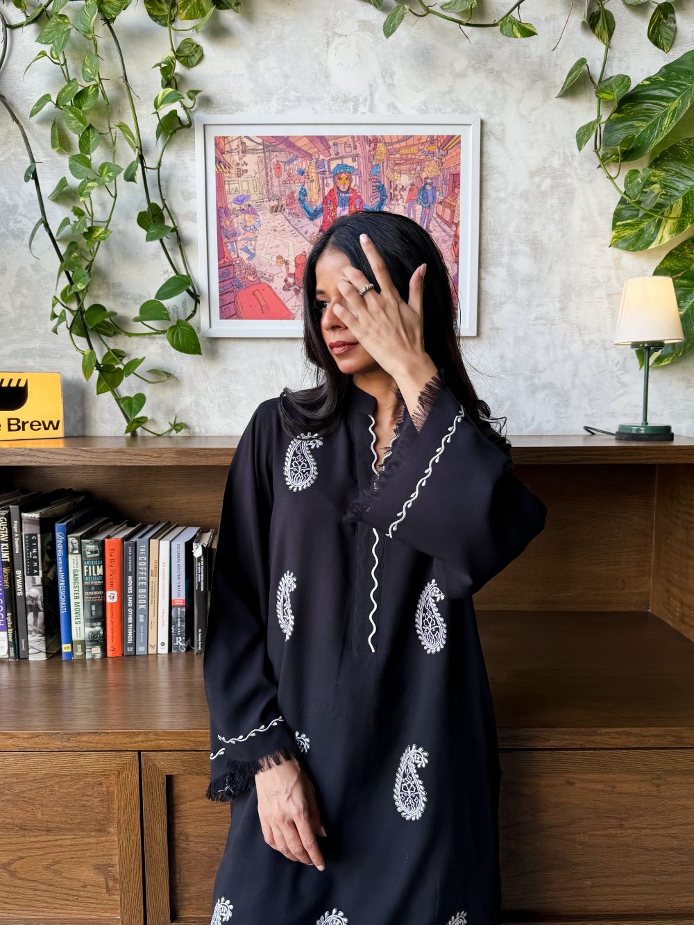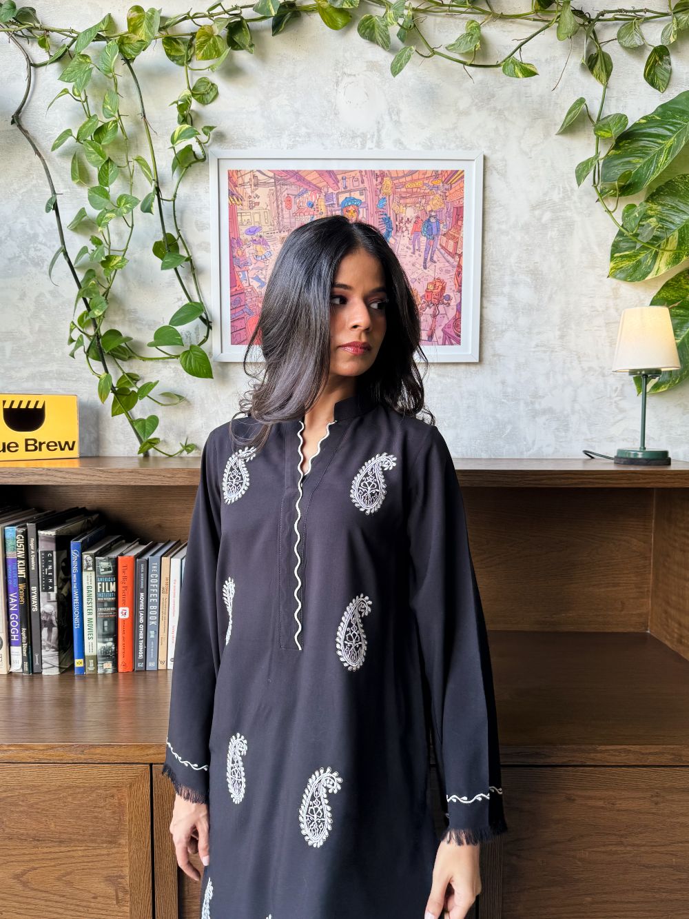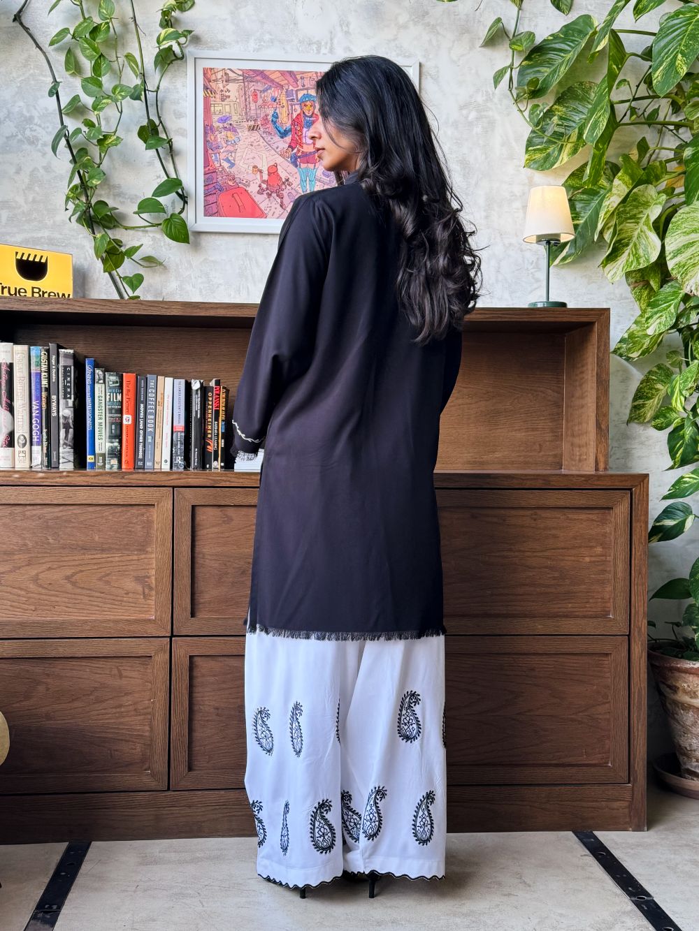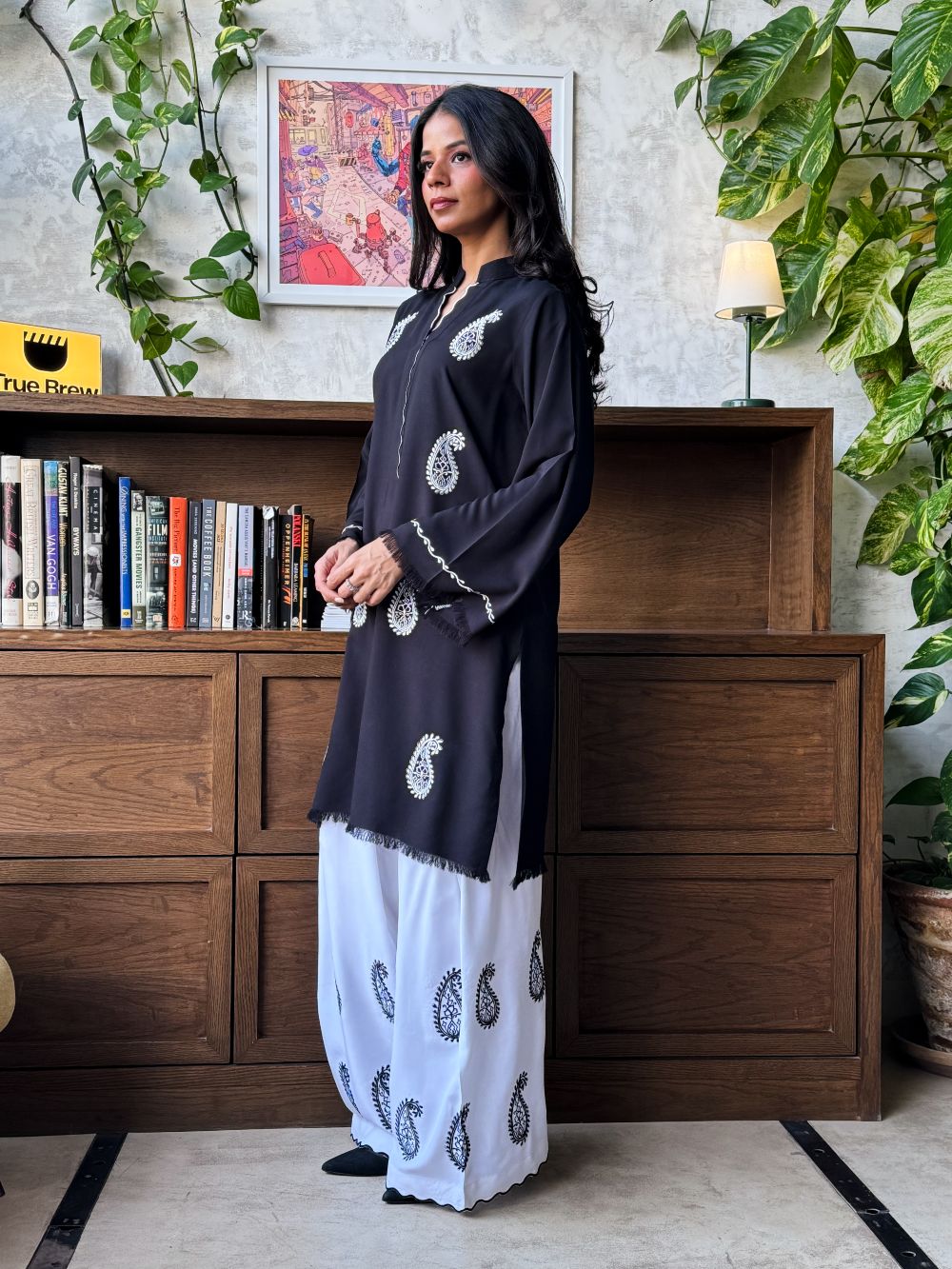 Black short shirt adorned with white paisley embroidery, featuring scalloped detailing on the neckline. The sleeves showcase delicate thread work and embroidery. Paired with a white farshi shalwar highlighted with black embroidery and scalloped detailing at the hem, this ensemble offers a striking contrast, perfect for daytime wear and casual festive.