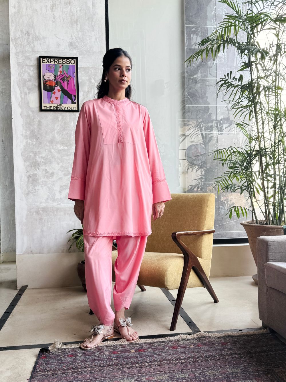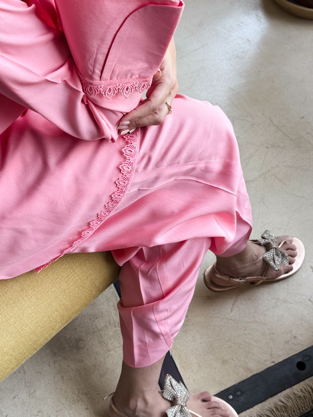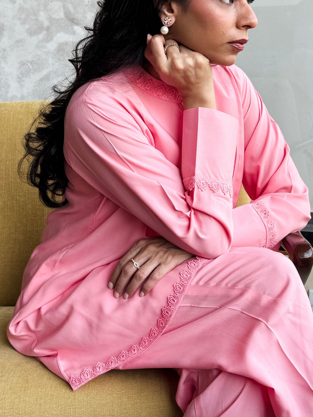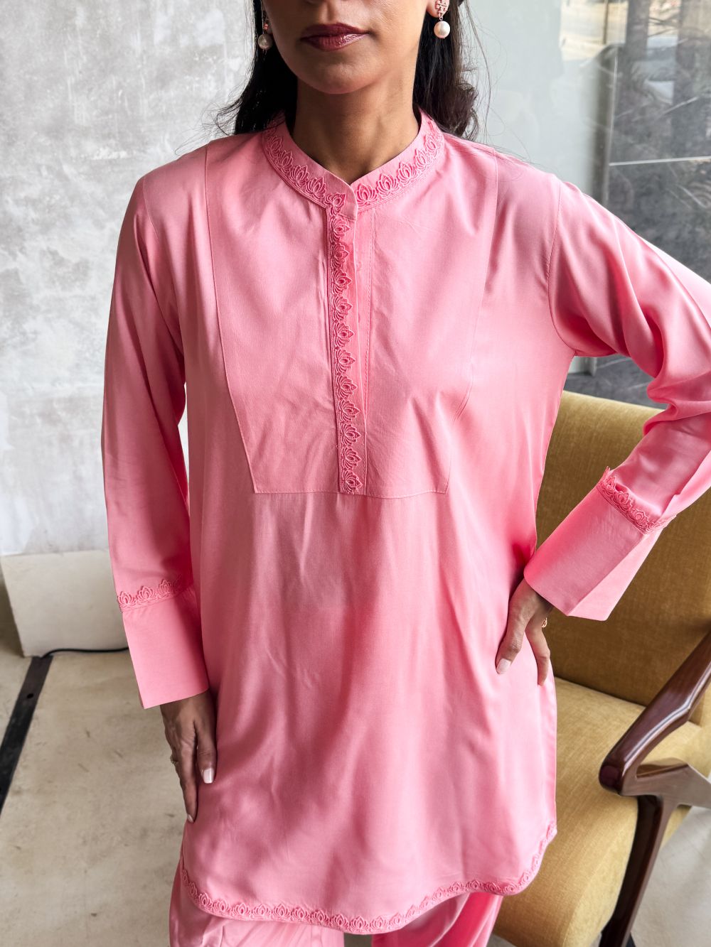 Plain basic bright pink short shirt enhanced with delicate lace detailing, paired with a matching shalwar. A simple yet elegant ensemble, perfect for everyday wear and casual occassions.