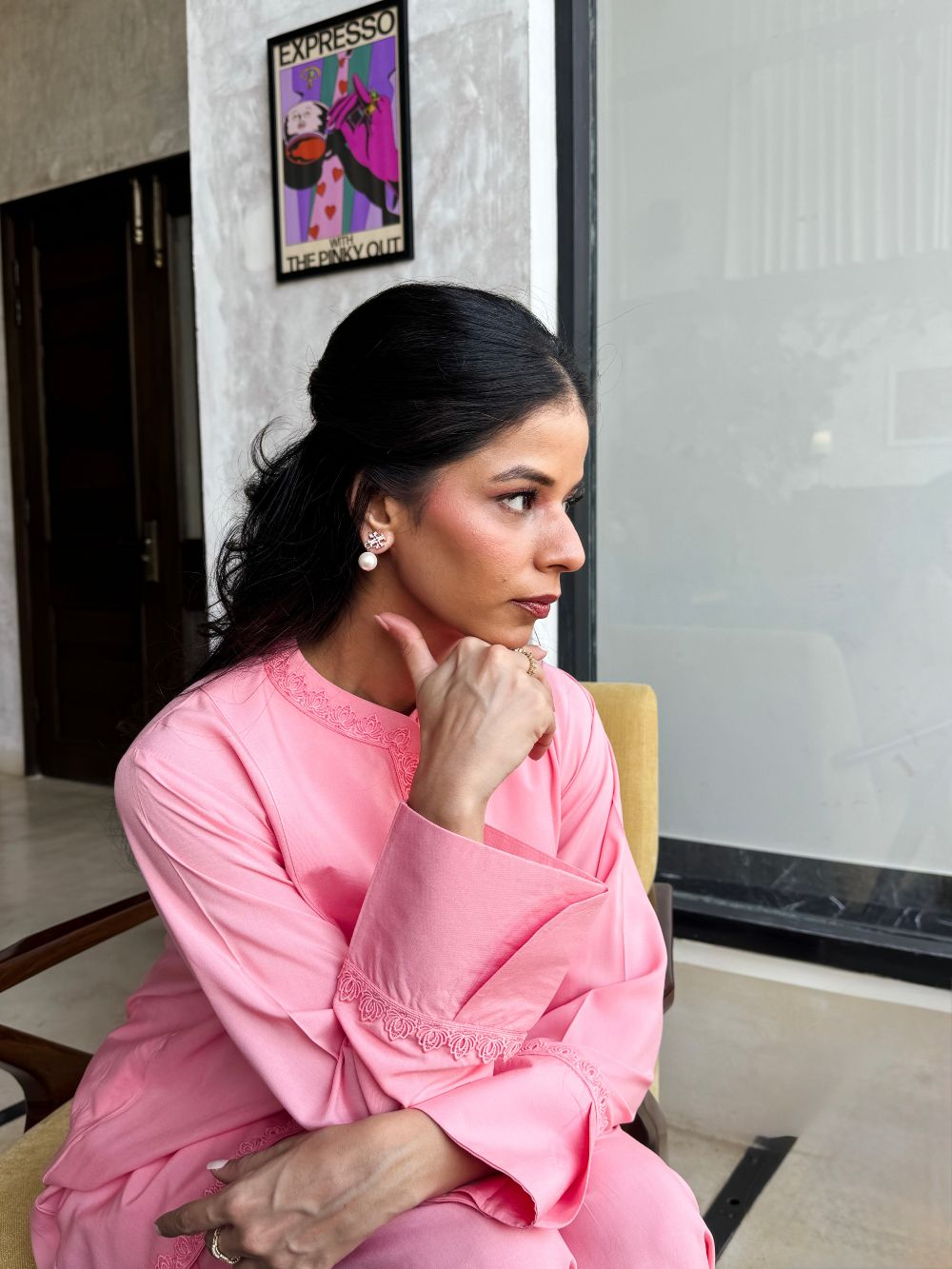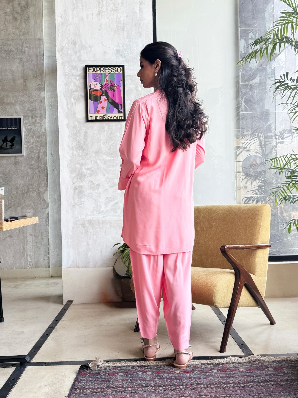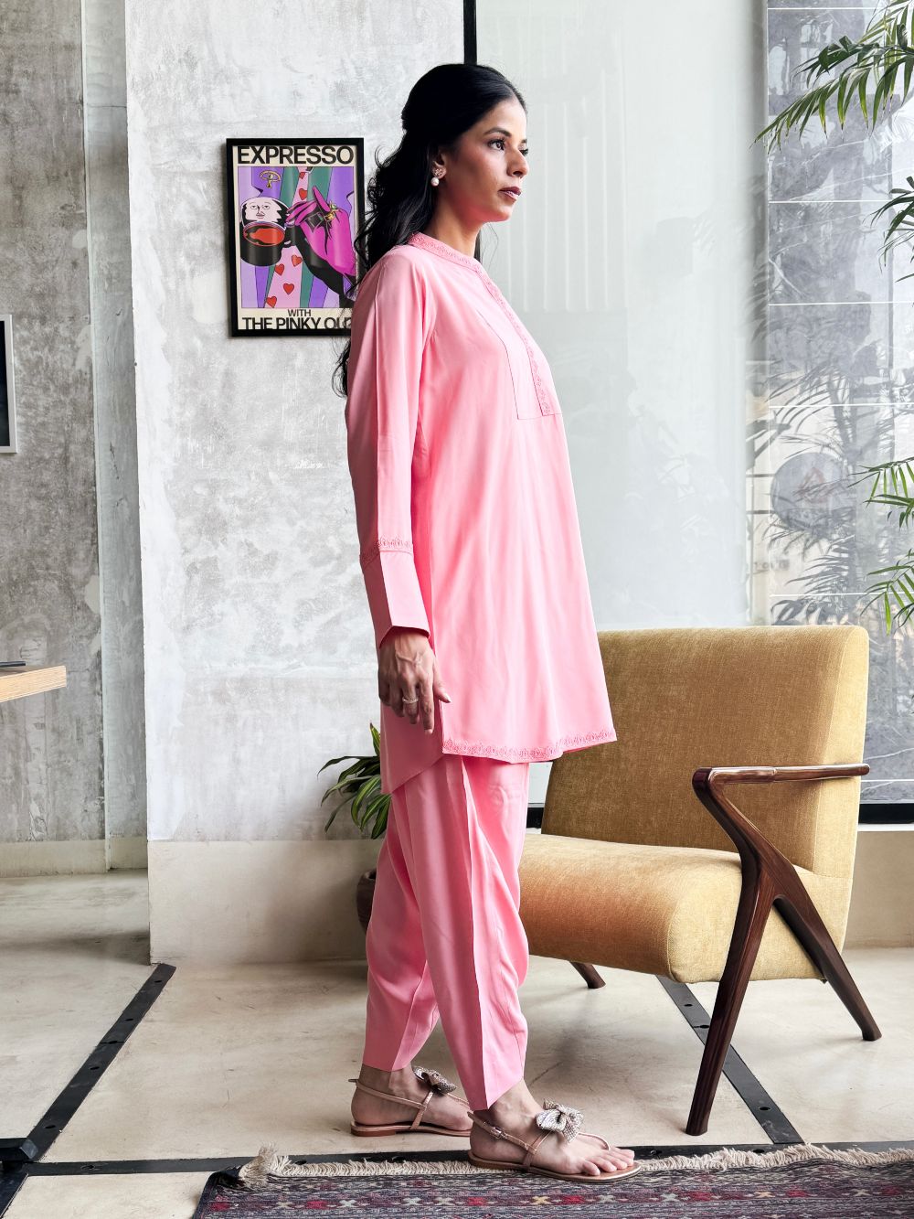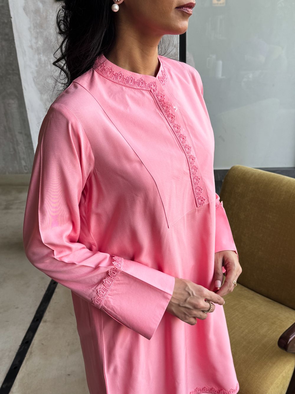 Plain basic bright pink short shirt enhanced with delicate lace detailing, paired with a matching shalwar. A simple yet elegant ensemble, perfect for everyday wear and casual occassions.