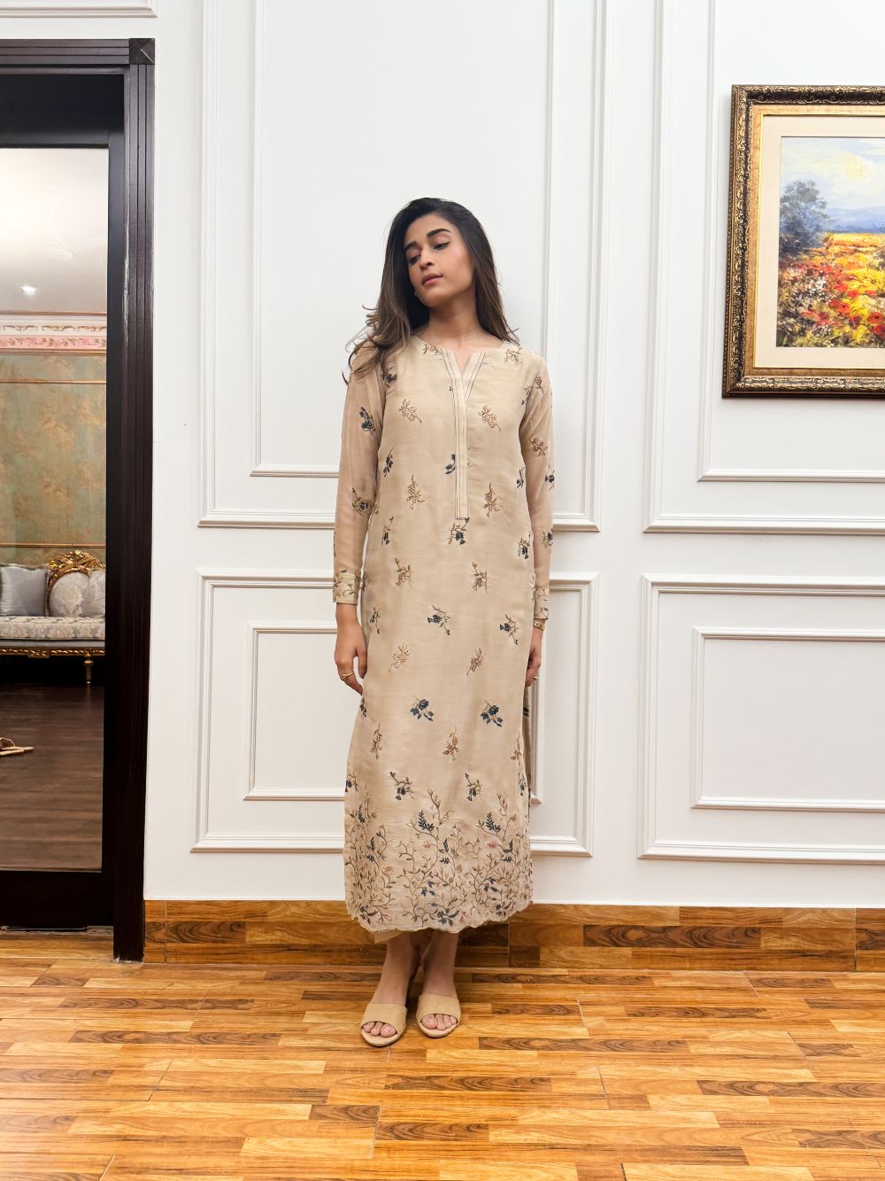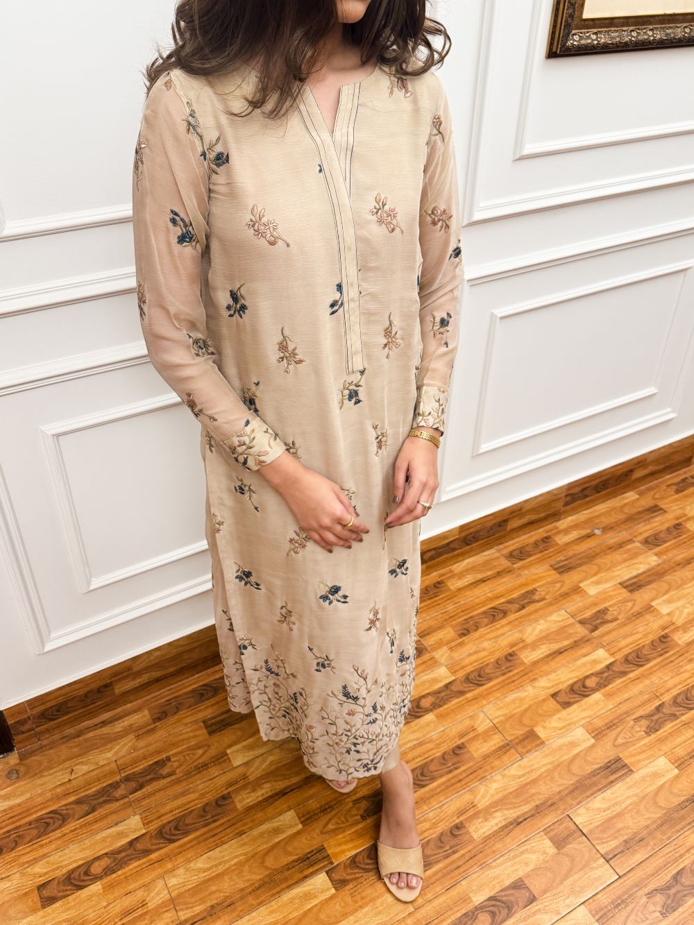 This beige long shirt with straight trousers is stitched in embroidered chiffon fabric, giving it a light and graceful feel. The pleated neckline adds subtle sophistication, while the matching chiffon dupatta completes the look.