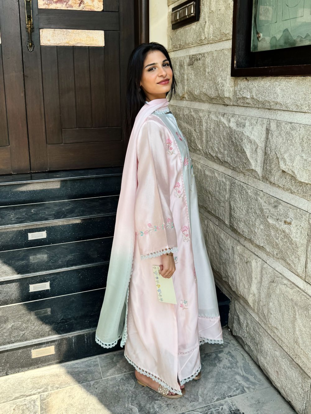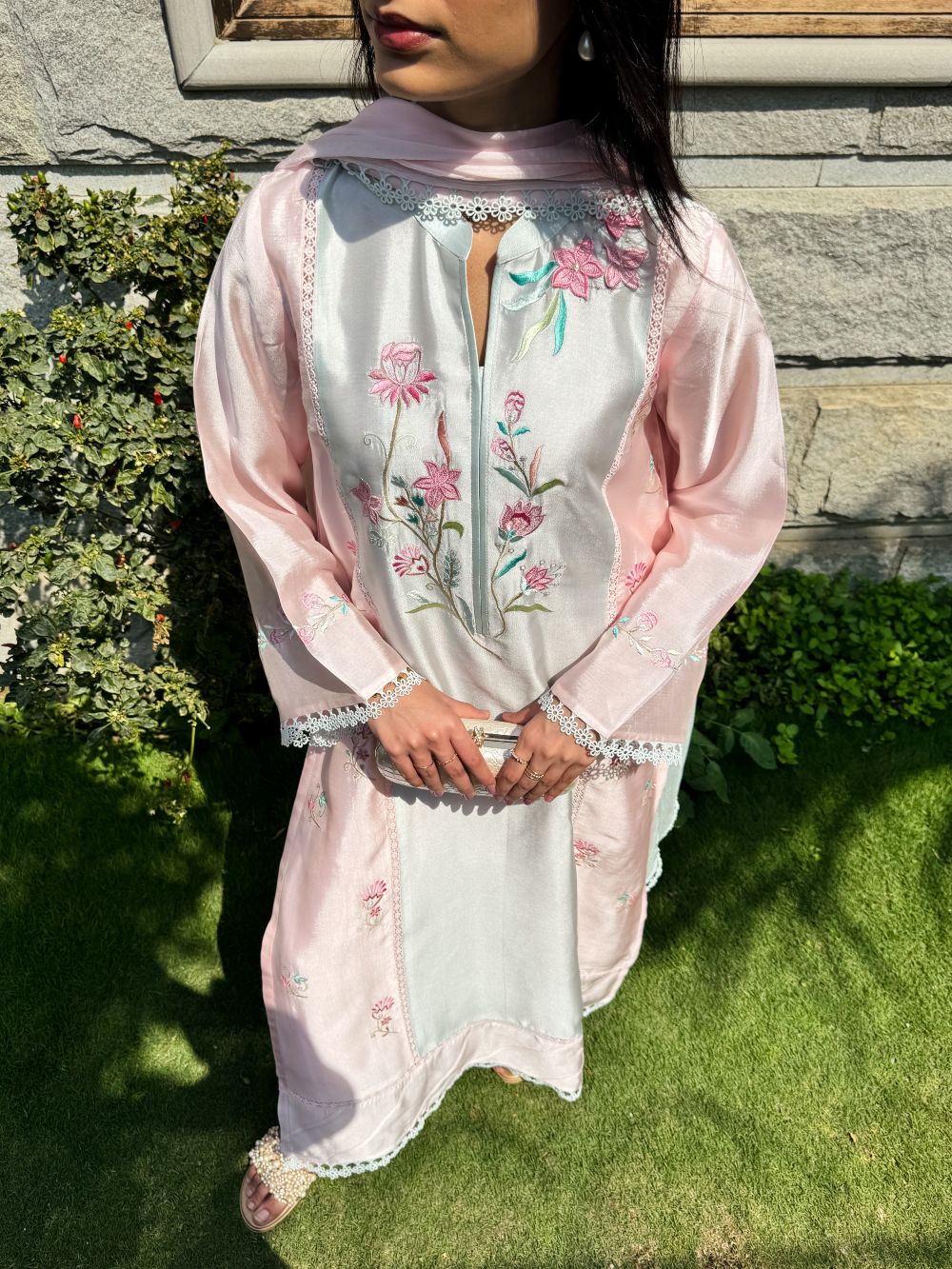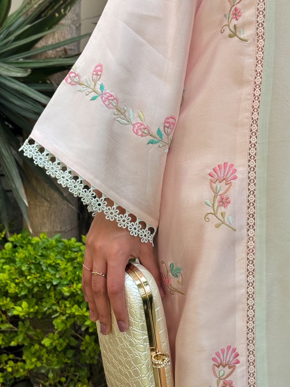 A dreamy pastel ensemble in powder pink and ice blue, adorned with delicate embroidery and intricate lace detailing. The neckline features elegant embroidery, complemented by exquisite 3D floral motifs for a soft, feminine touch. Perfectly paired with matching bottoms and a flowing dupatta, this outfit embodies grace, charm, and festive sophistication — ideal for Eid celebrations or special occasions.