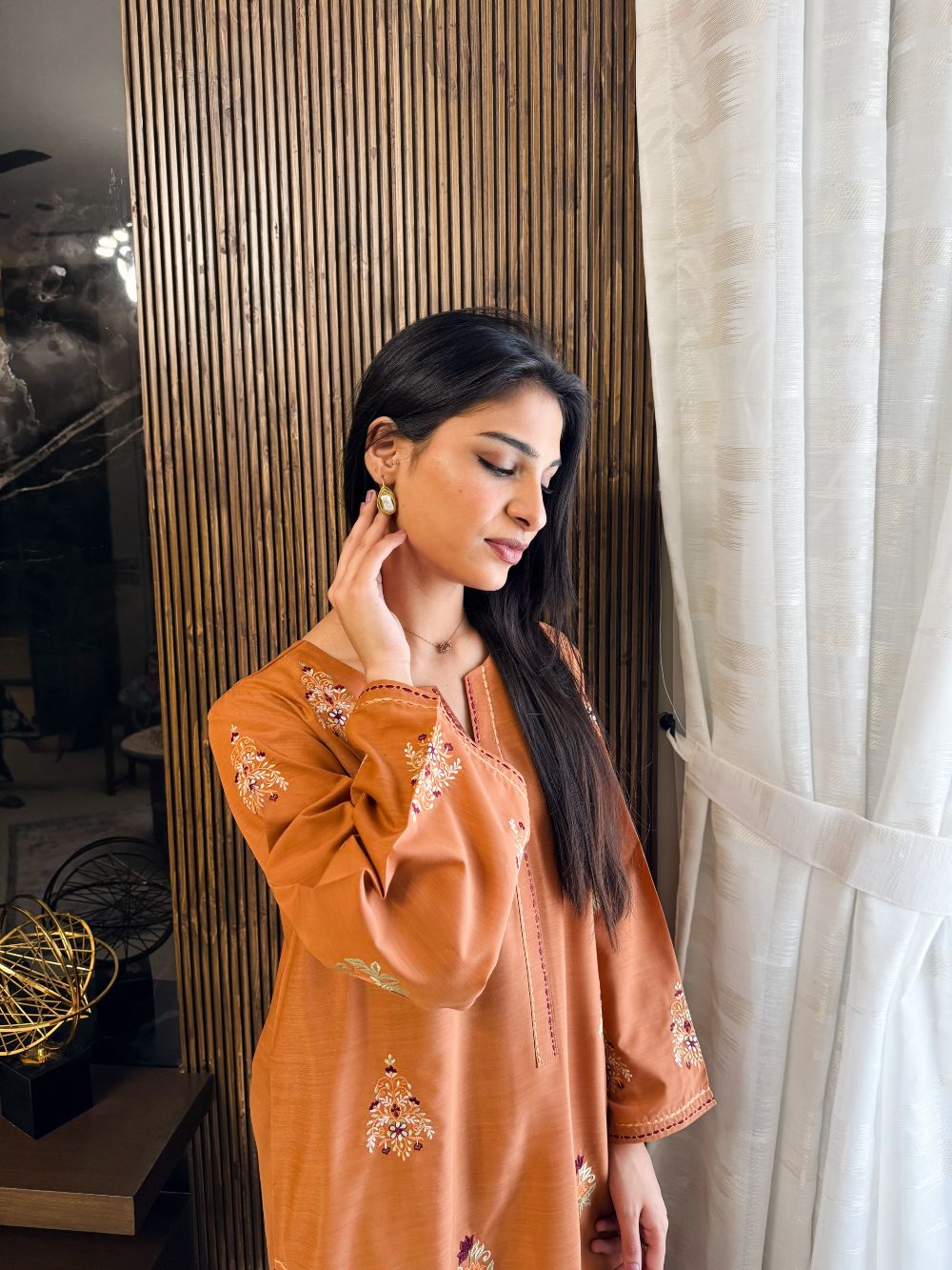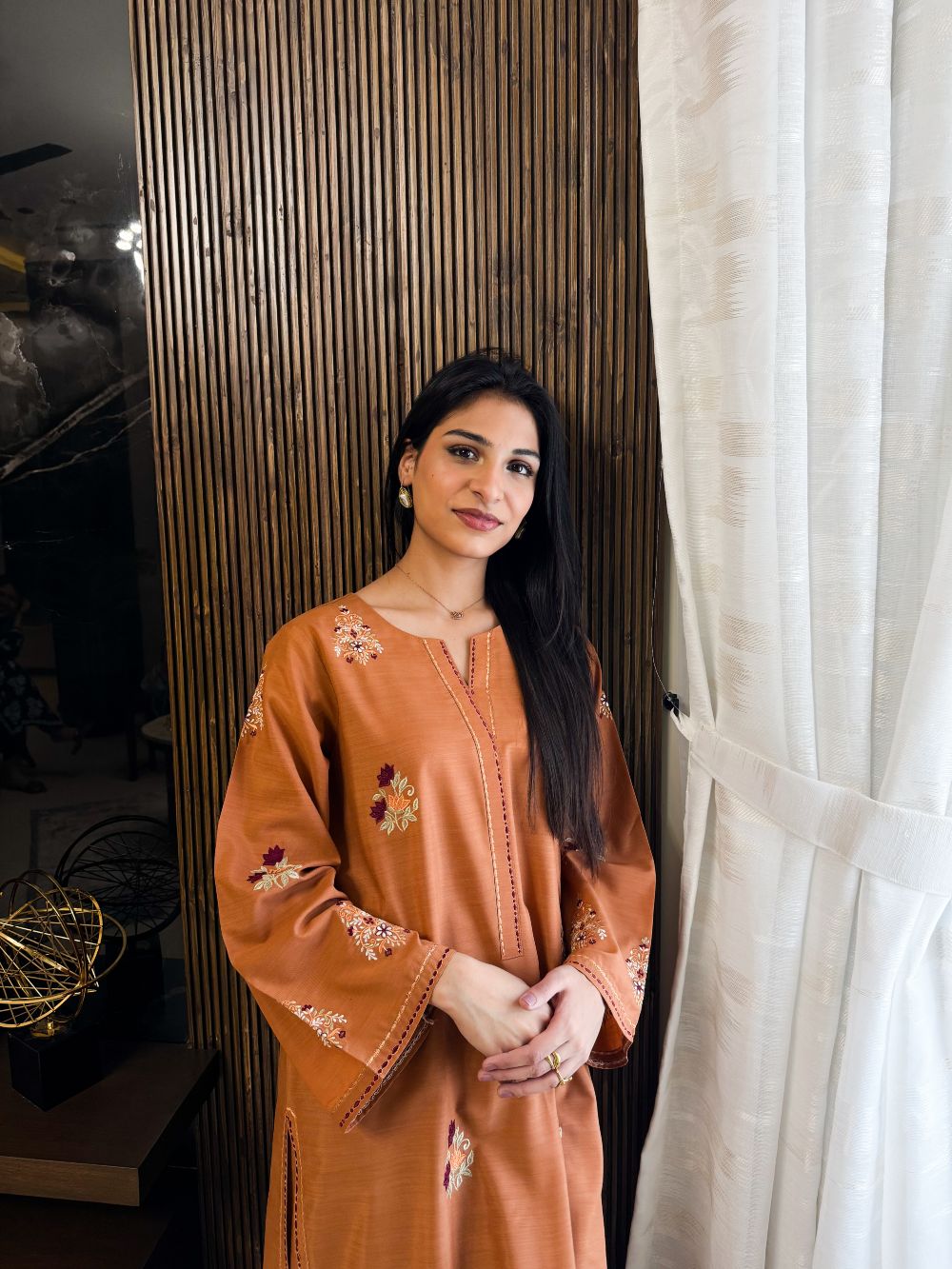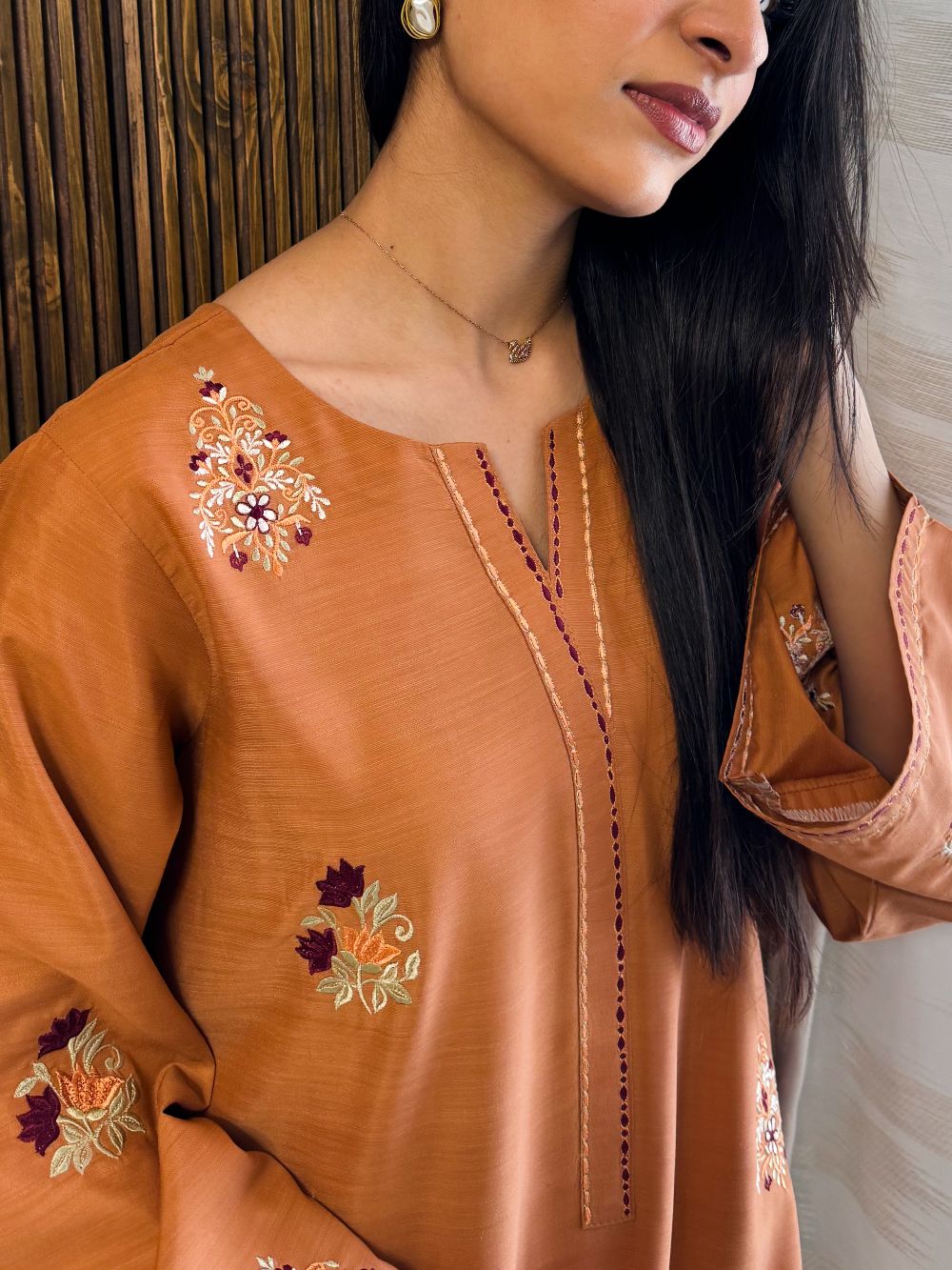 A warm rust-colored ensemble featuring intricate motifs and contrasting embroidery on the chawk and daman. The detailed embroidery adds depth and richness, creating a sophisticated festive look. Perfectly designed for Eid or special occasions, this outfit blends traditional craftsmanship with contemporary elegance, making it a timeless addition to your wardrobe.