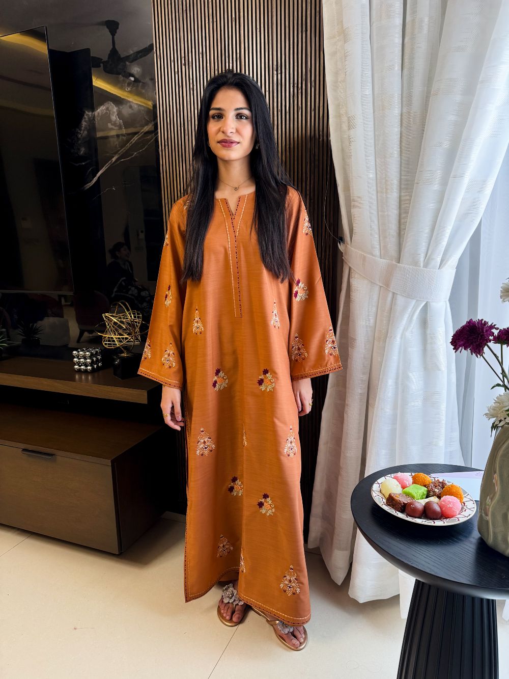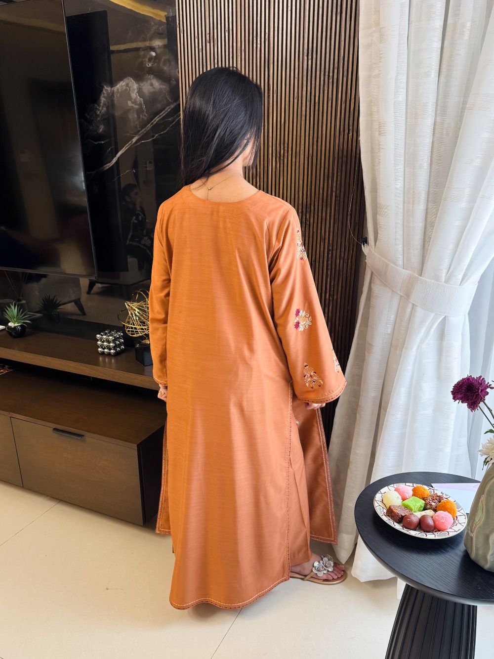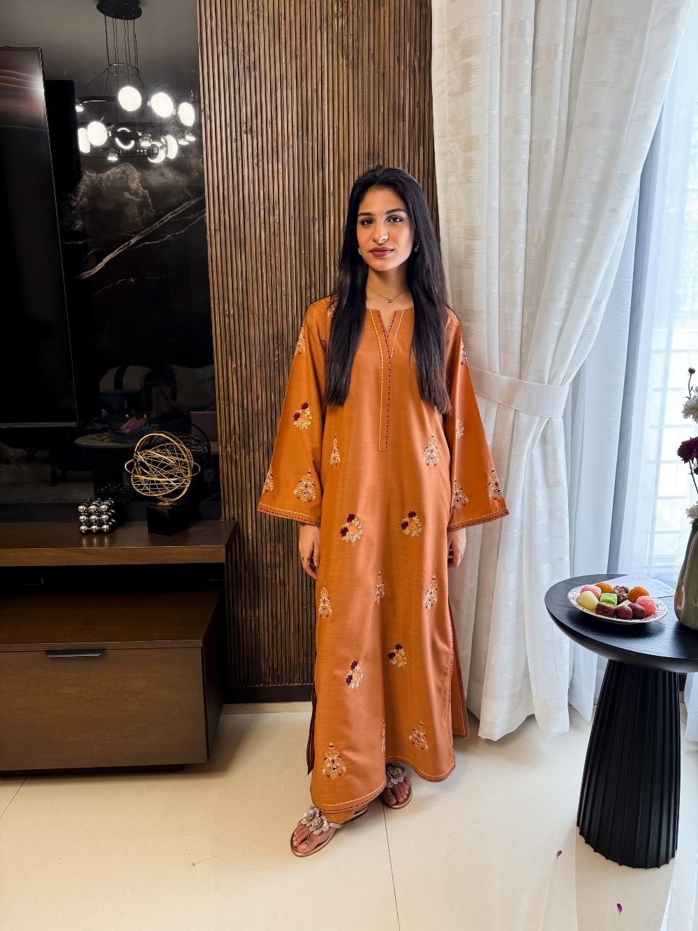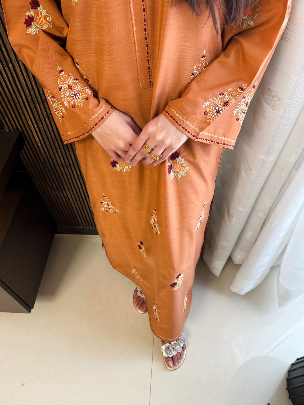 A warm rust-colored ensemble featuring intricate motifs and contrasting embroidery on the chawk and daman. The detailed embroidery adds depth and richness, creating a sophisticated festive look. Perfectly designed for Eid or special occasions, this outfit blends traditional craftsmanship with contemporary elegance, making it a timeless addition to your wardrobe.