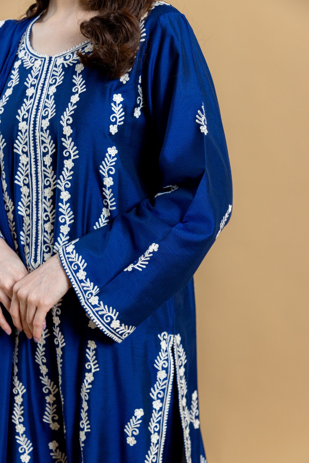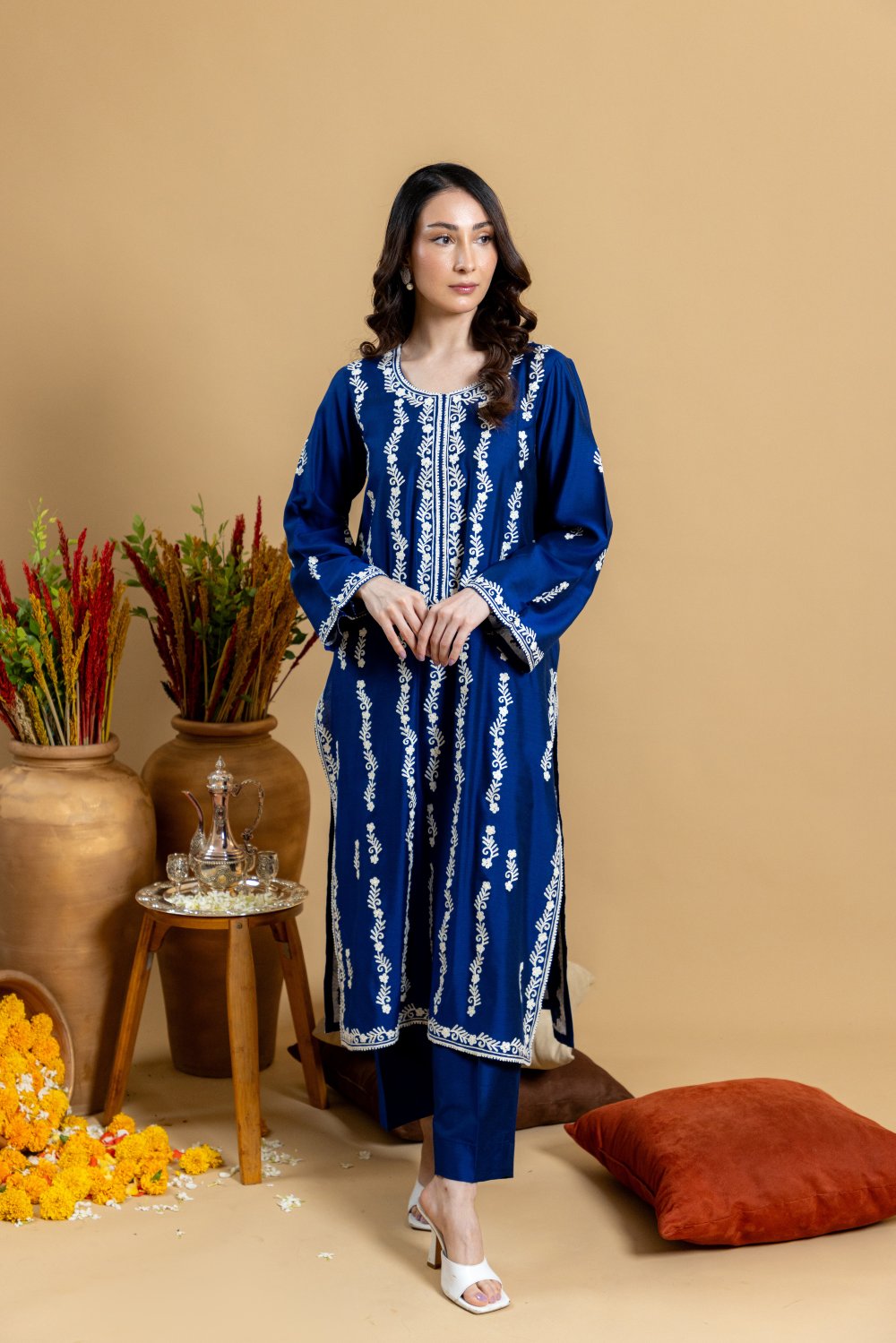 This navy blue 3-piece outfit in soft viscose silk showcases fine ari work on the shirt, paired with a trouser and lace-trimmed dupatta perfect for graceful, statement-making looks.