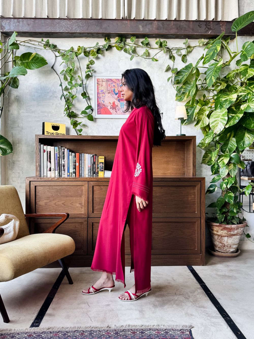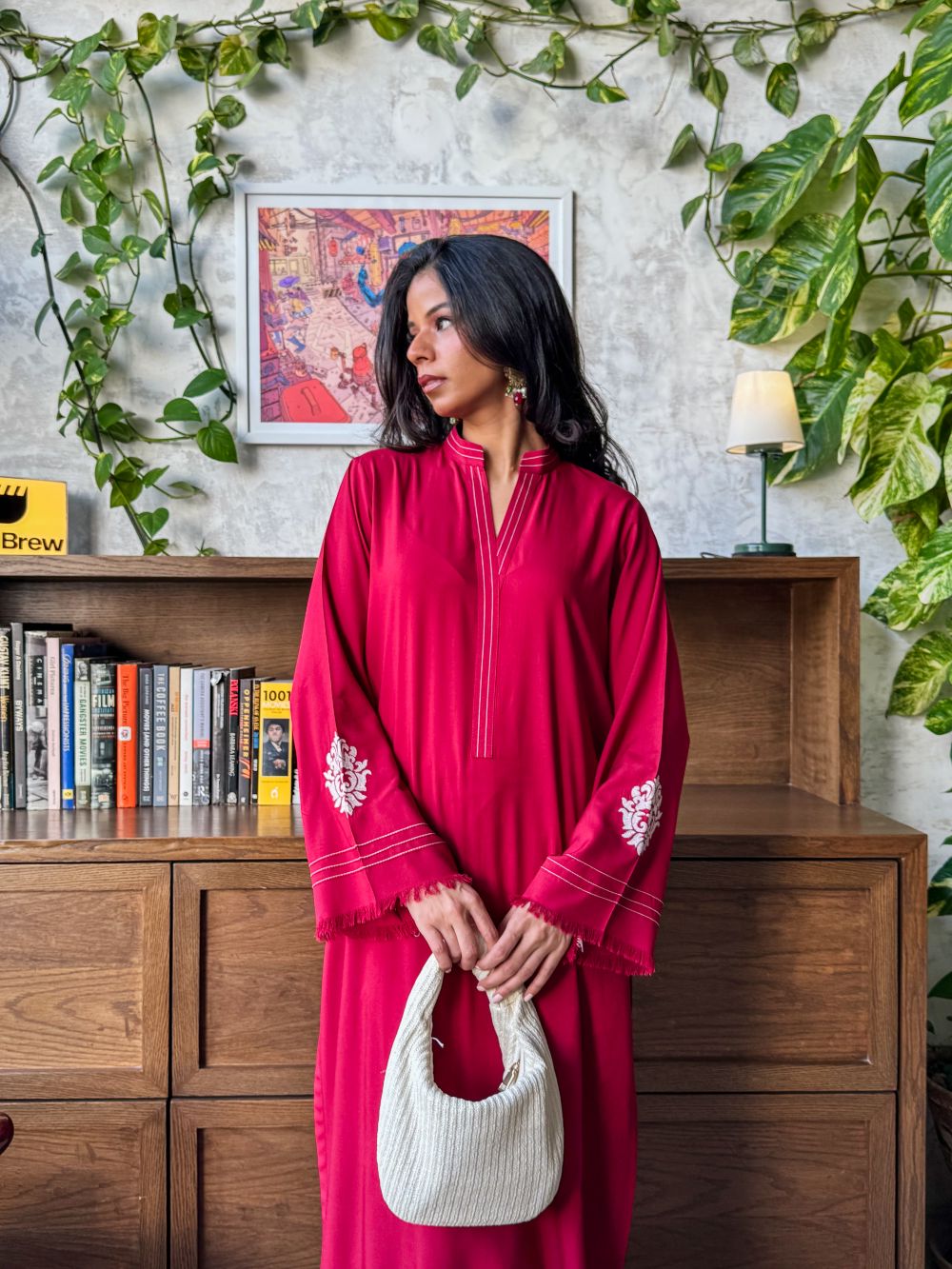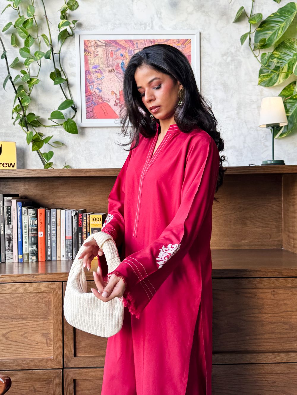 Red Long shirt embellished with ivory embroidery on the sleeves and a statement motif on the back. The neckline features delicate running stitch detailing, while thread accents on the daman add a handcrafted touch. Paired with straight pants, this ensemble is perfect for your everyday look.