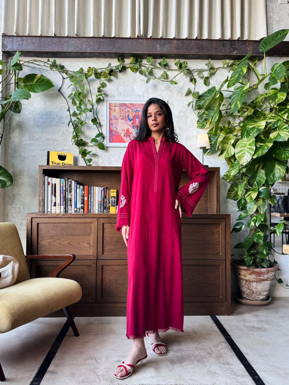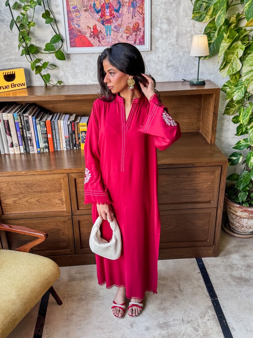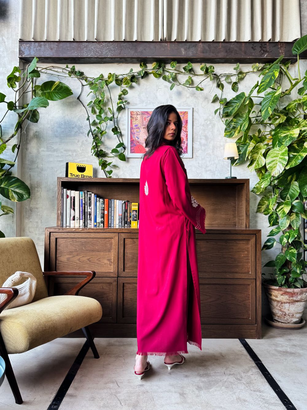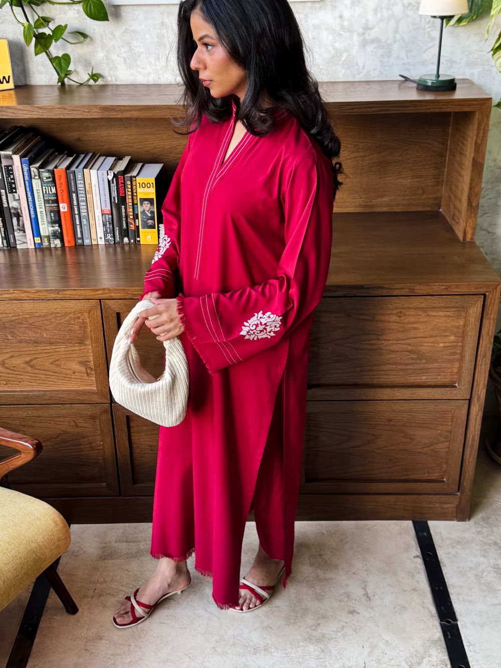 Red Long shirt embellished with ivory embroidery on the sleeves and a statement motif on the back. The neckline features delicate running stitch detailing, while thread accents on the daman add a handcrafted touch. Paired with straight pants, this ensemble is perfect for your everyday look.