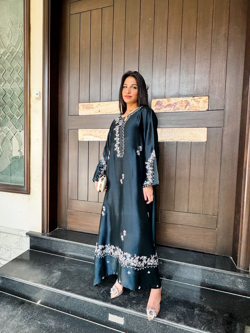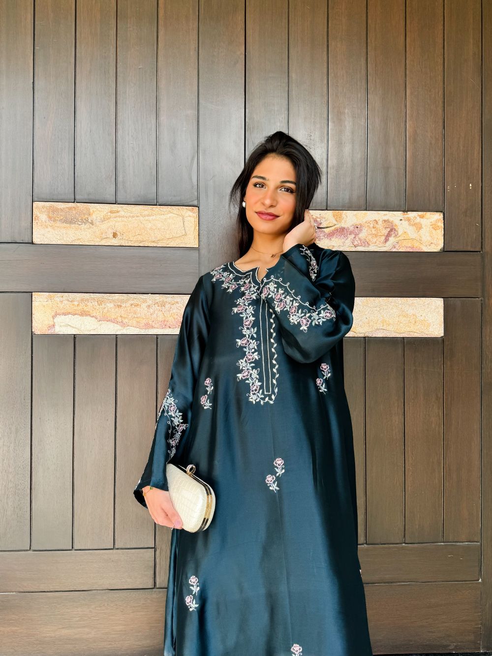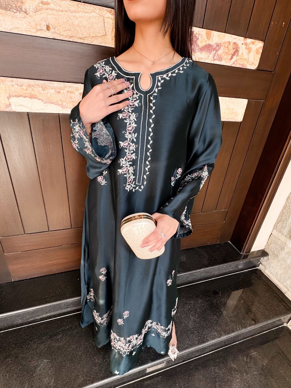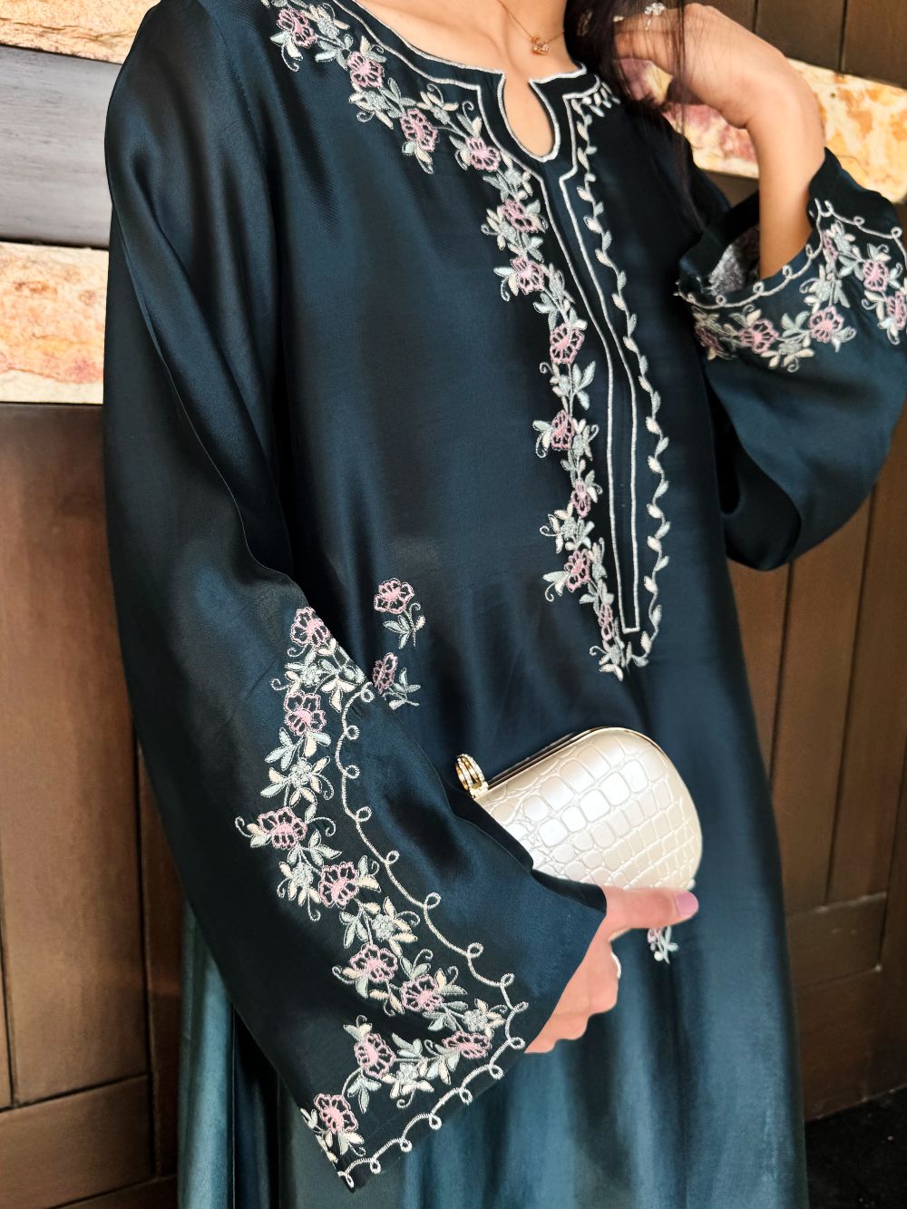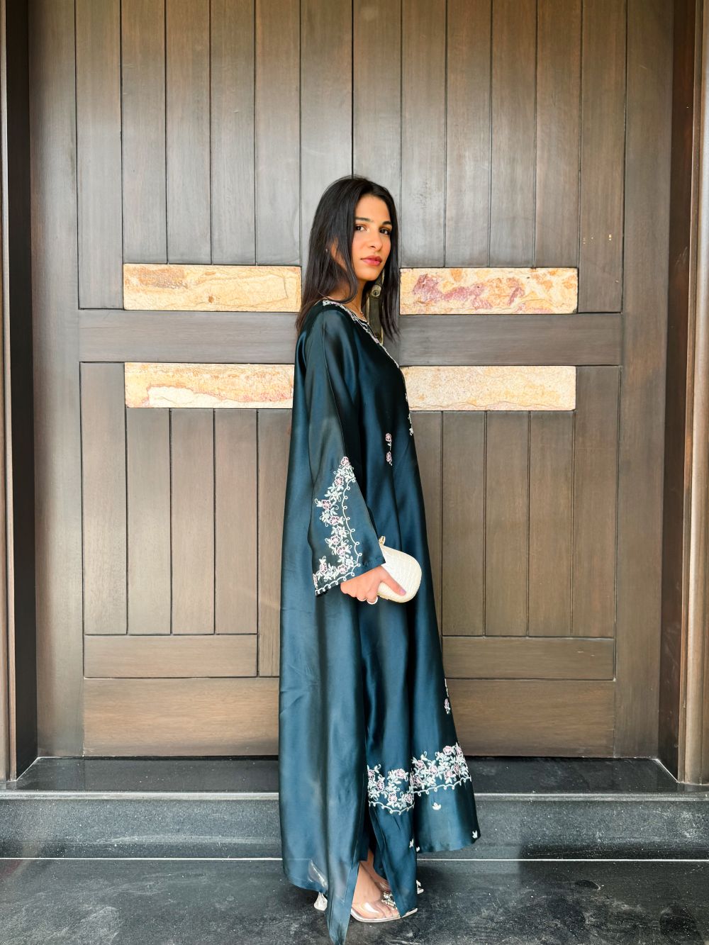 A stunning ocean blue kaftan adorned with delicate pastel and silver zari embroidery, featuring intricate motifs across the neckline, daman, and overall body. The shimmering zari adds a touch of regal elegance, while the flowing silhouette exudes grace and sophistication. Perfect for festive occasions, weddings, or Eid celebrations, this kaftan combines timeless charm with modern luxury.