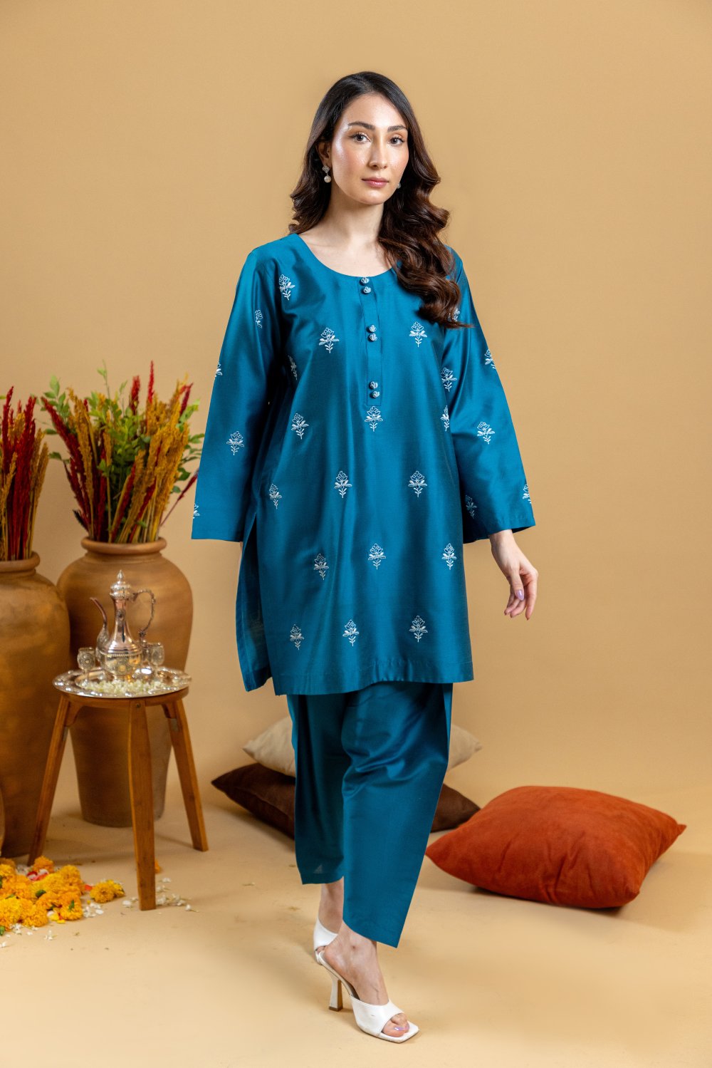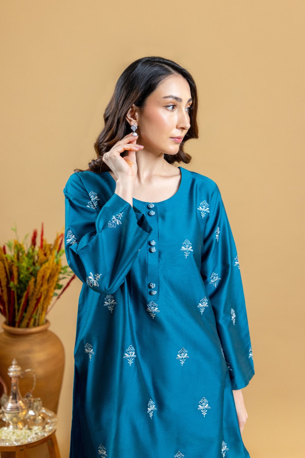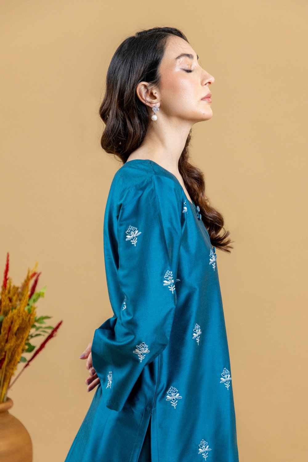 This teal blue soft viscose silk 3-piece set includes an embroidered boti shirt with fine button detailing, paired with a coordinating skinny shalwar and pure organza dupatta. A timeless piece for effortless elegance.