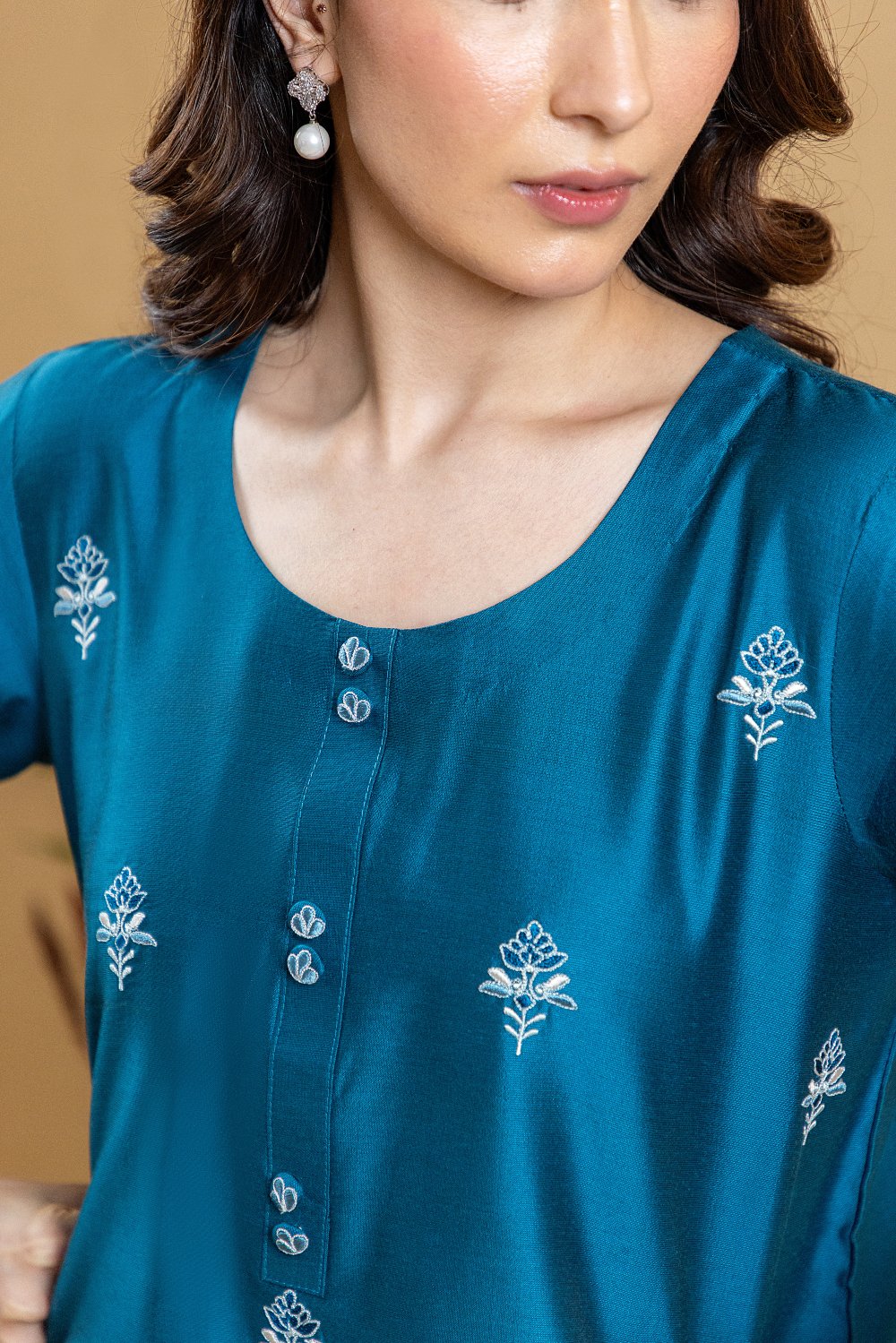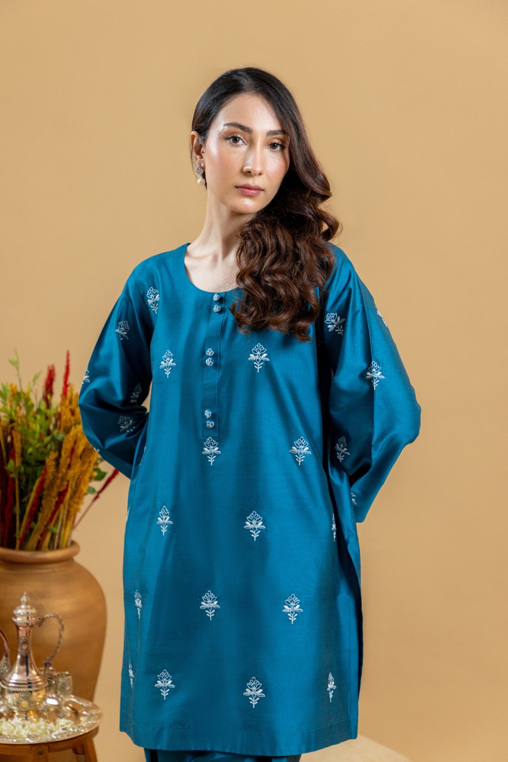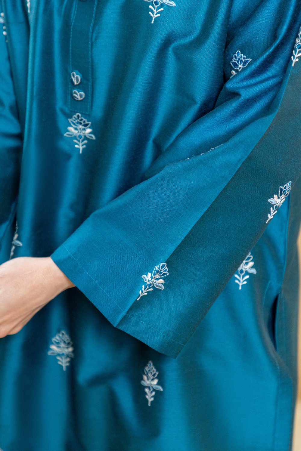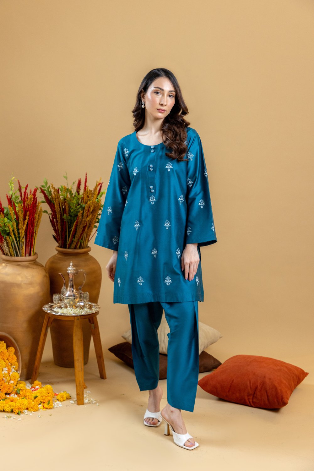 This teal blue soft viscose silk 3-piece set includes an embroidered boti shirt with fine button detailing, paired with a coordinating skinny shalwar and pure organza dupatta. A timeless piece for effortless elegance.
