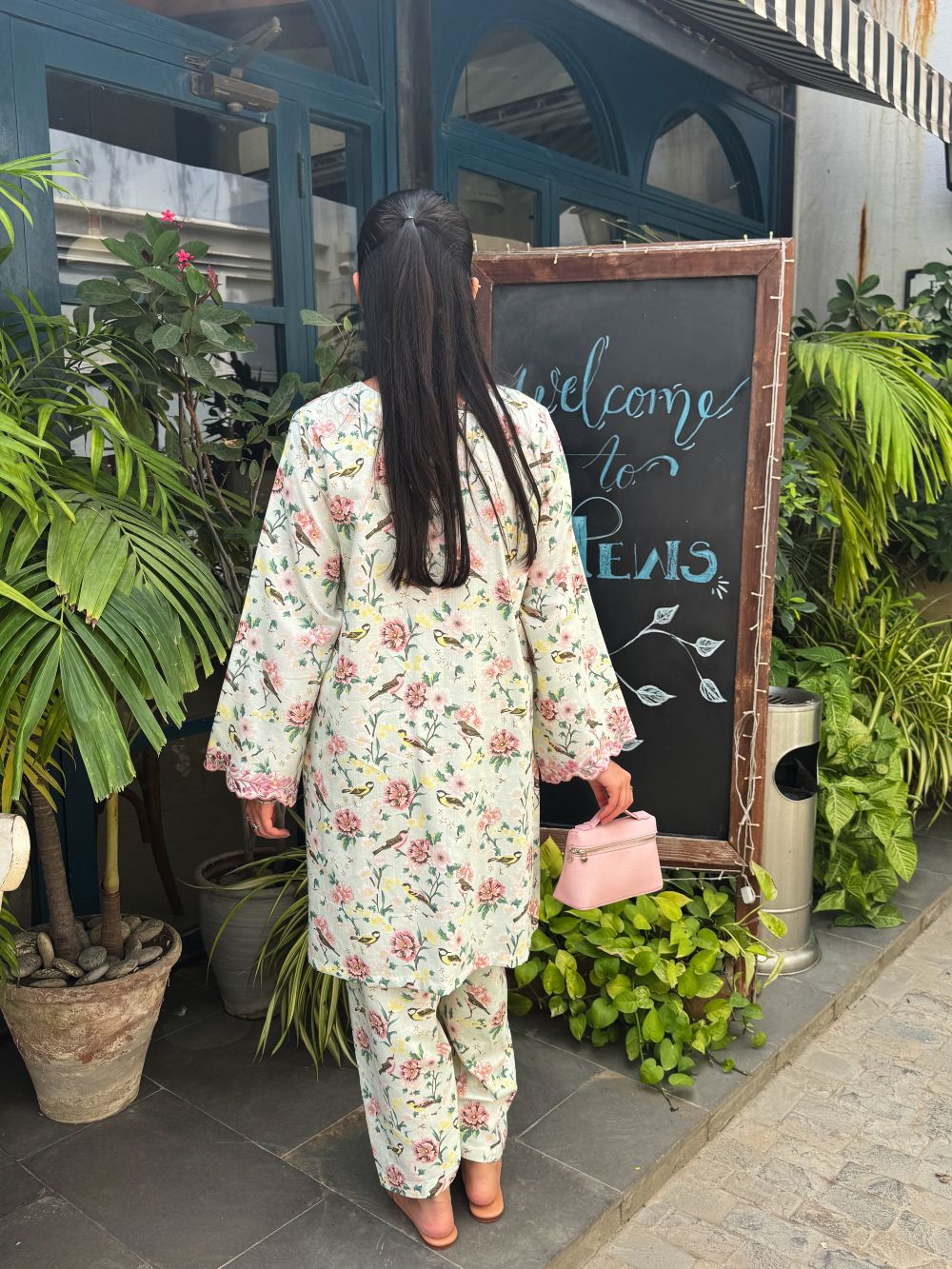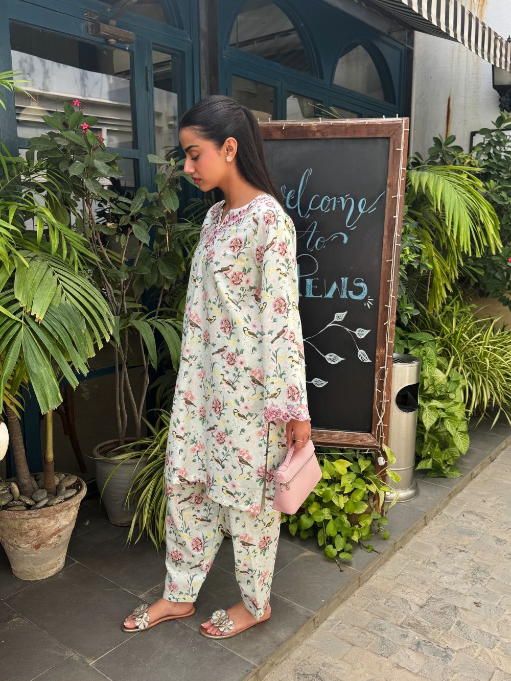 Embrace timeless charm with this printed 2pc, styled with a short shirt and skinny shalwar. The embroidered sleeves and neckline bring a refined finish for a graceful everyday look.