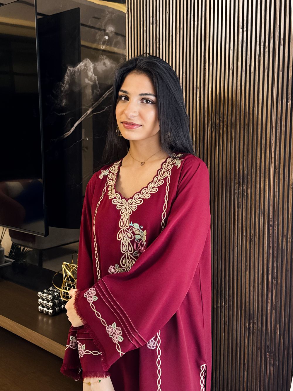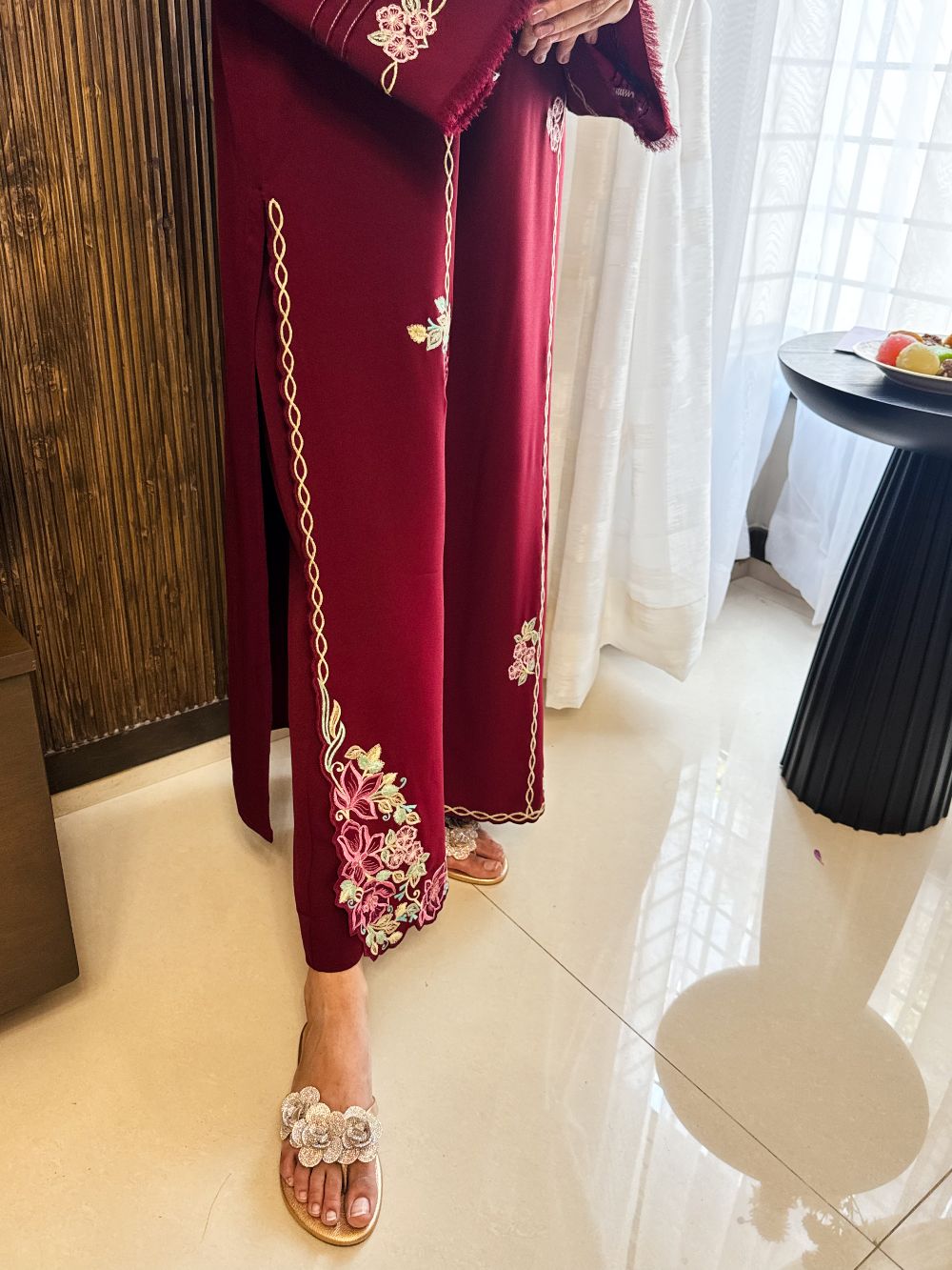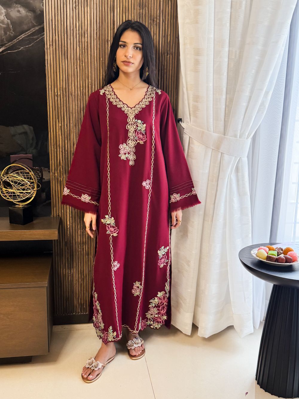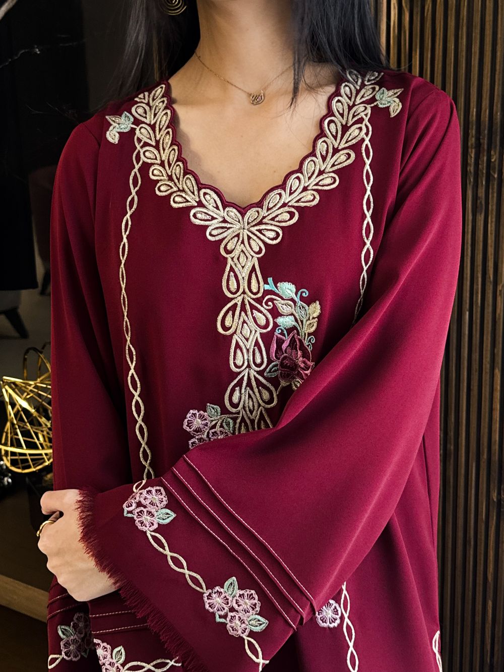 A rich maroon shirt beautifully adorned with delicate pink and light mint embroidery, enhanced with subtle zari detailing on the neckline. The intricate threadwork adds a graceful contrast against the deep maroon base, creating a refined and festive look. Perfect for Eid celebrations or special gatherings, this ensemble blends traditional craftsmanship with timeless elegance for a sophisticated statement.